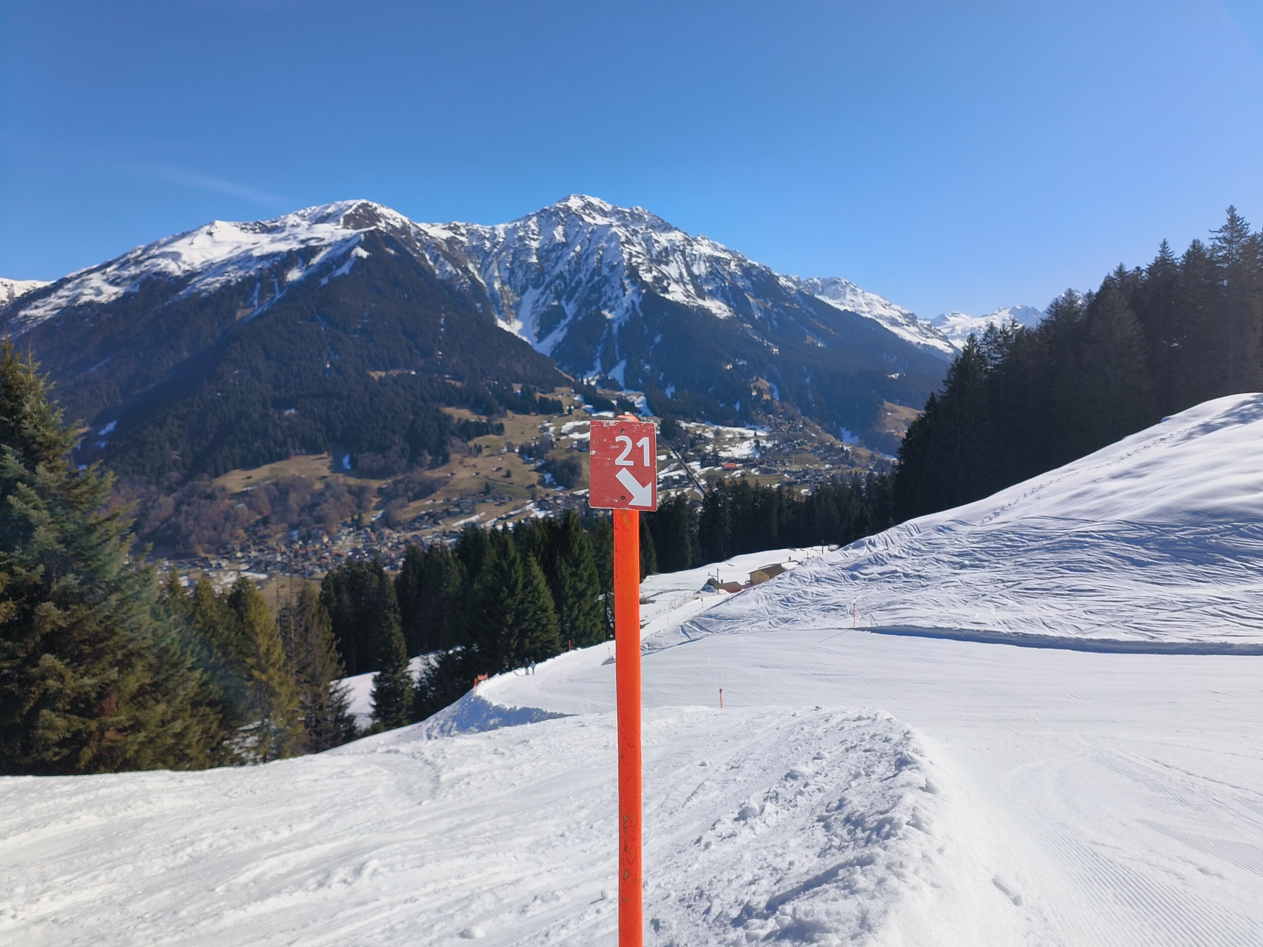Vom Ende der Dorfabfahrt ist der Bahnhof Dorf näher als die Talstation der Parsennbahn, was sich für einen Wechsel zum Jakobshorn ...
