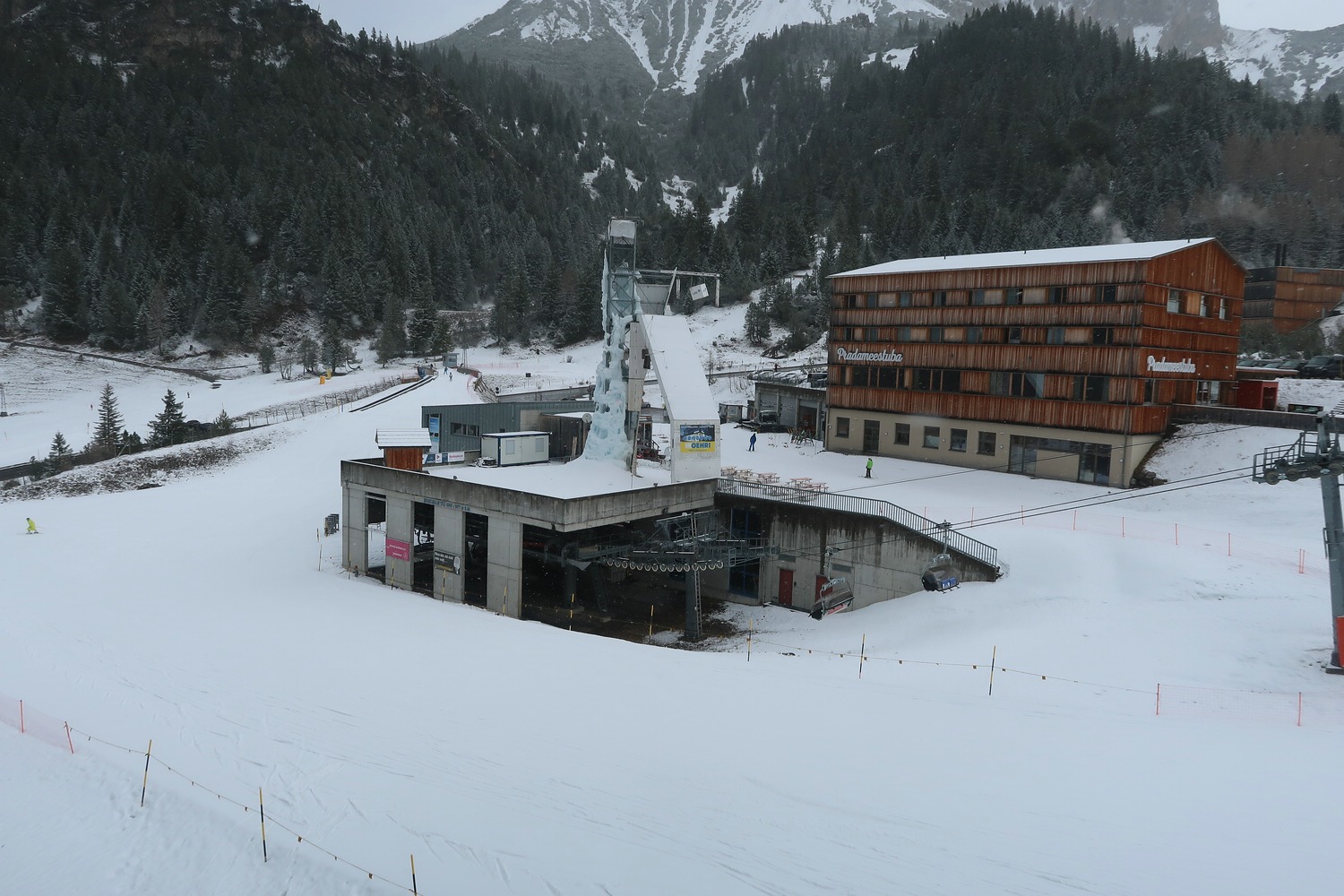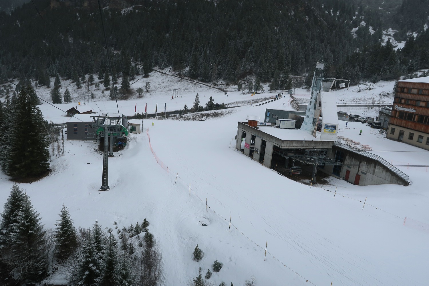 Die Seite Täli/Hochegg war komplett mit allen Pisten geöffnet - die unbeschneiten Pisten ganz außen 7, 8, 2 aber schon teils ziemlich grenzwertig. Weiter unten gibt es ein Video, in dem man die Verhältnisse der roten Abfahrt 7 ganz gut sehen kann.