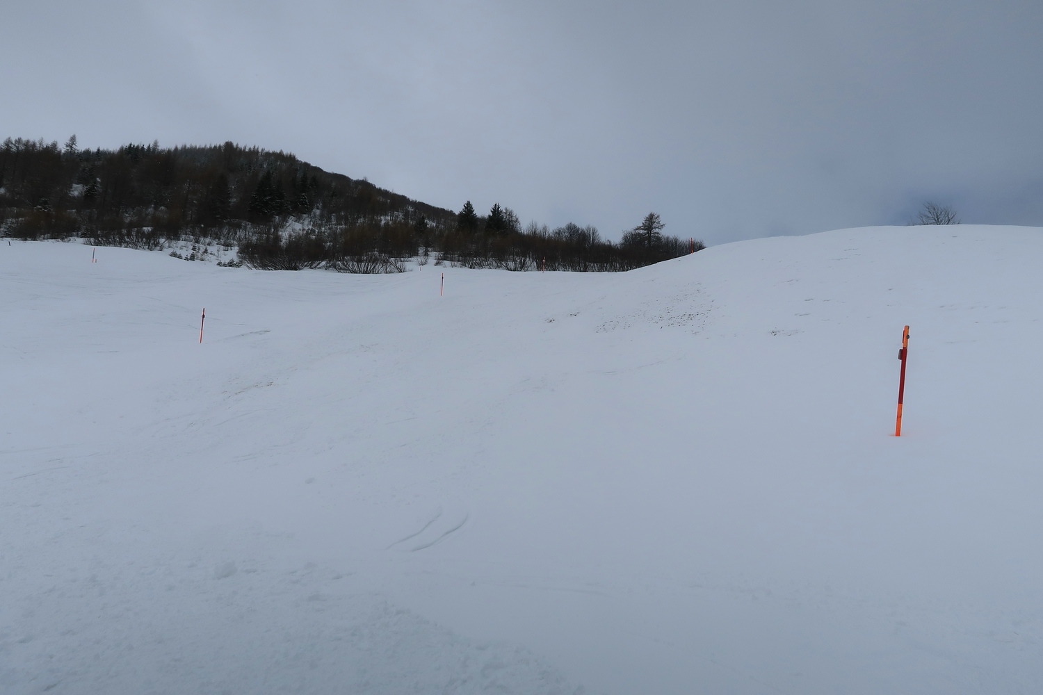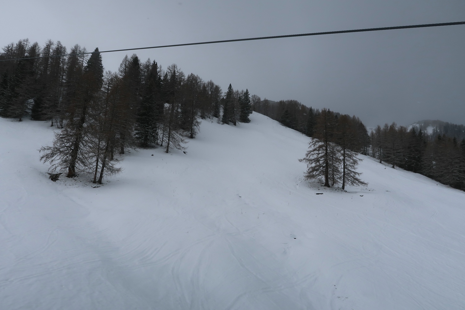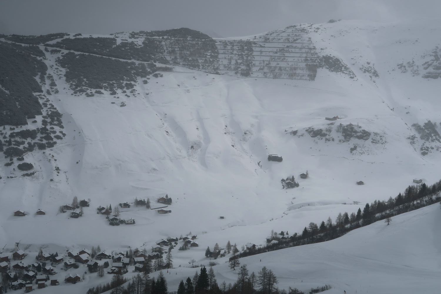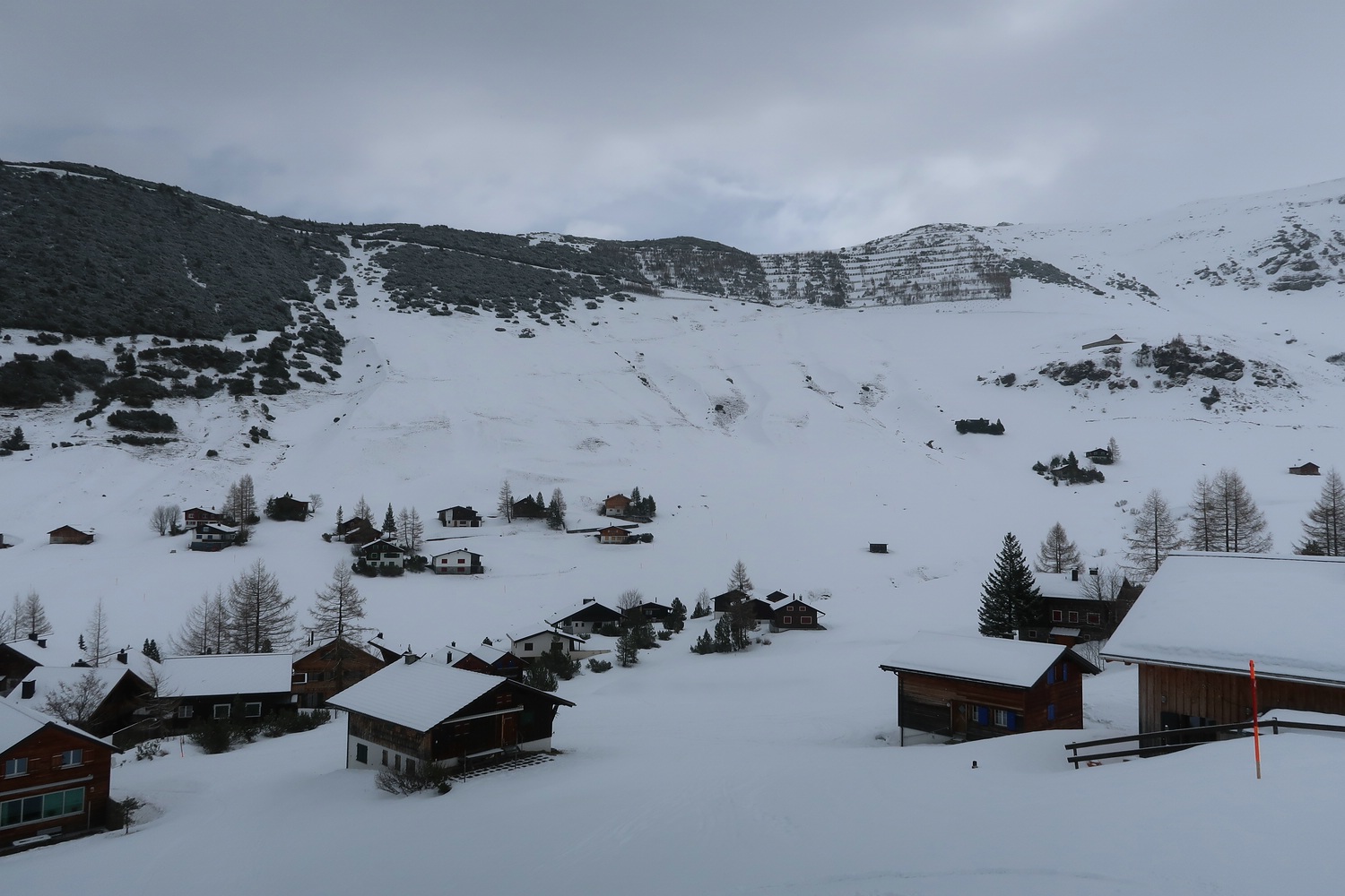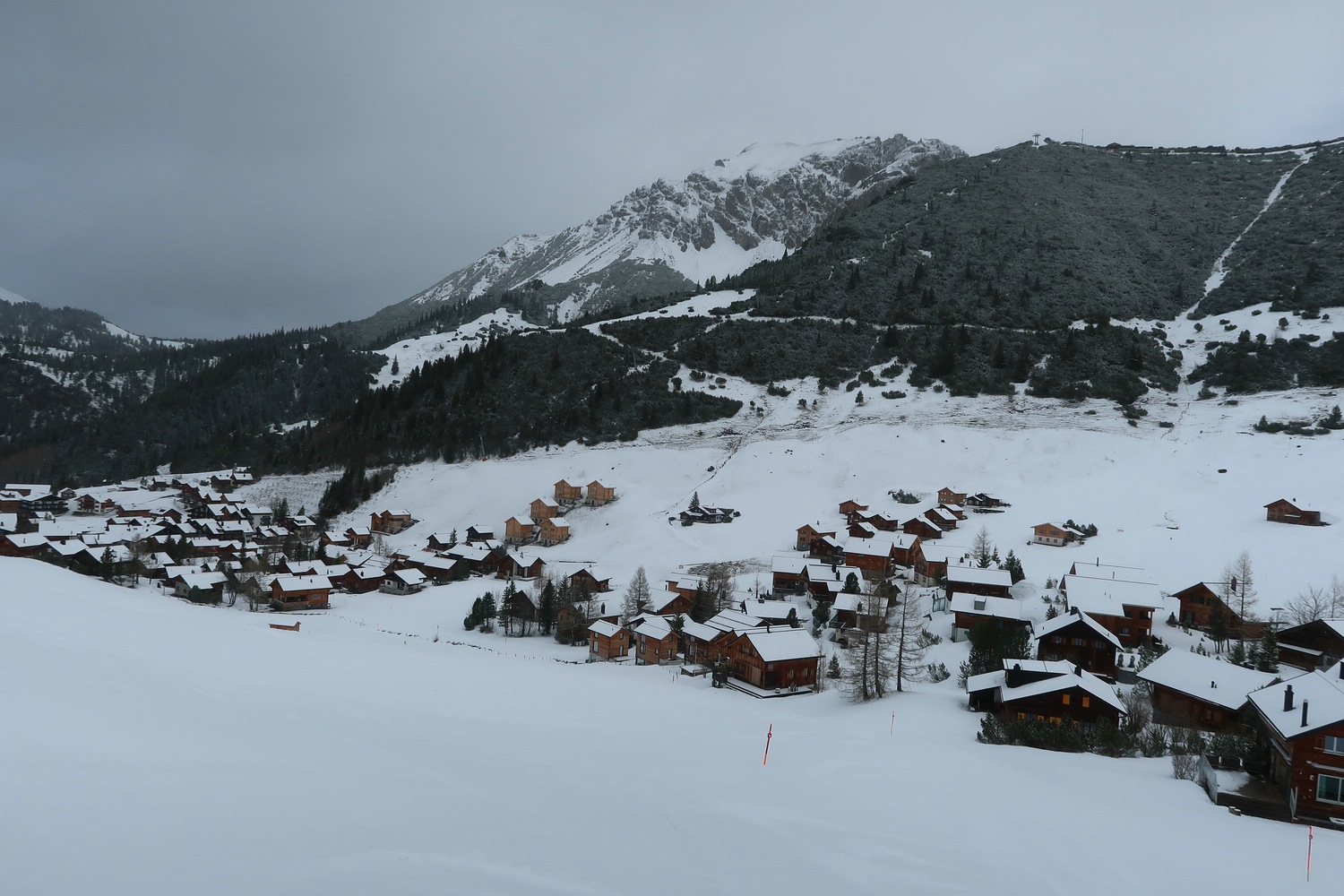 ^^ #7 - Blick Richtung Ort und anderer Skigebietsseite mit Abfahrten 10, 11 & 12, welche leider alle nicht offen waren. Weiter im Vordergrund erkennt man noch schwach die blauen Abfahrten 2 (Haita) und an der Hütte vorbei die blaue 1 (Täli)