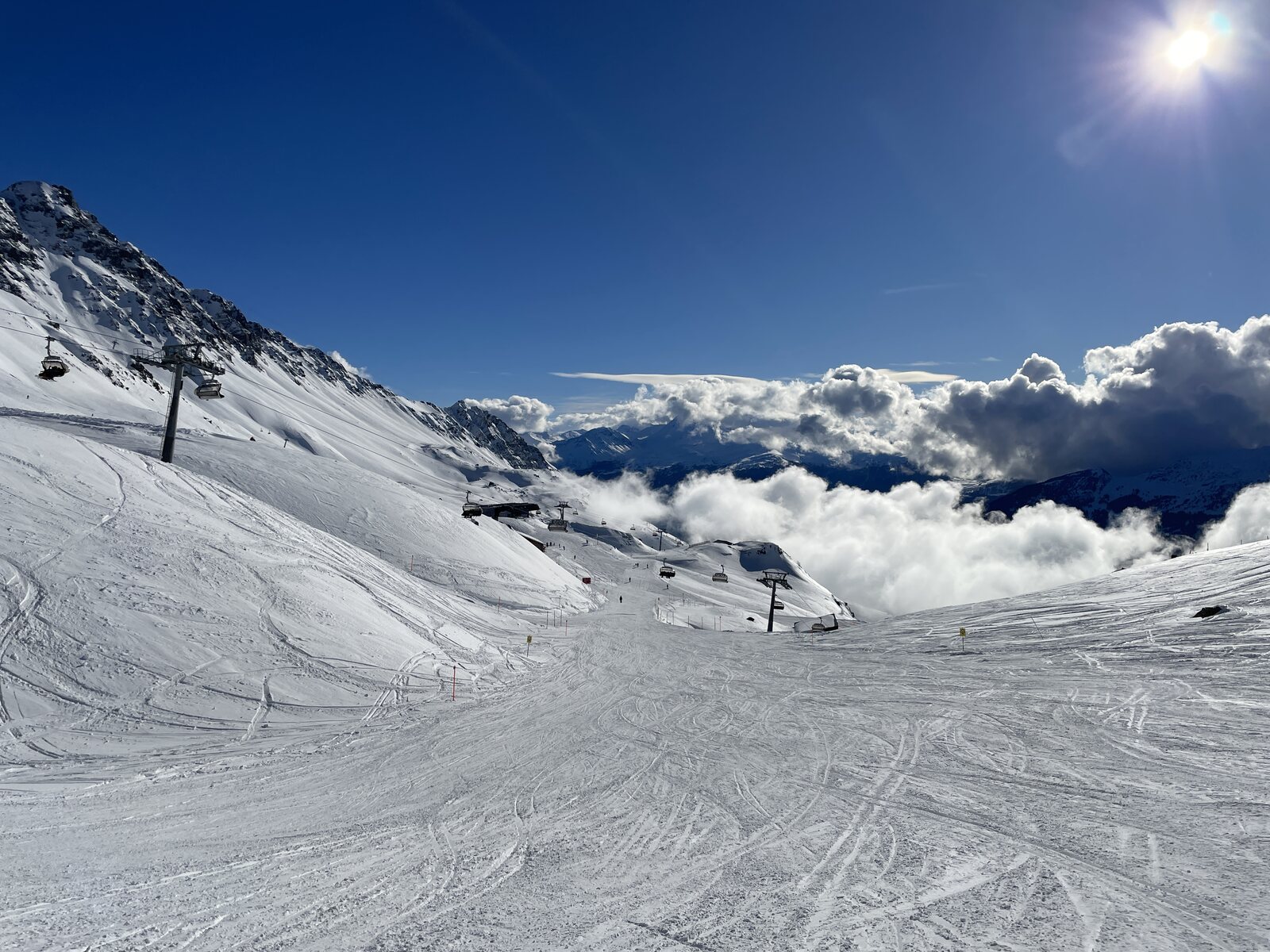 Nach der morgendlichen Warterei auf der Samnauner Seite, bis weitere Lifte öffneten, gelang uns etwas, das ich noch nie geschafft hatte: den allerersten Sessel der Flimsattelbahn zu erwischen. Folglich durften wir auch die Piste 10 zur Idalp erstbefahren, da die Flimjochbahn später in Betrieb genommen wurde.