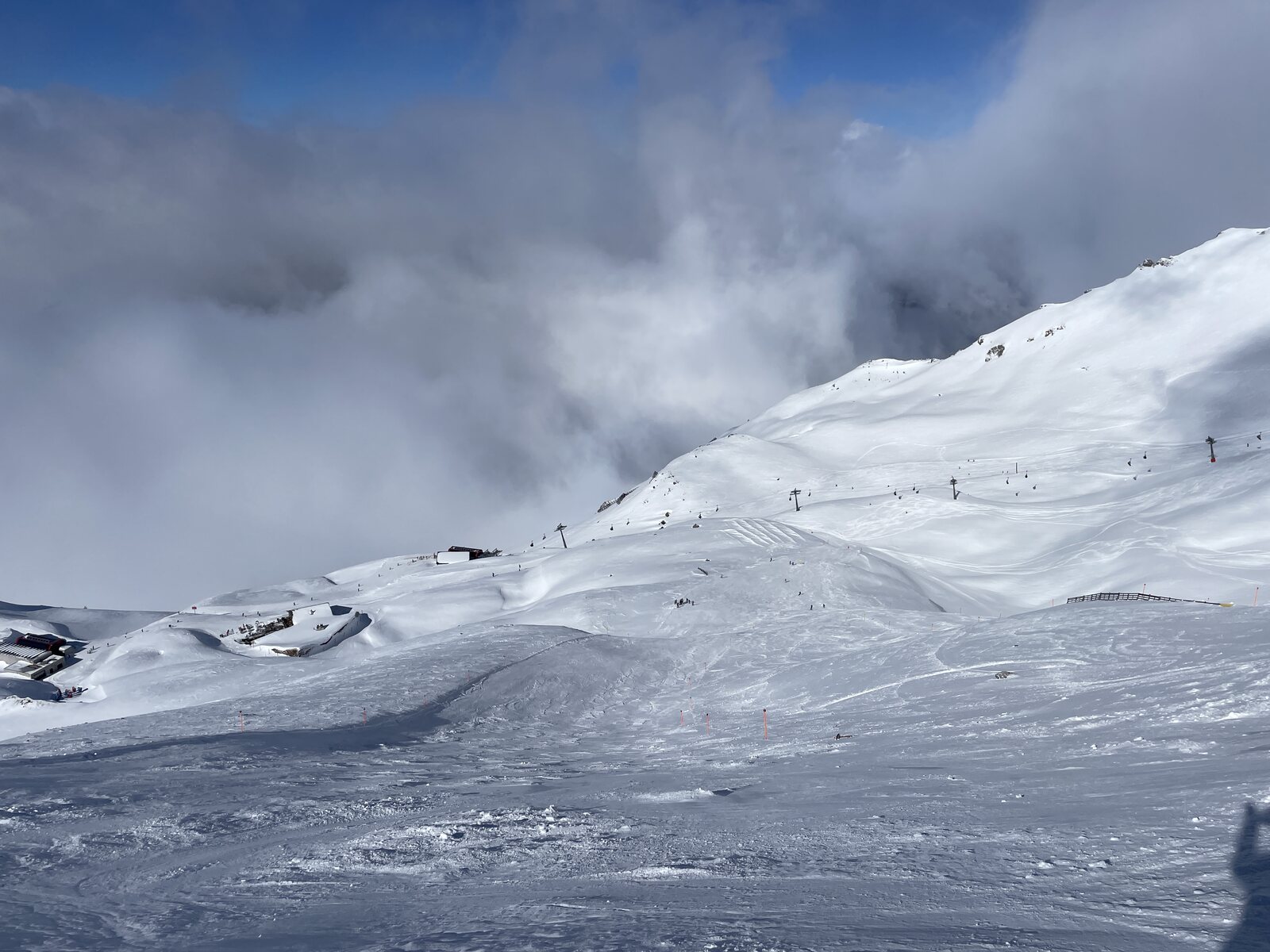 Um etwa 11 Uhr wechselten wir zurück auf die Ostseite, wo die Pisten noch überraschend hart und gut zu fahren waren. Der Andrang war äusserst überschaubar. Aber: Die Präparation war stellenweise wirklich grausig.