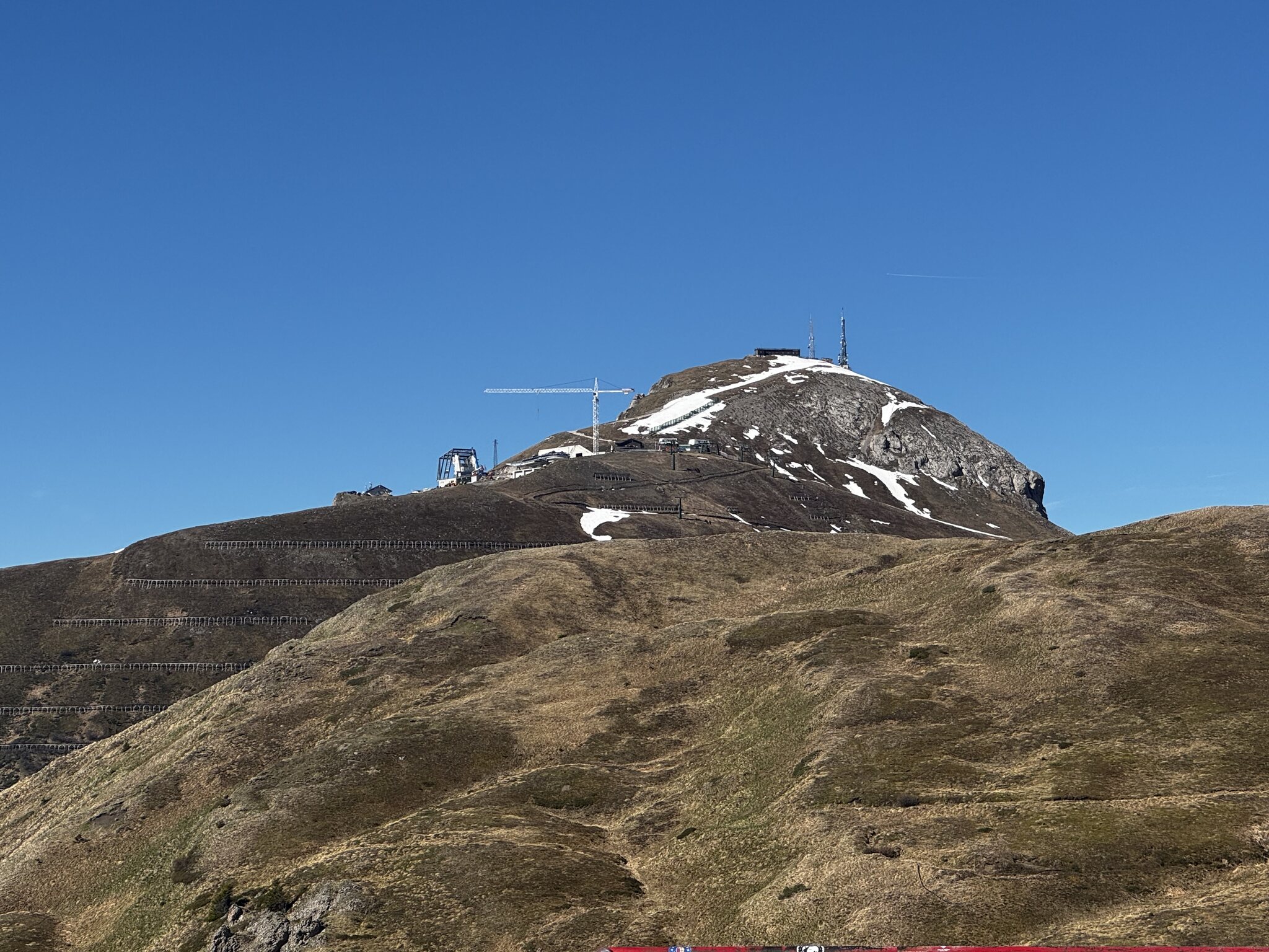 Das Bild habe ich eher für die Aussicht gemacht, aber man sieht auch die Strecke: Die Einfahrtsstütze vor der Bergstation ist schon spektakulär: