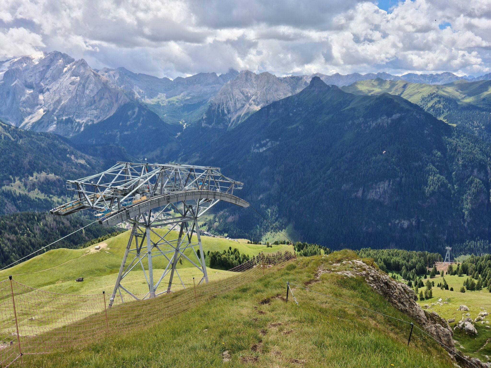 Die neue 3S zum Col Rodella nimmt Formen an, das erste Tragseil wird gezogen. Es folgen 2 Bilder.