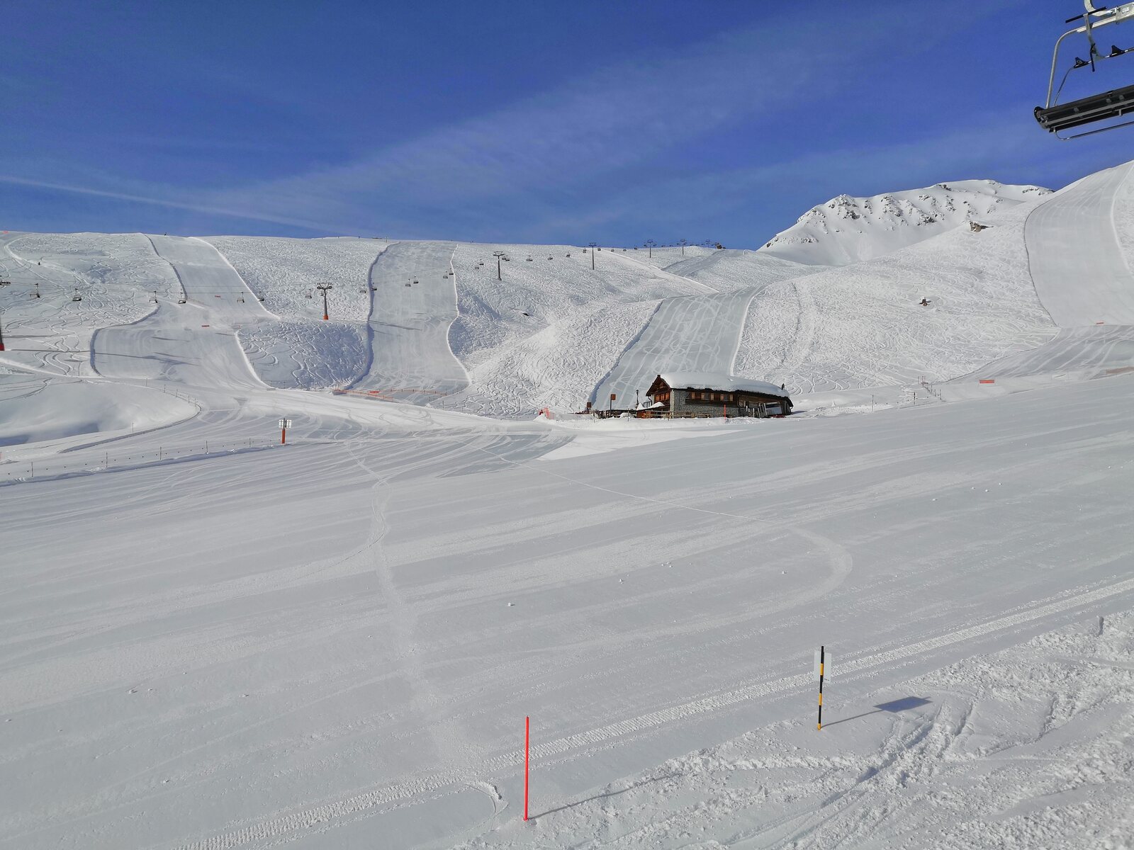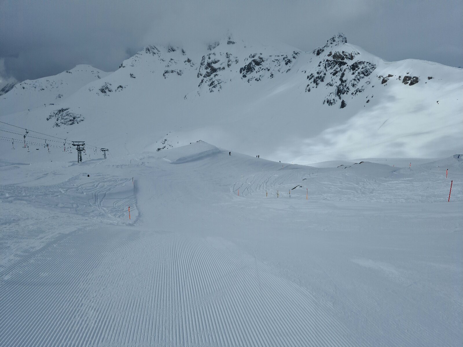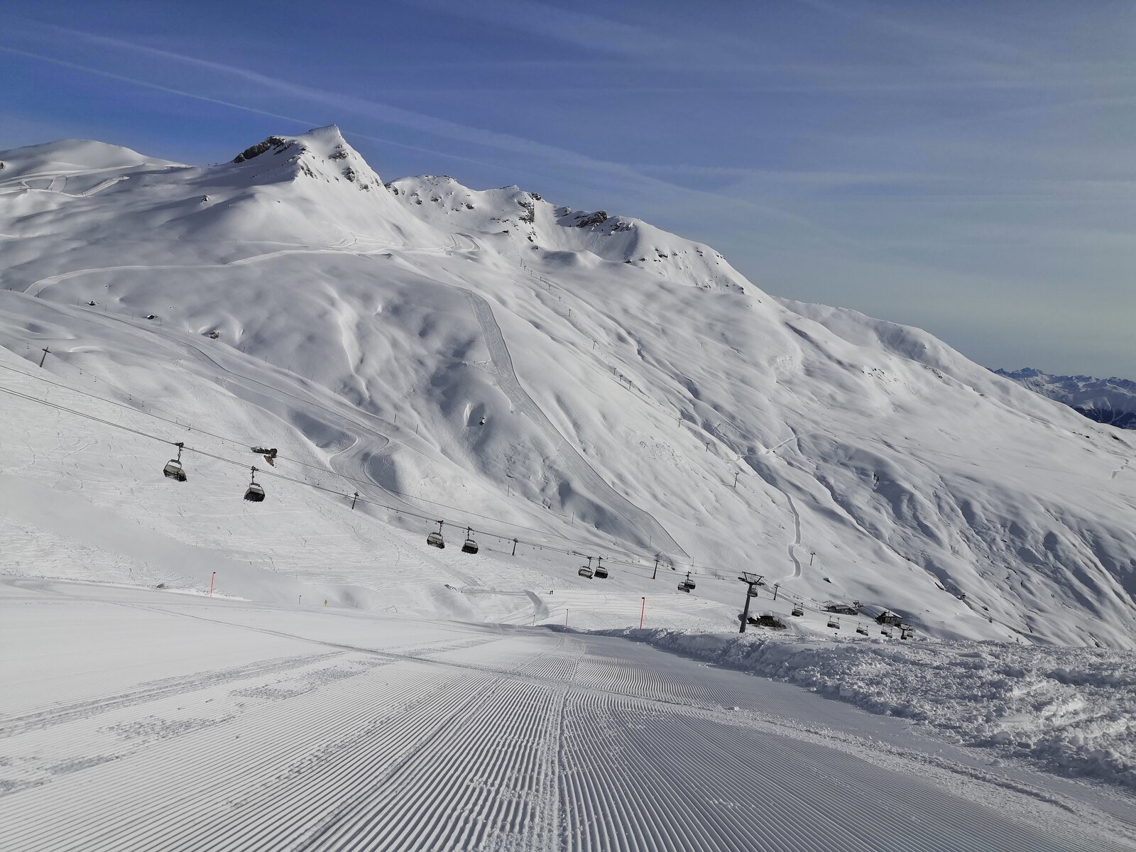 Die Pisten waren am Morgen in einem sehr guten Zustand, es hatte im Vergleich zu letztem Jahr genügend Schnee. Pisten alle sehr griffig mit Pulver-Riffel. Auch am Nachmittag haben die Pisten weitgehend gehalten bis auf ein paar neuralgische Stellen mit Buckeln.