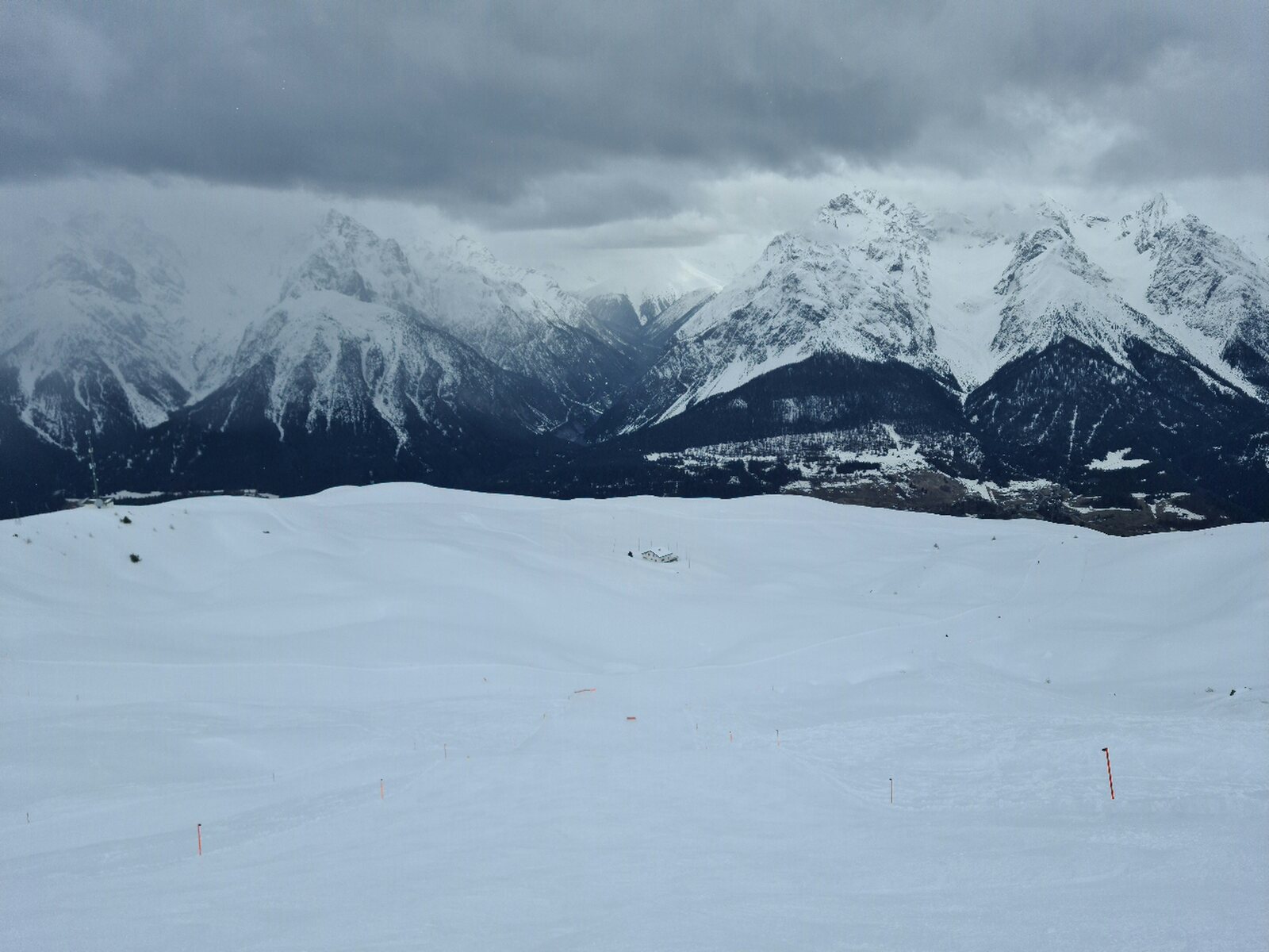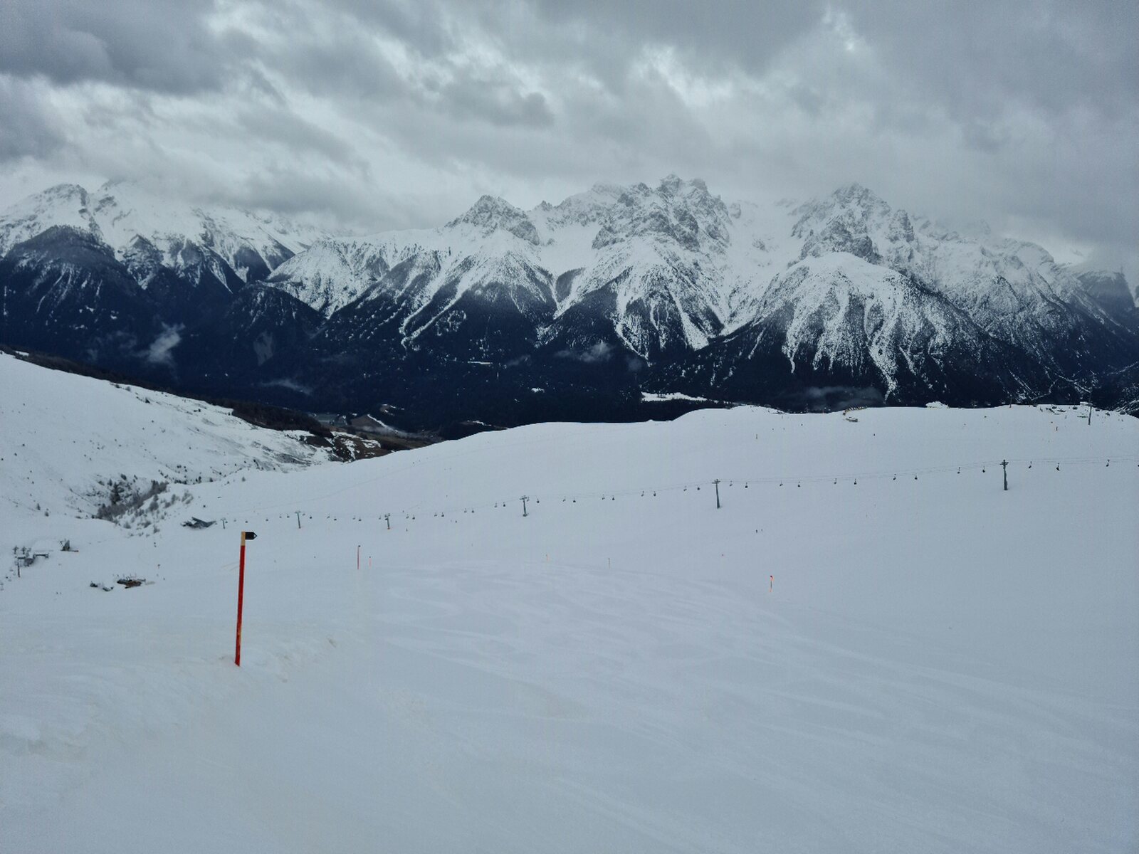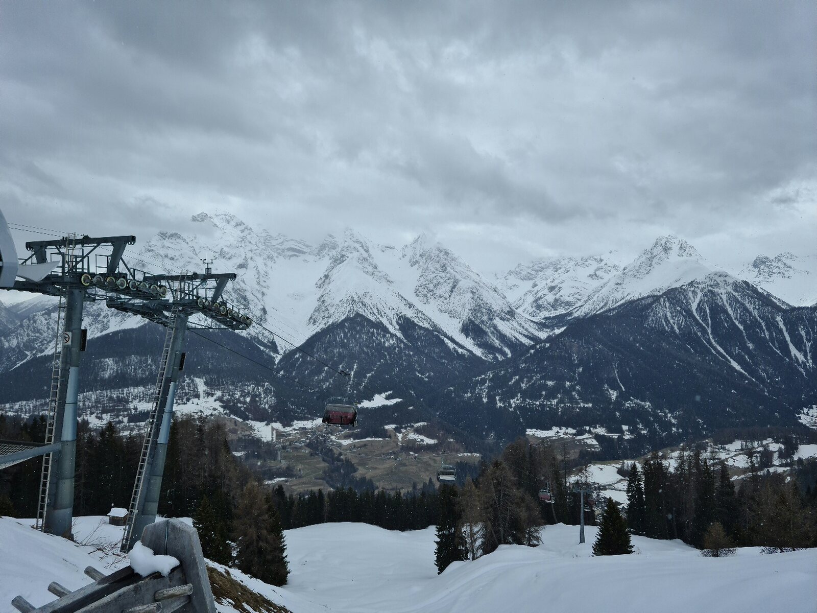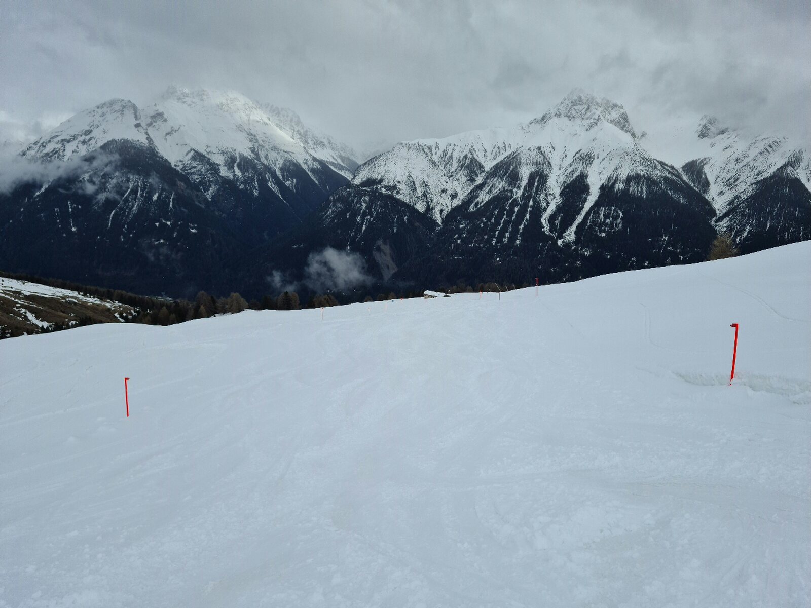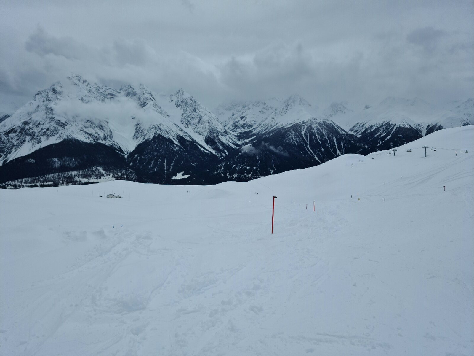 Bilder: #1- Start an der Sesselbahn Schlivèra. Das Wetter war noch unbeständig. #2- Am Clünas-Sessel gab es dann frische Rillen. #3- Aufgrund der nervigen Zaunkonstruktion mitten auf der Piste sind die roten am Clünas für Wiederholungsfahrten m.E. unbrauchbar.