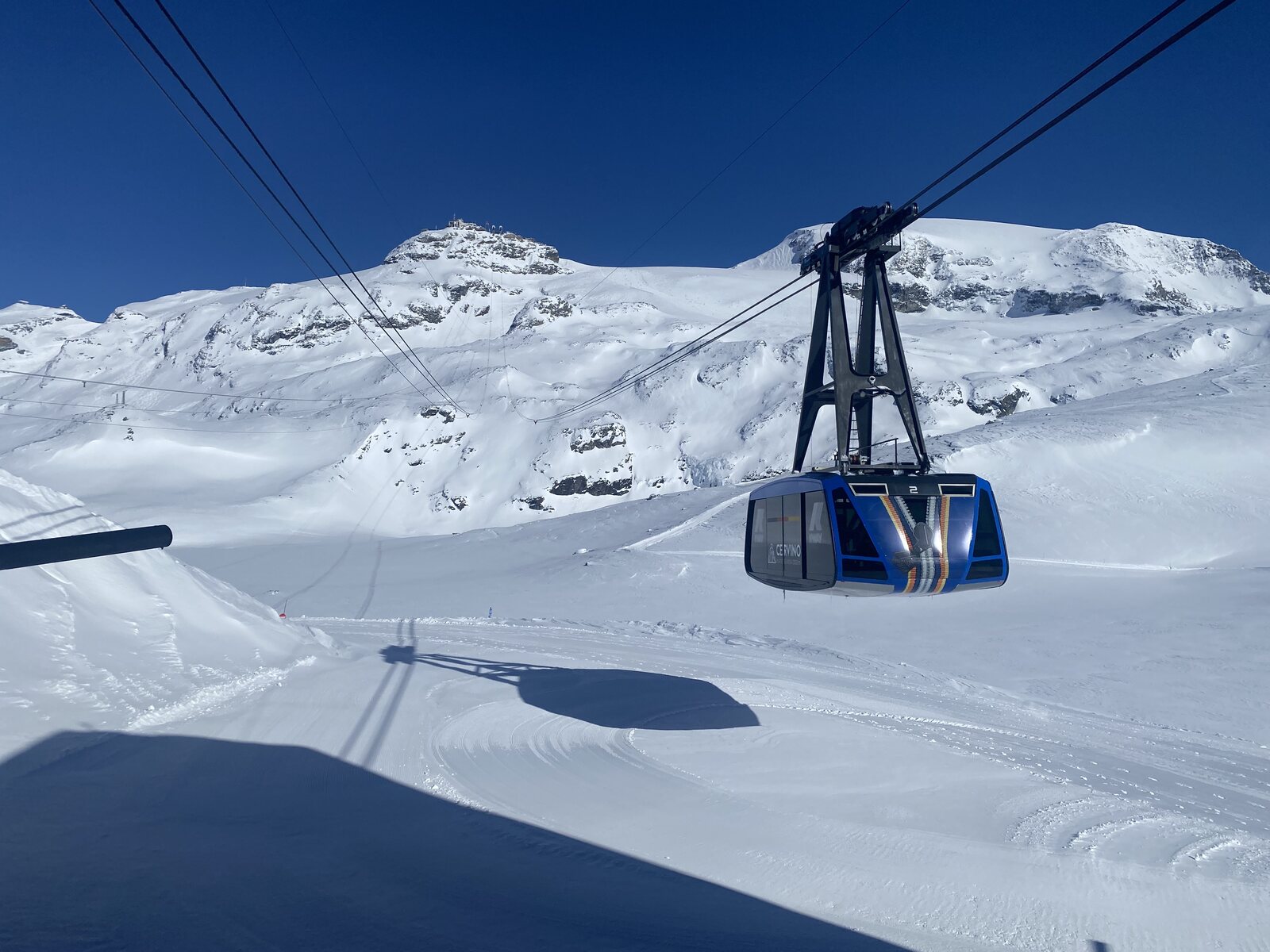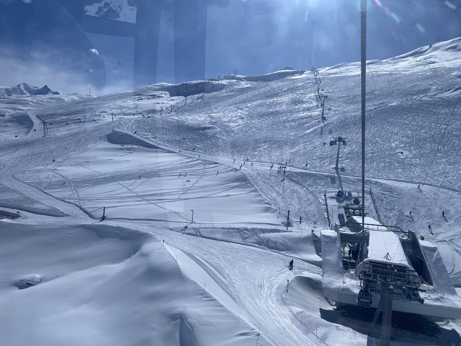 Die ersten Fahrten am Theodulexpress und Furggsattel waren top. Schnell wurde es aber zerfahren und bucklig. Es hatte einfach zu viele Leute für die wenigen Pisten: Ein Blick aus der Gondel Richtung Trockener Steg. Die Schneelage ist gut: