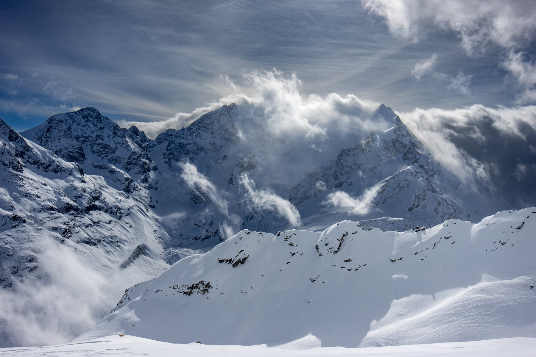 Am Morgen ging es direkt auf den Gipfel. Schönes Wolkenspiel an der Berninagruppe.