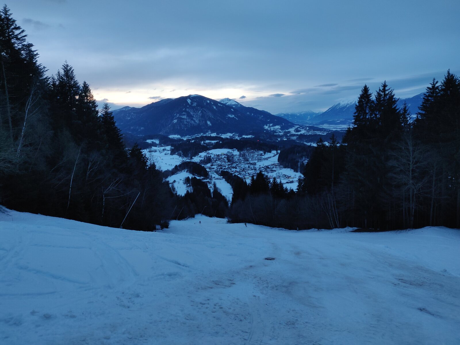 ^ Es ist schon etwas spät. Jetzt geht es wieder hinunter. Etwas links der Bildmitte die Bergstation der KSB und rechts dahinter der Hahnenwipfel, wo der gleichnamige Schlepplift raufgeht.