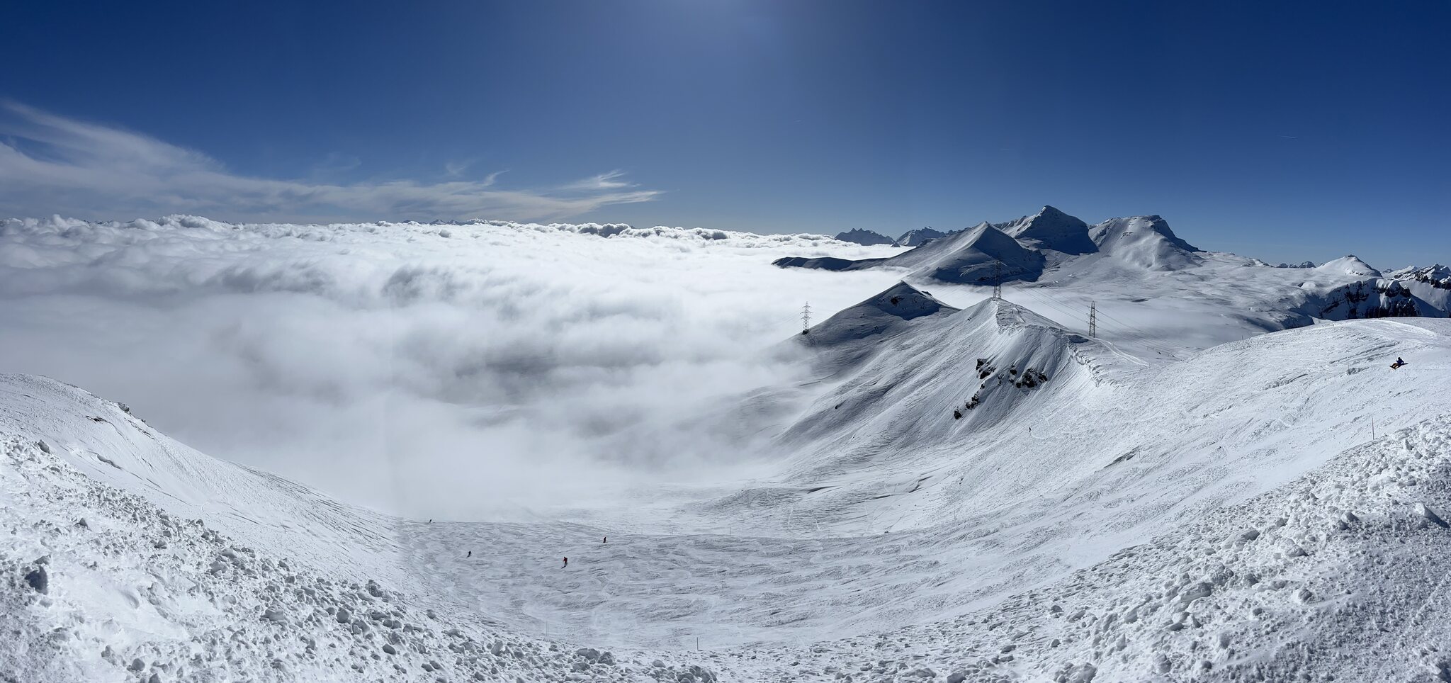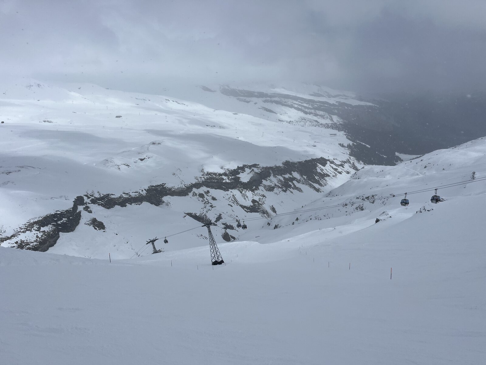 Die Pisten waren unterhalb ca. 1800m von Beginn weg sulzig, teils sehr schwer, darüber sehr gut. Das Wetter wechselhaft aber fast stets mit guter Sicht. Mit 6700 Leuten namentlich für einen Sonntag ziemlich wenig los.