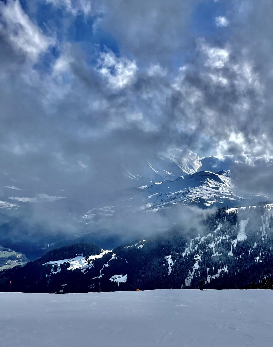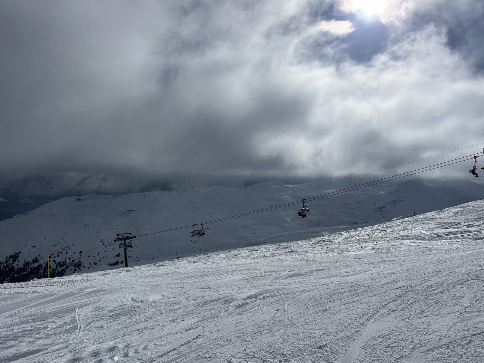 Kurzzeitiger White-Out auf der 14 die bis zum Curnius tipptopp war Es werde wieder Sicht 12:30 gerade voll ist es nicht Update 14:00 Uhr, jetzt ist es wirklich Privat-Skifahren. Die Pisten werden weich und die Buckel immer grösser Offpist geht aber noch was