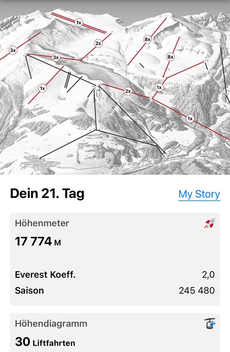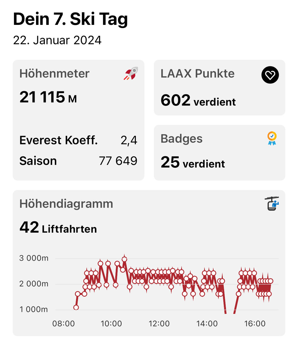 Heute war ein recht guter Tag, man wusste ja nicht so richtig, was einem erwartet (Wind? Wolken? Niederschlag?). Immerhin wurden es auch 15‘700 Höhenmeter und mit Platz 7 gab es wieder einige Laax-Punkte für Konsumationen.