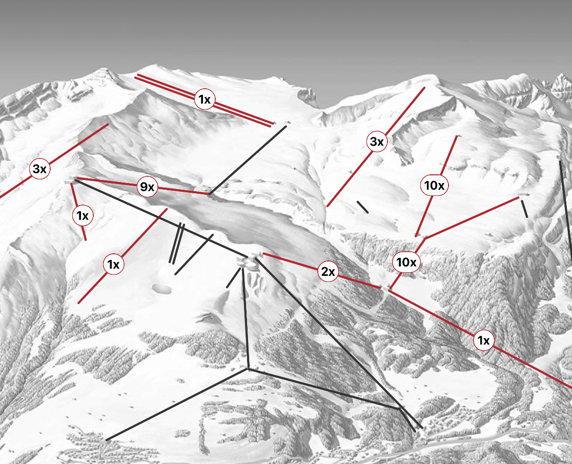 2024/25:132Tg:22xLaax,21.5xKlewen,13xDolo,12xH’tux,11xA‘matt,9xZ’matt,3.5xIschgl,3xKauni,3xDavos,3xPitz,3xStelvio,3xTignes,2xSölden,2xALH,2xVals,2xPenken,2xStubai,1.5xNassfeld,1xPizol,1xGurgl,1xFee,1xSFL,1xOsttirol,1xSHLF,1xSkiwelt,1xNauders,1xÖtzKüh,1xPaganella,1xFrutt,0.5xScuol,0.5xM365,0.5xFlumsi,1xSkitour