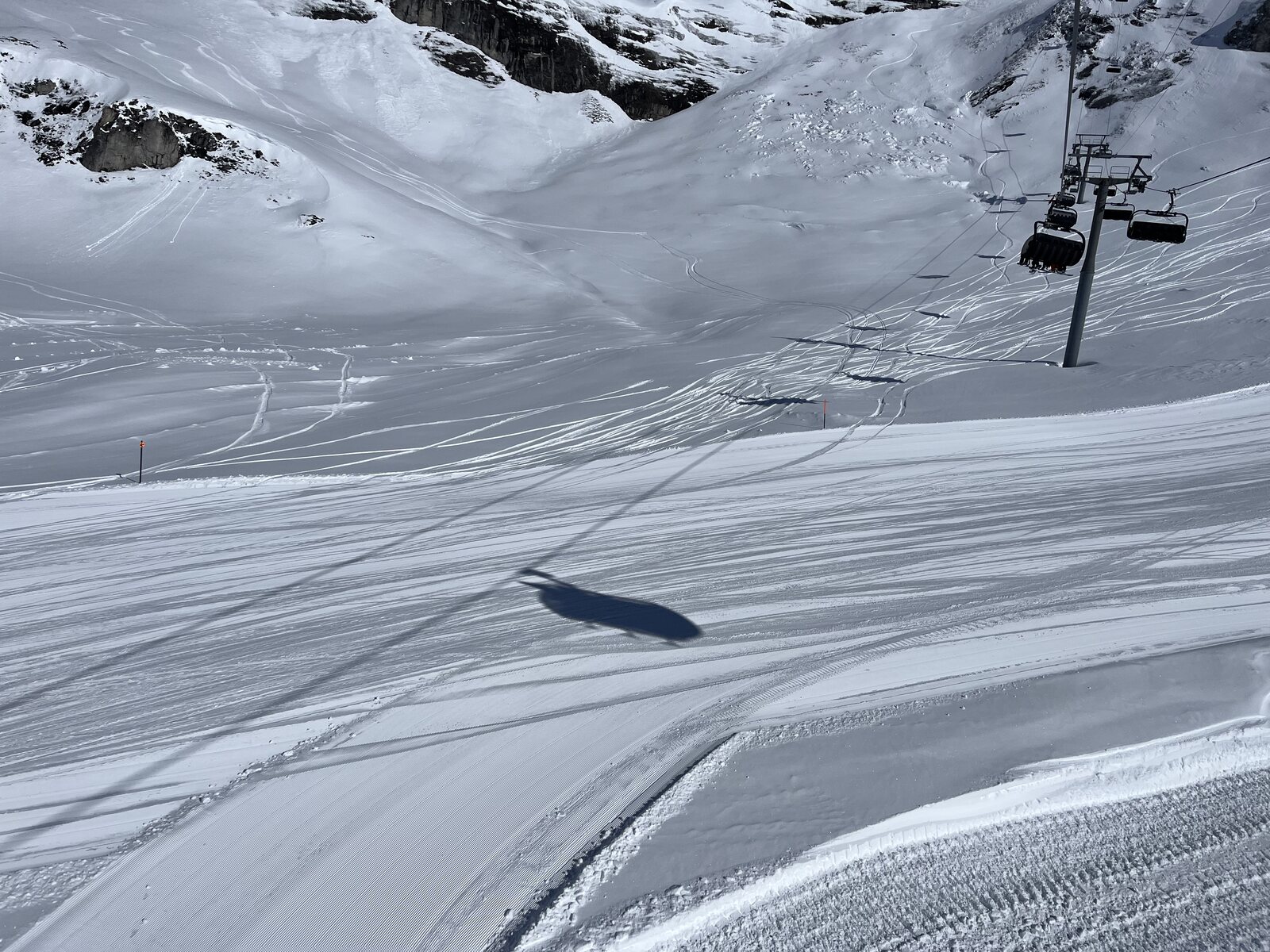 Das war die beste Entscheidung heute frei zu machen Sitze alleine im Mutta. Auf dem Weg dorthin gab es noch unverspurte Piste Ich glaube Flims Laax will heute alle negativen Schlagzeilen der letzten Wochen auf einmal gut machen. Pisten bisher alle frisch präpariert, La Siala fährt schon um 09:00 Uhr, die Gletscherpisten sind sie gerade mit 4 oder 5 Bullies am präparieren. 3. Spur auf La Siala West Bis jetzt ist es echt Grenz-genial
