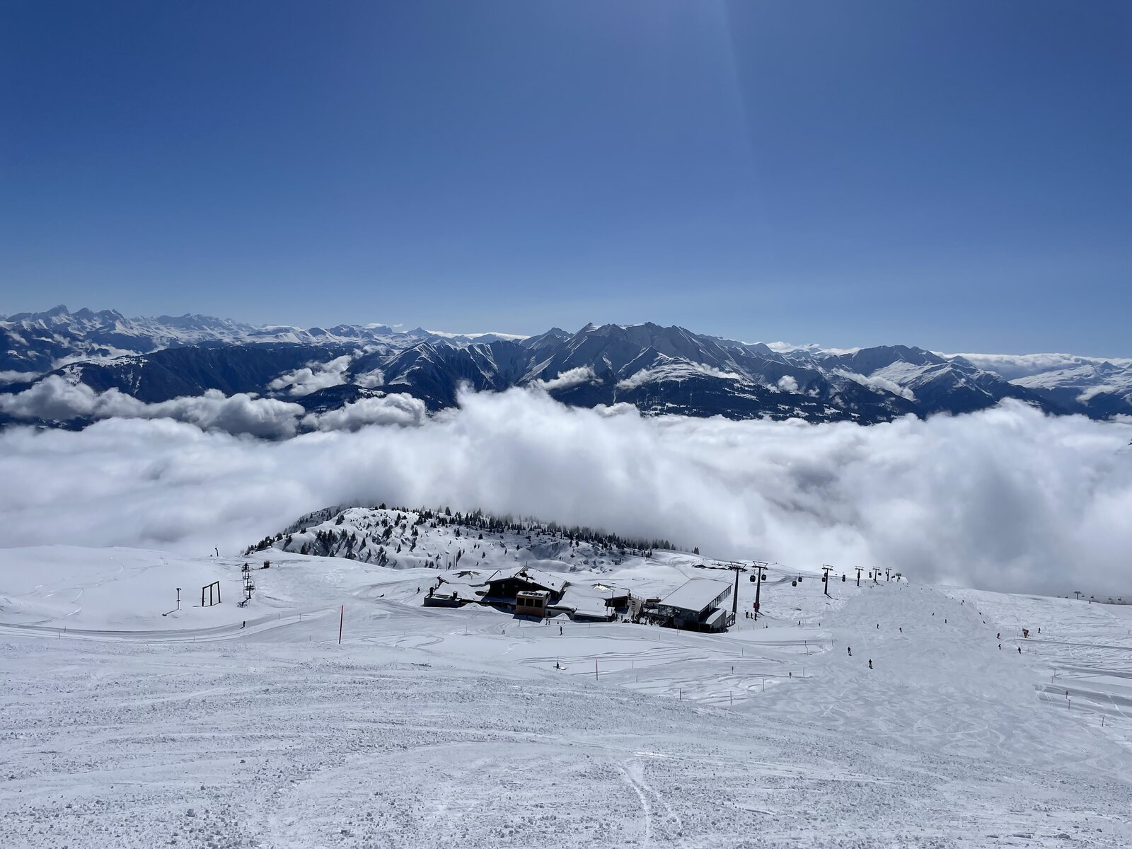 Sitze alleine in einer Kabine vom Fuorcla Richtung Masegn. Update 10:30 ich kann mich nicht erinnern wann ich das letzte Mal Lavadinas mit gedrehten Sesseln gefahren bin Update 11:00 Uhr bisher 6500 Eintritte, die gefühlt fast alle Richtung Gletscher wollen. 5 min am Fuorcla anstehen und da am Gletscher nur ein SL lief mit entsprechender Warteschlange bin ich nochmal zum Fuorcla Richtung Masegn und die 42 nach Plaun. gäGenial und leer Auf Plaun dann wieder Privatskigebiet.