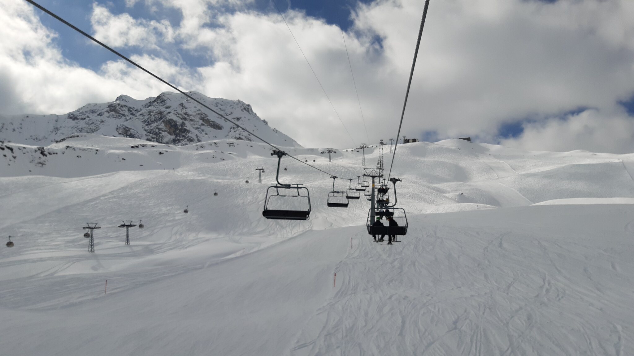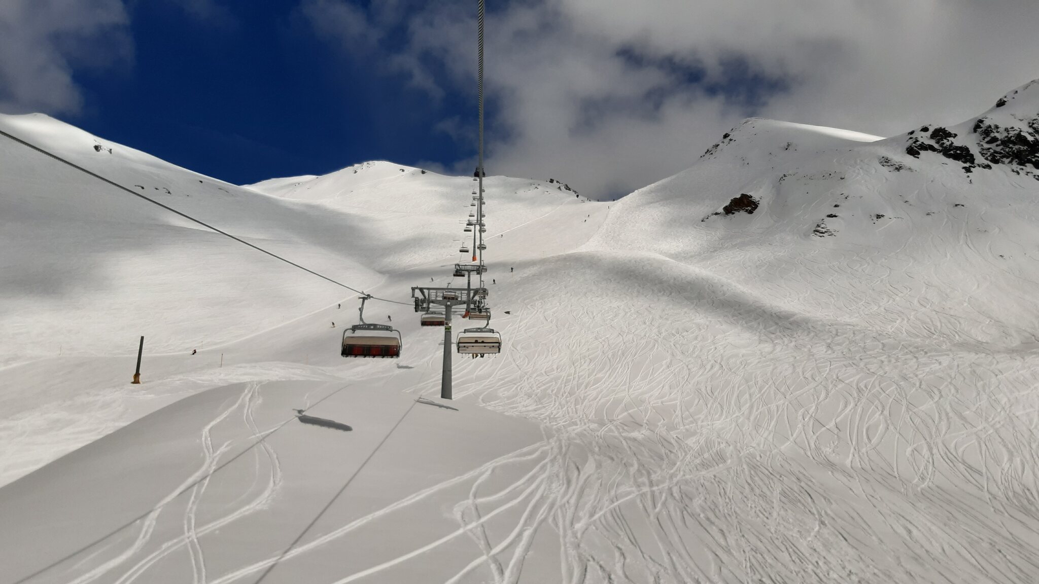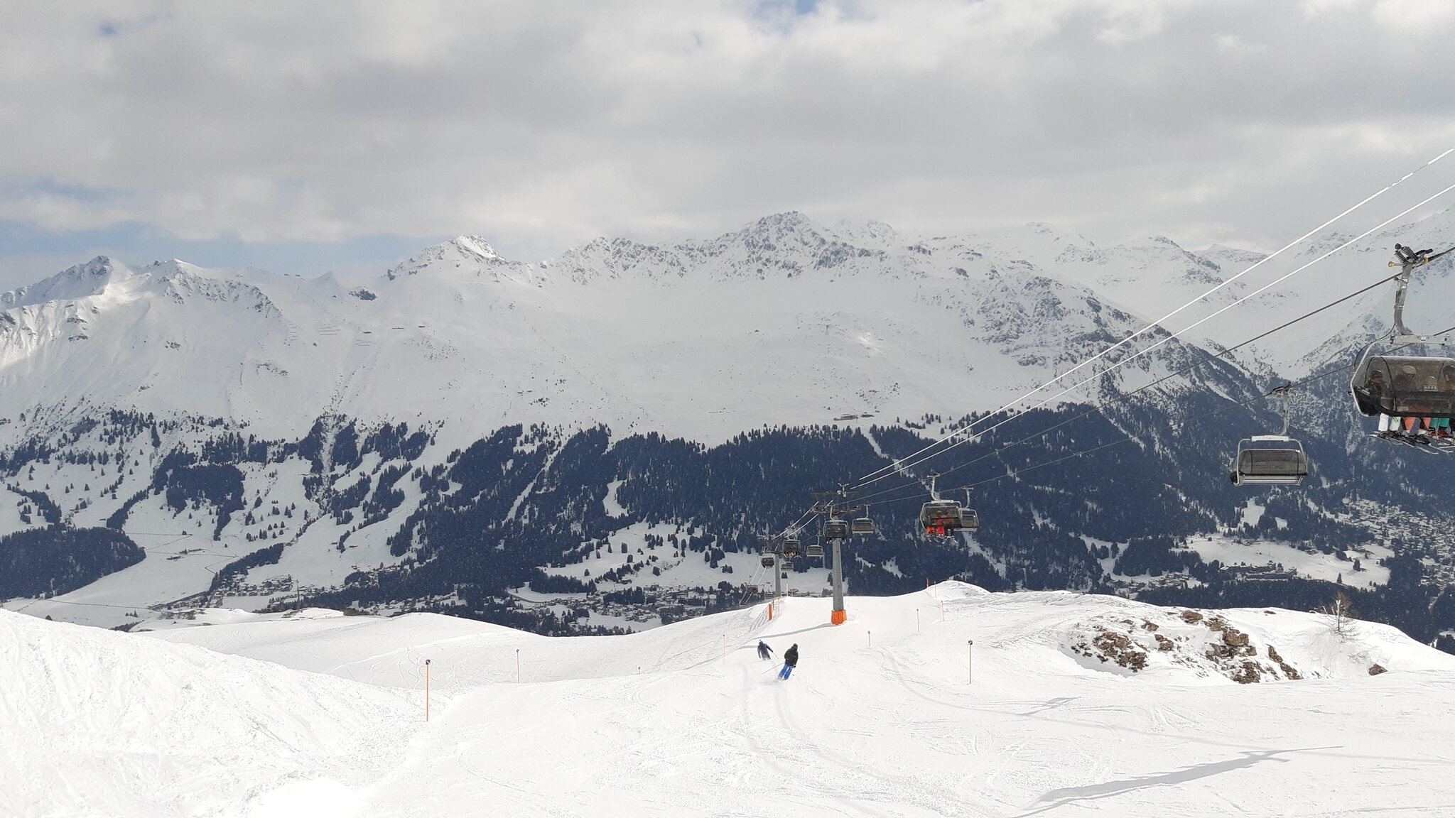 Da ein anderer Fahrgast noch seinen Rucksack vergessen hatte, ging es mit 2 Minuten Verspätung rüber in die Lenzerheide, so ich dann oben um 16:52 Uhr ankam. Dank sehr guter Pistenverhältnisse war ich in nur 5 Minuten am Obertor-Sessel. Das wäre bei normalen Pistenverhältnissen auf der Lenzerheide in keinem Fall möglich. Und dieses Bild ging sich auch noch aus ;-)