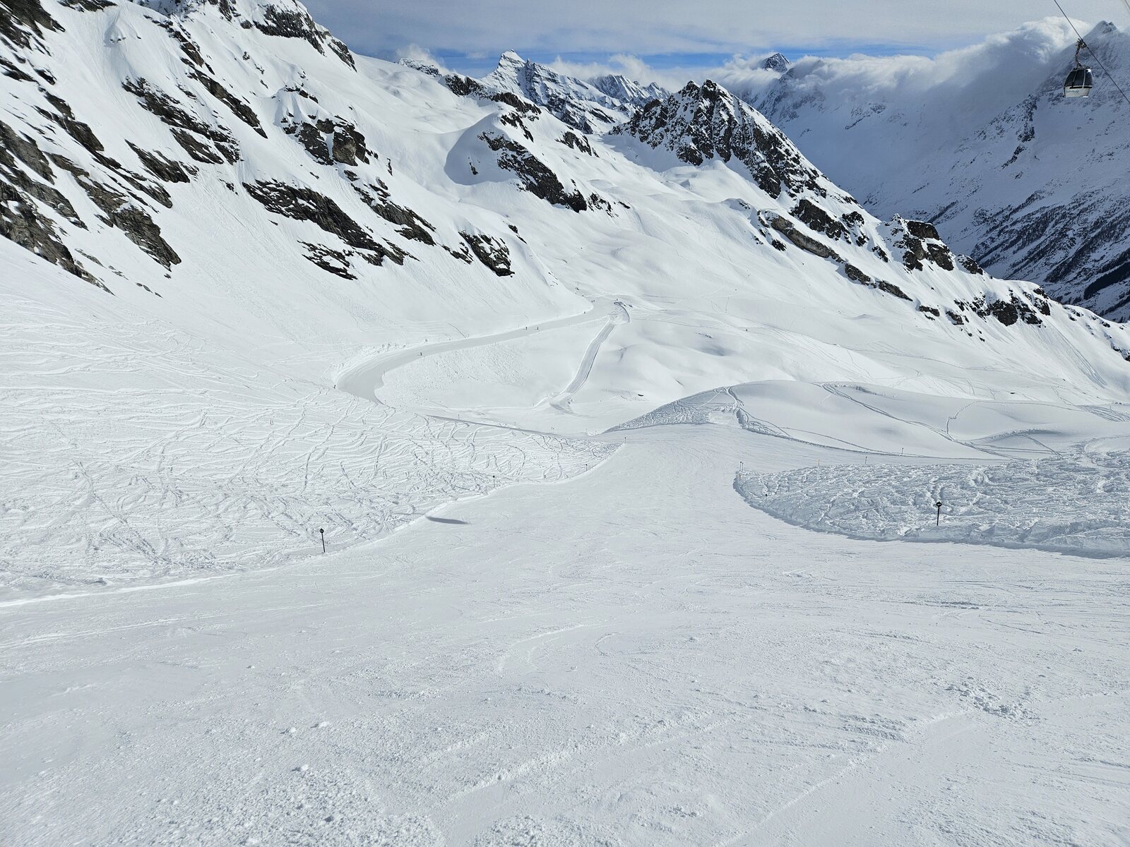 ) Gerade im Bereich der Gletscherbahn ist der Schnee absolut traumhaft. Die Varianten am Märwig-Schlepper sind auch echt gut. Dieser hatte heute um ca. 10h50 ein technisches Problem und alle Nutzer mussten nach 10 min aussteigen und abfahren. Kann passieren. Schade war, dass der 3TS Gandegg kurz vorher für min. 15 min Stand und auch technische Probleme hatte (wurden im Laufe des Vormittags noch gelöst). Deshalb waren viele Leute am Einstieg des 3TS Gandegg und ich bin komplett bis zur Alp über die schwarze 5 abgefahren. Kurz vor Ende der Pisten 2, 3 und 4 waren eisige Stellen auf der Piste, aber nur dort. Man merkt, dass der Einstieg ins Skigebiet bei knapp 2000m sehr vorteilhaft für die Schneequalität ist.