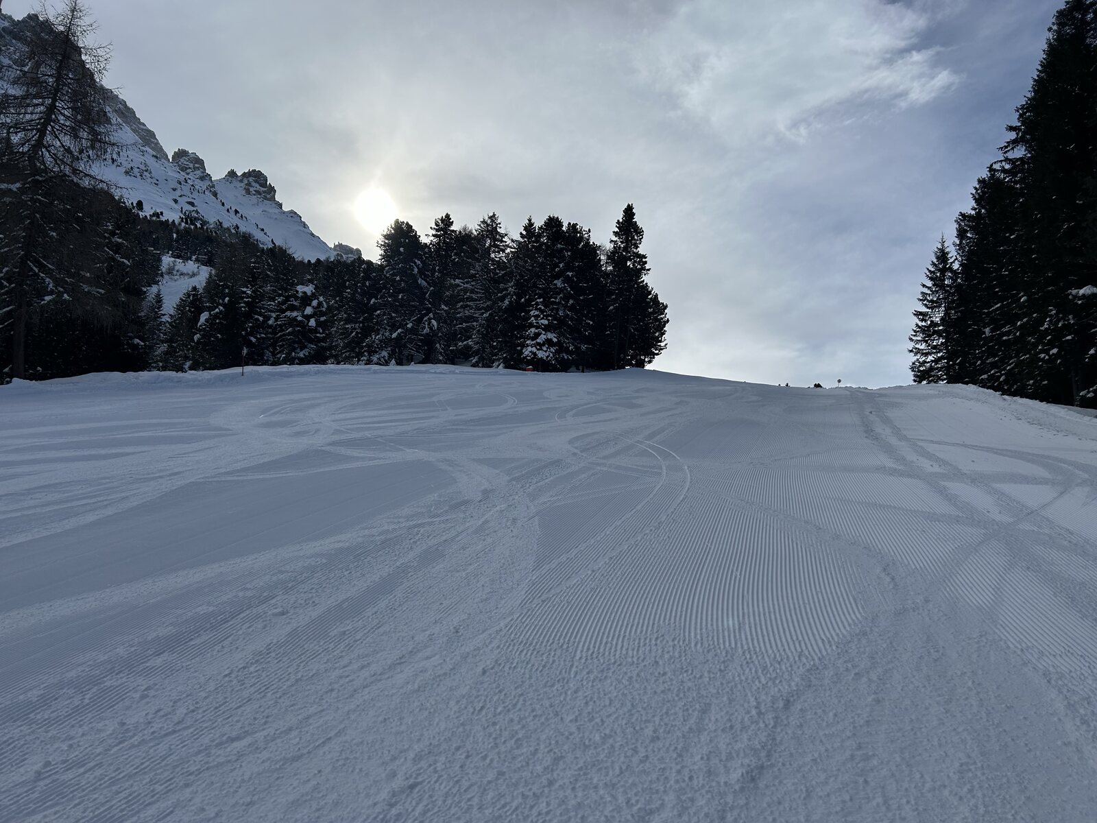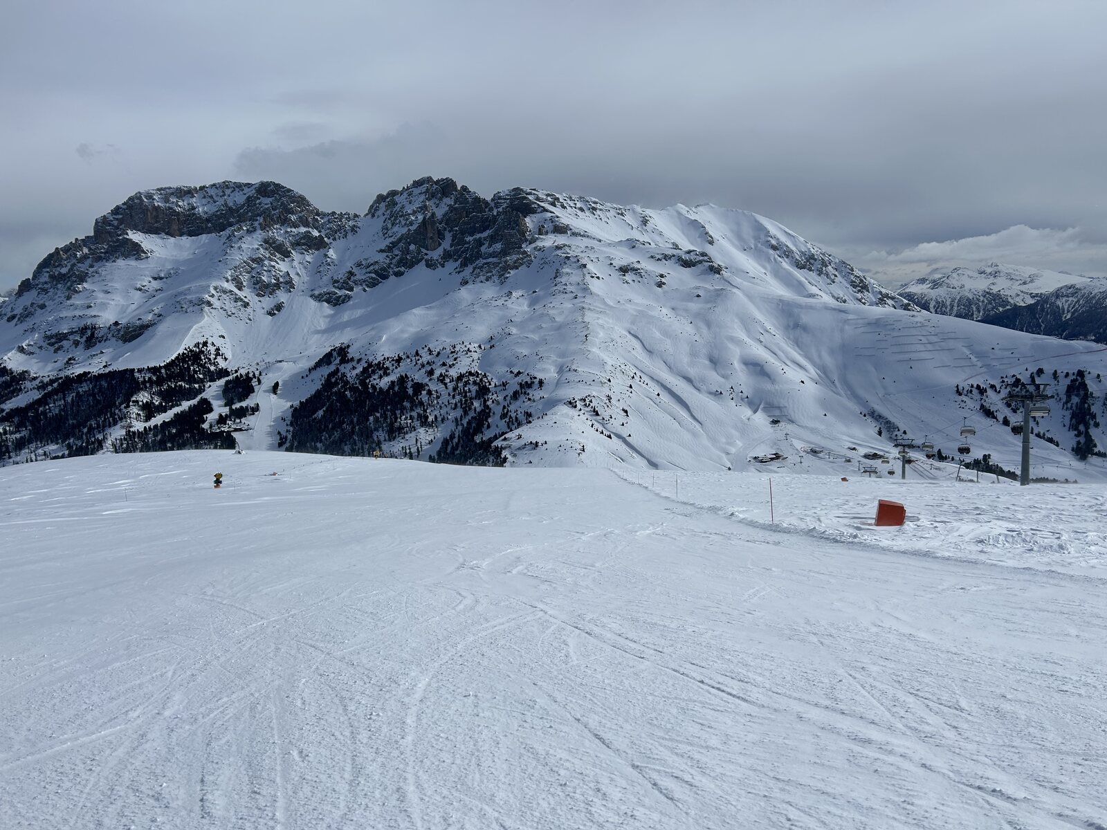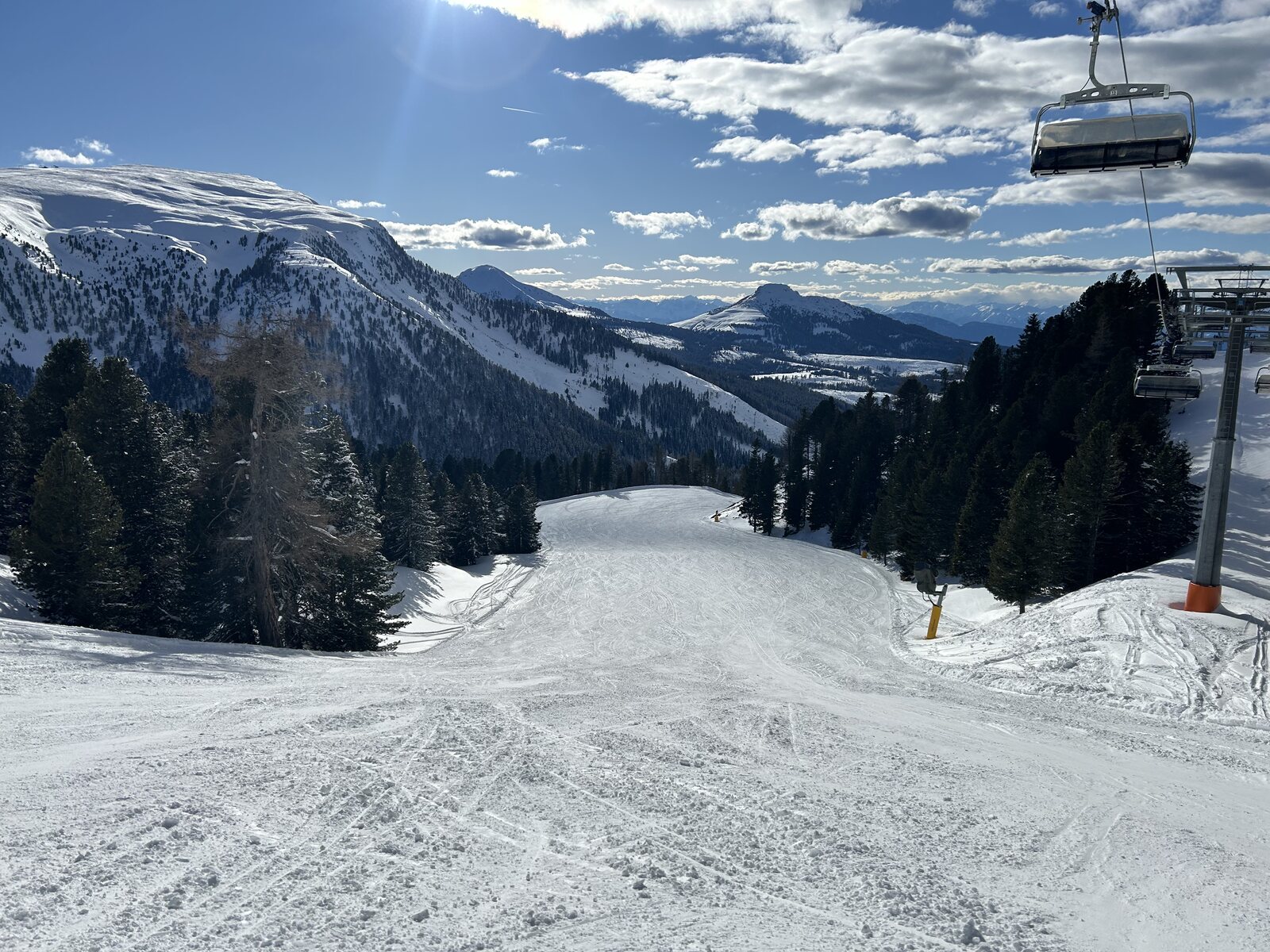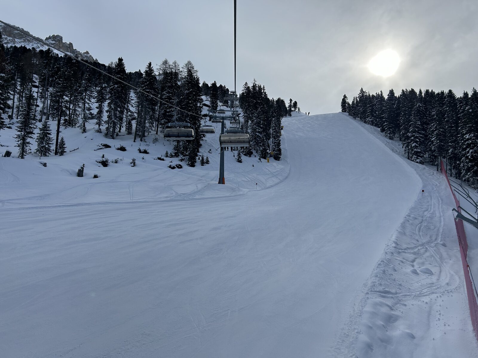 Schnee lässt sich super fahren bisher, weniger Leute als auf der Sella. Macht Spaß! Zurück auf der Piste