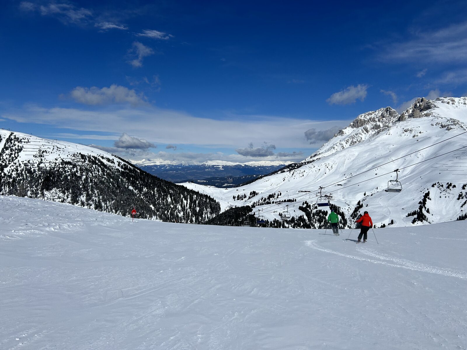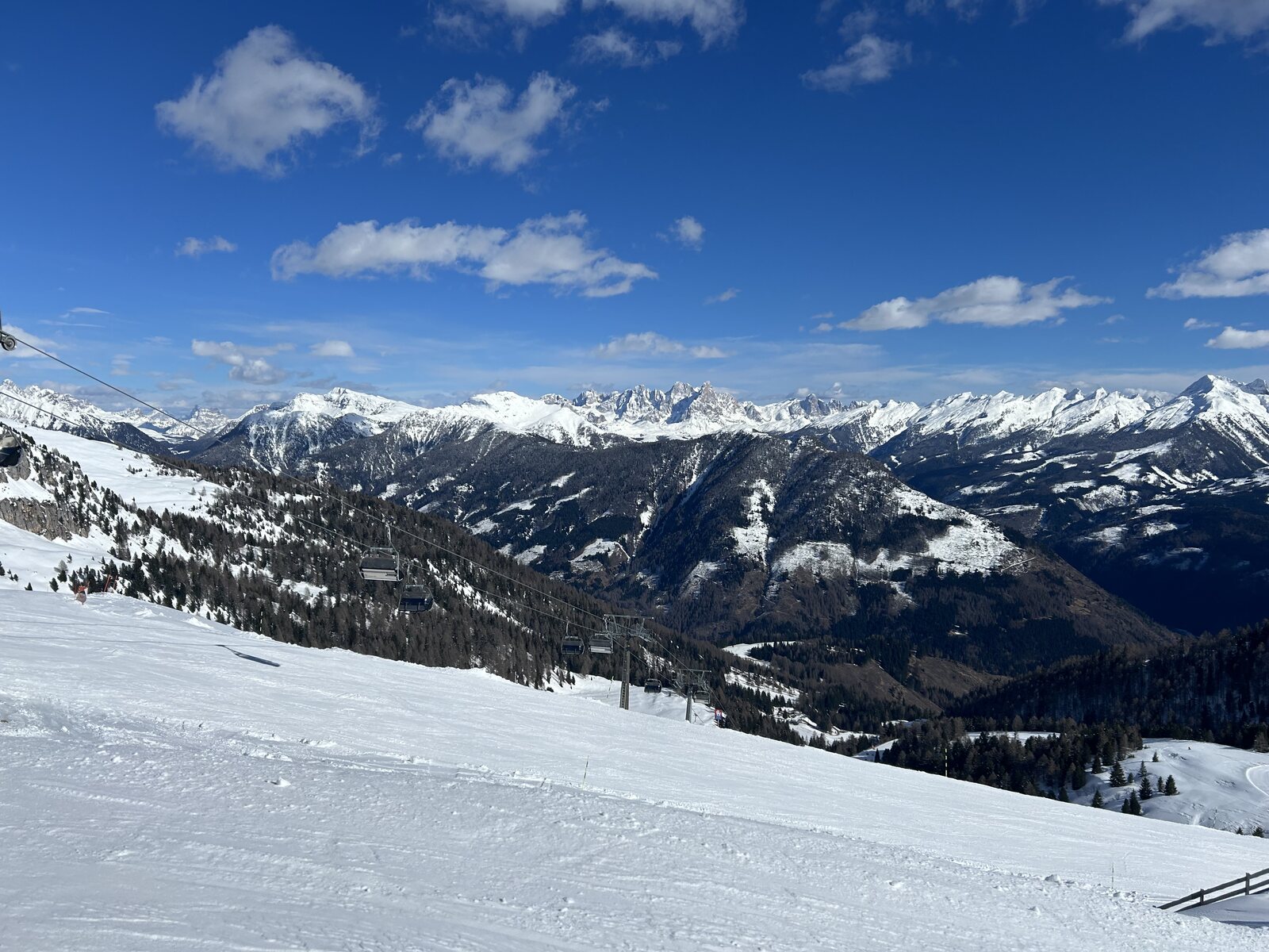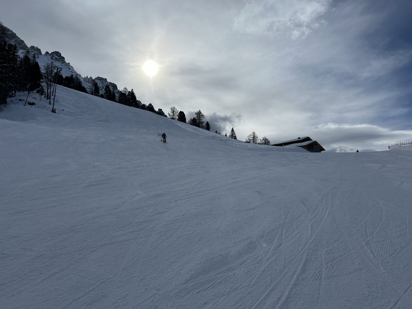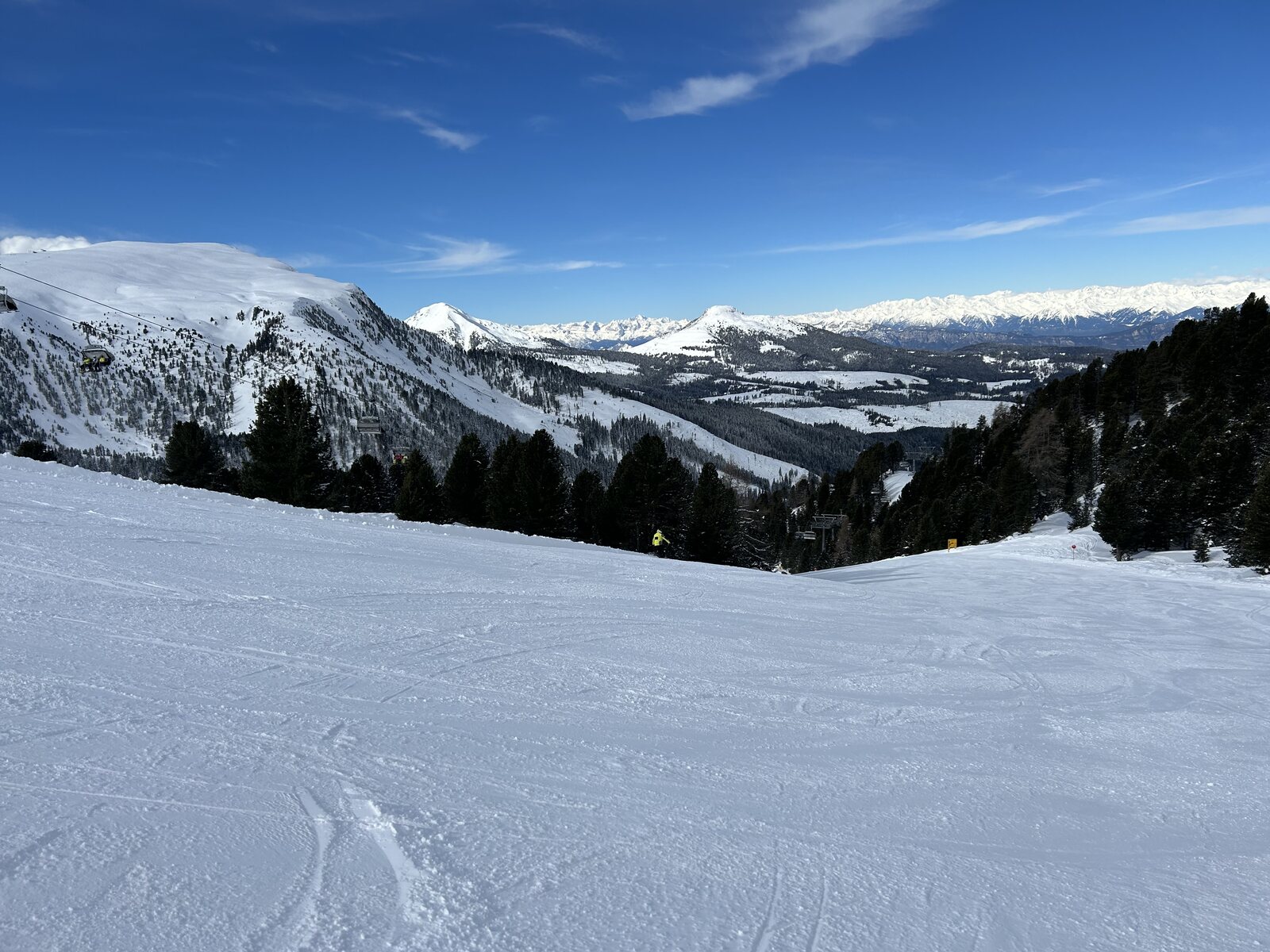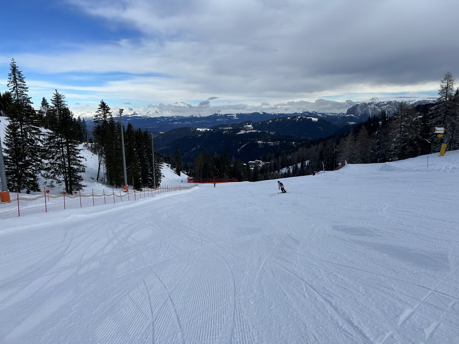 Schnee lässt sich super fahren bisher, weniger Leute als auf der Sella. Macht Spaß! Zurück auf der Piste