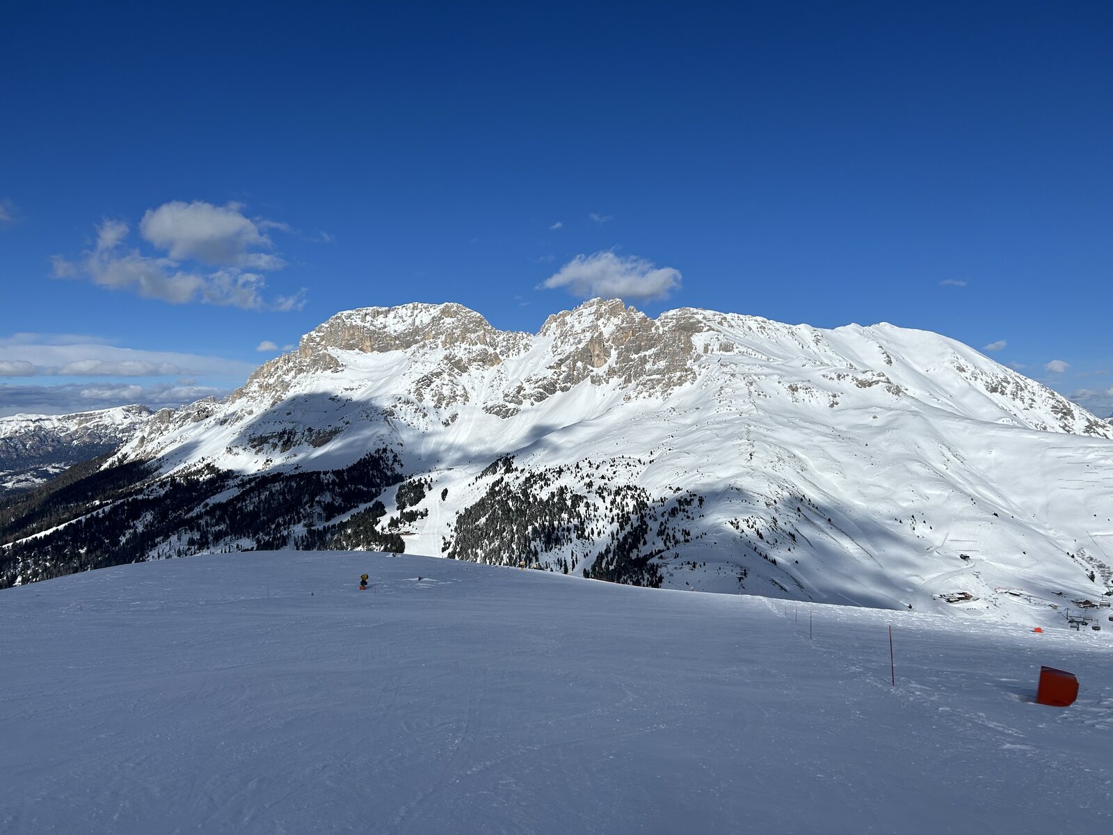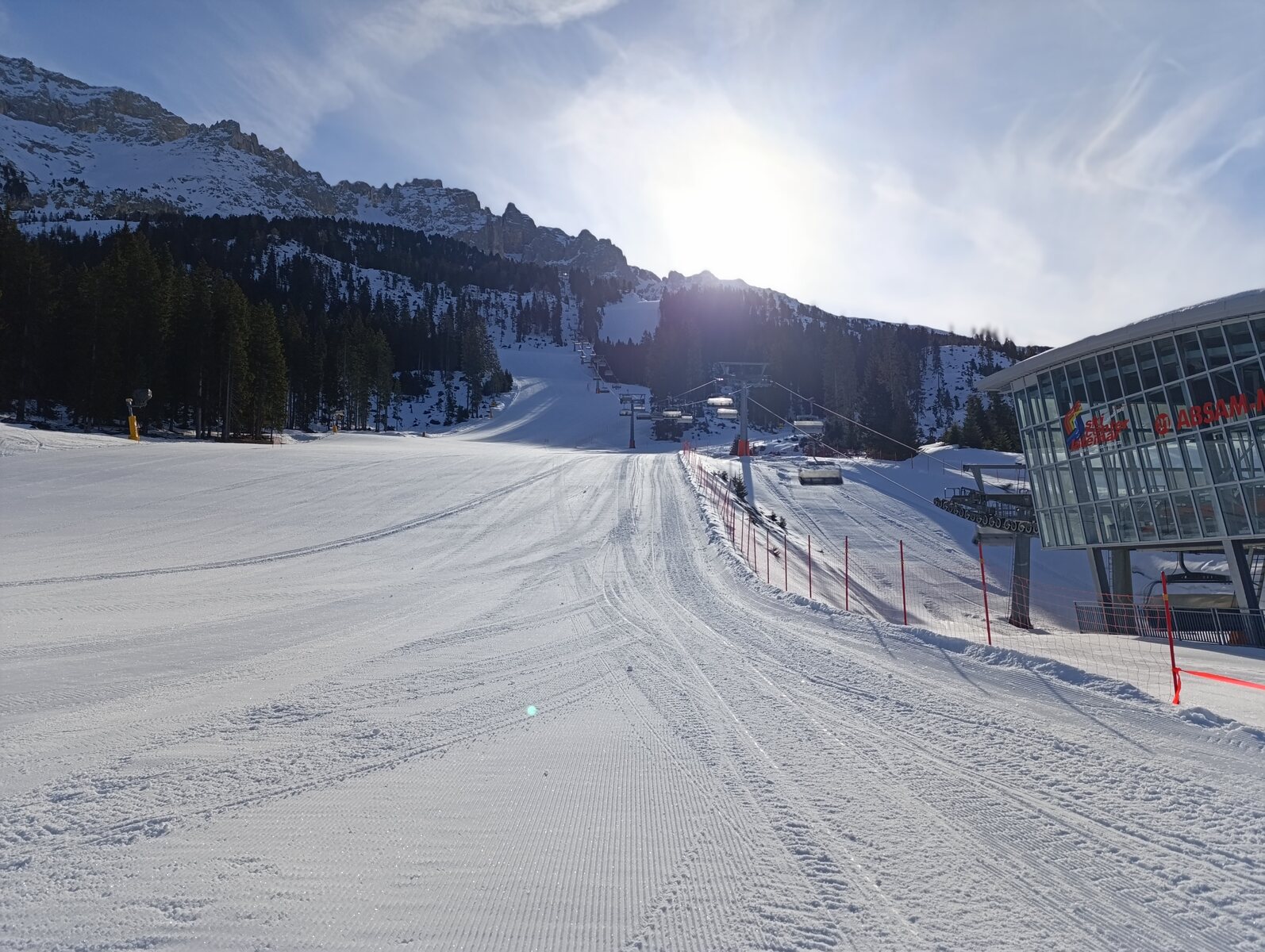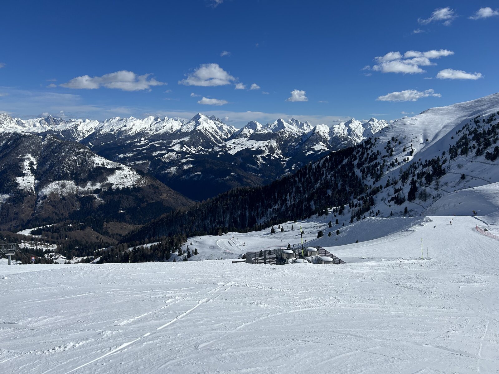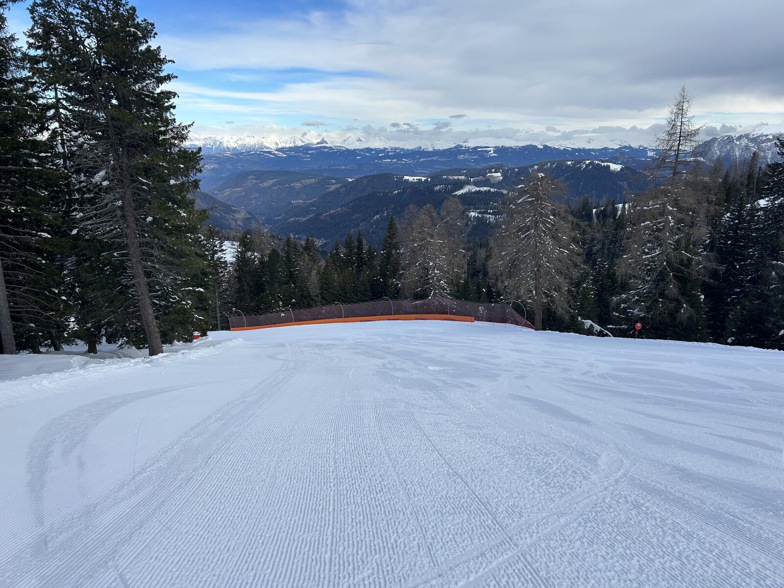 Schnee lässt sich super fahren bisher, weniger Leute als auf der Sella. Macht Spaß! Zurück auf der Piste