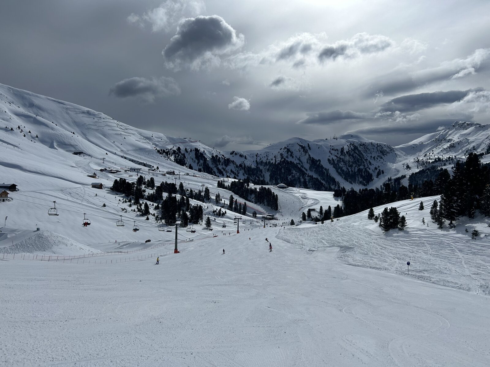 Butterweiche Pisten, aber gerade noch hart genug um nicht zusammen geschoben zu werden. Ein Pisten Traum, breite Autobahnen ohne Absätze und schön trassierte lange Abfahrten (viele rote Pisten wären in Kitzbühel und Co sicher schwarz