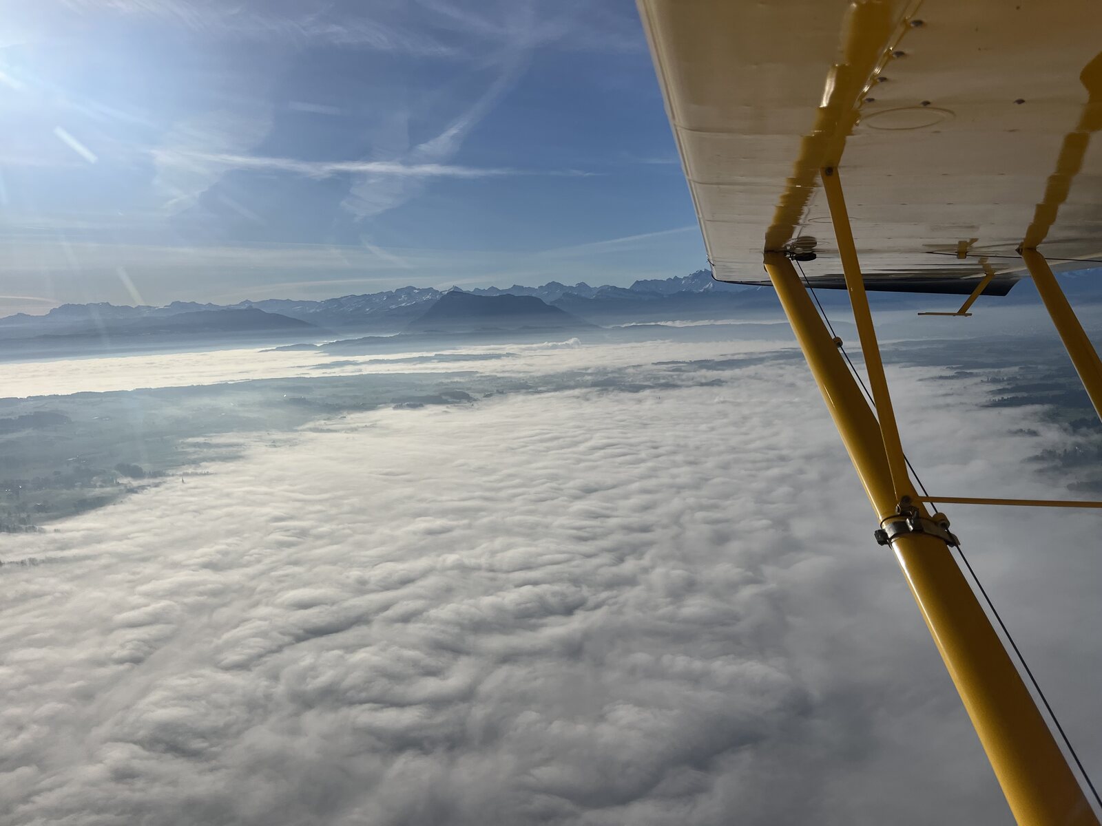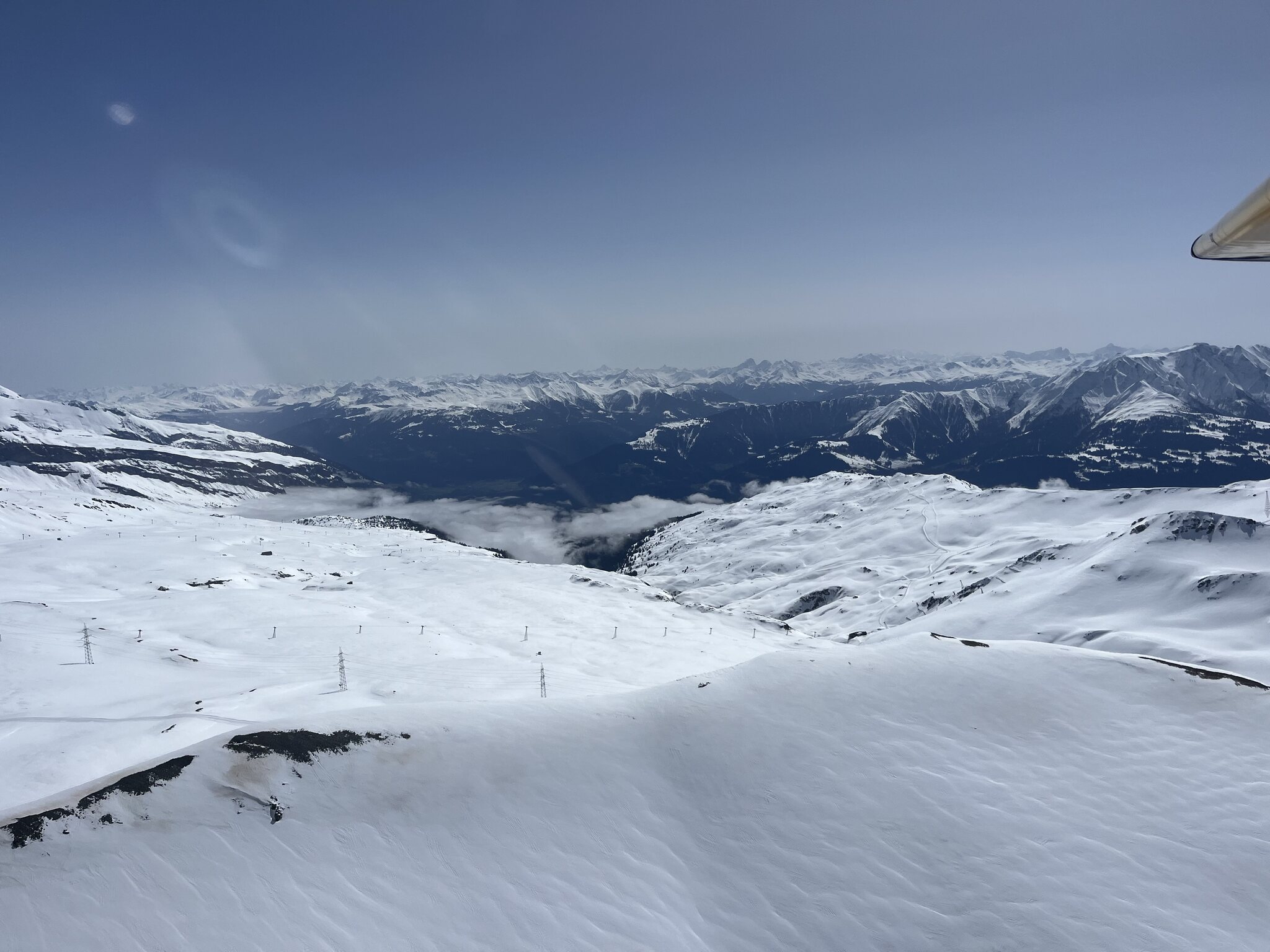 Heute stand ein besonderer Auftrag auf dem Plan: Ein Ehepaar auf zwei Flugzeuge aufgeteilt. Da die HB-PLG seit letztem Herbst nicht mehr in Beromünster, sondern neu in Hausen am Albis steht, musste ich zuerst dorthin fliegen, um einen der Passagiere aufzunehmen. Die Nebelsuppe lag zum Glück knapp unterhalb der beiden Flugplätze in erhöhter Lage: Nach dem Start ging es an Zug vorbei auf den Hüfifirn, Landestelle Chammlilücke: Nach einer kurzen Pause machten wir einige Landungen am Chammlijoch, ganz oben, ziemlich steil, aber sehr lässig: Ohne auszusteigen flogen wir nachher zum Limmernfirn, wo wir ebenfalls eine Landung machten, ohne anzuhalten. Danach flogen wir für das obligate Fondue, dieses Mal zu viert, auf den Vorab: Nach ausgedehnter Pause ging es am Martinsloch vorbei… …für einige Landungen an den Glärnisch (keine Fotos) und danach zurück nach Hausen. Nur 10min dauerte danach noch der Rückflug zu meiner Homebase.