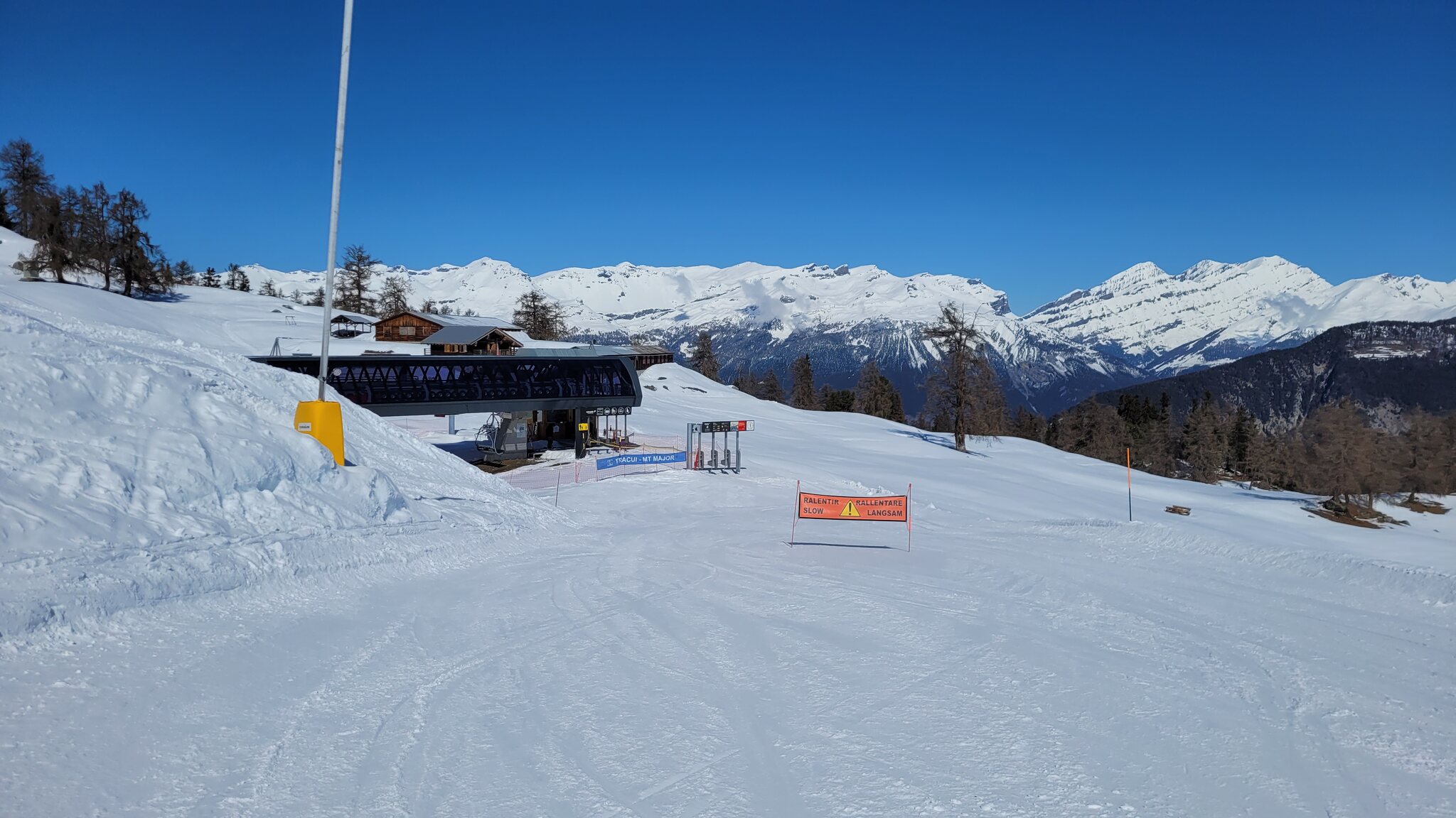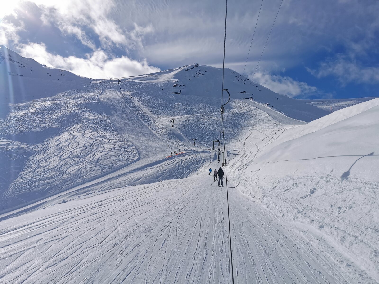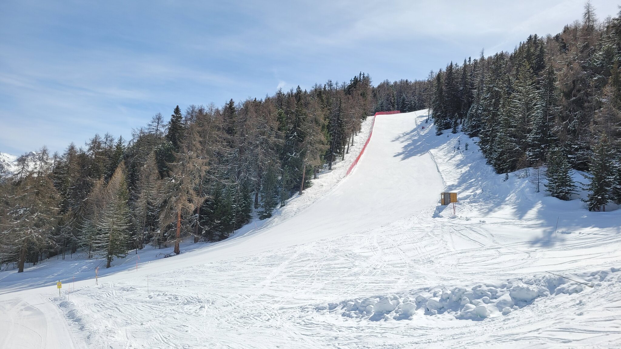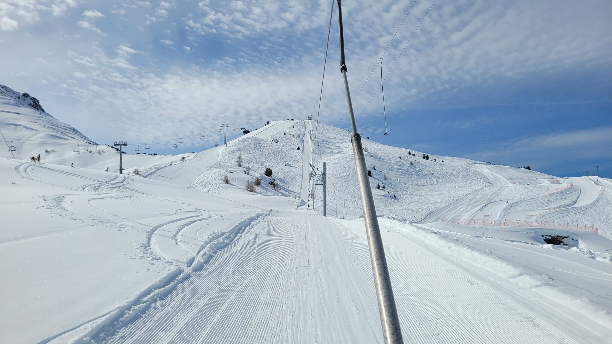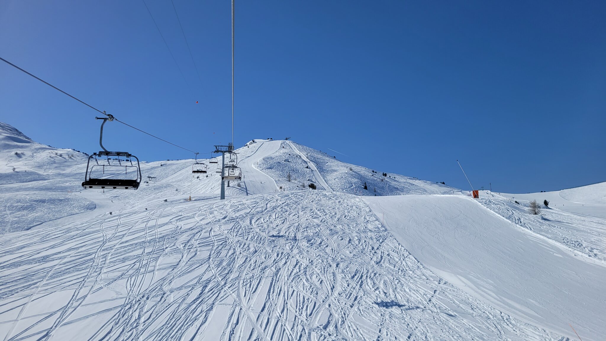 Obwohl der Betrieb offiziell erst um 9 Uhr beginnt, beförderte die EUB bereits Skifahrer, als wir um 8:55 Uhr an der Talstation ankamen. Die Pisten waren perfekt präpariert und bis auf den letzten Abschnitt vor Chiesso KSB blieben alle Pisten den ganzen Tag über sehr griffig.