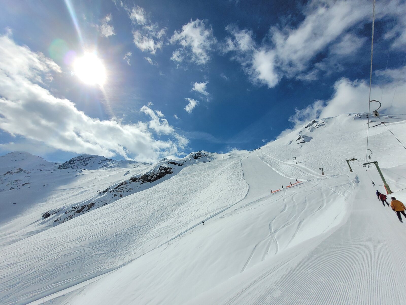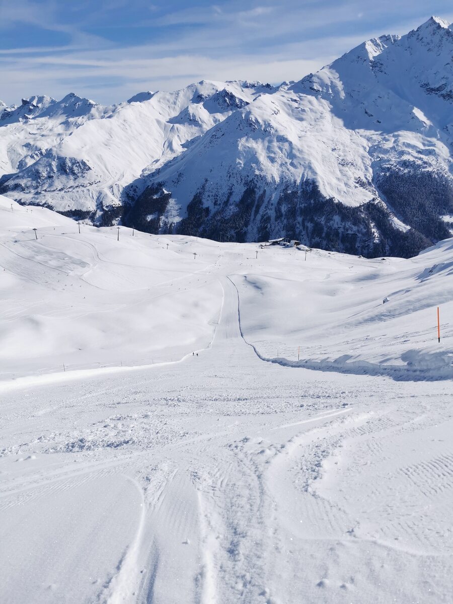 Erste Abfahrt auf der Piste Tsa. Perfekte Piste und viel Platz.