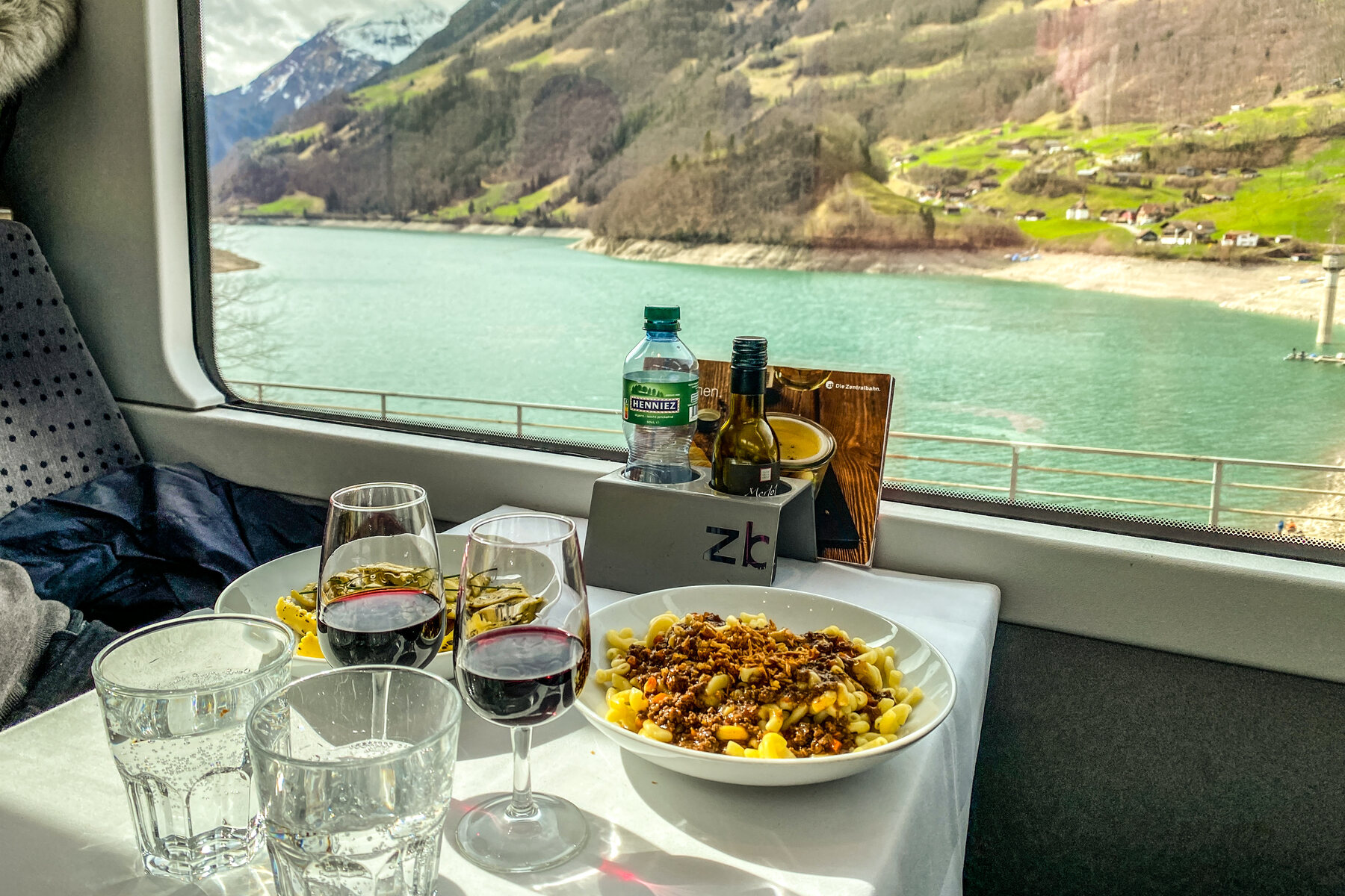 Dass ich jahrelang nie mit der Zentralbahn nach Interlaken fahre und dann in einer Woche grad zweimal, ist schon speziell. Erneut nutzen wir den Speisewagen. Heute mit Trüffelravioli resp. Ghackets und Hörnli… Wende in Meiringen …und einem Crêpe mit Zwetschgen. In Interlaken Ost steigen wir in den GoldenPass Panoramic. Wir haben zwei Plätze in der Prestige-Class gebucht. Als der Zugführer zur Ticketkontrolle vorbeikommt, enttäuscht er uns mit der Nachricht, dass die Umspuranlage defekt sei und wir in Zweisimmen in den baugleichen Zug umsteigen müssen. Dann halt wenigstens eine Auge drauf werfen: …und die Videos dazu auf YouTube schauen: