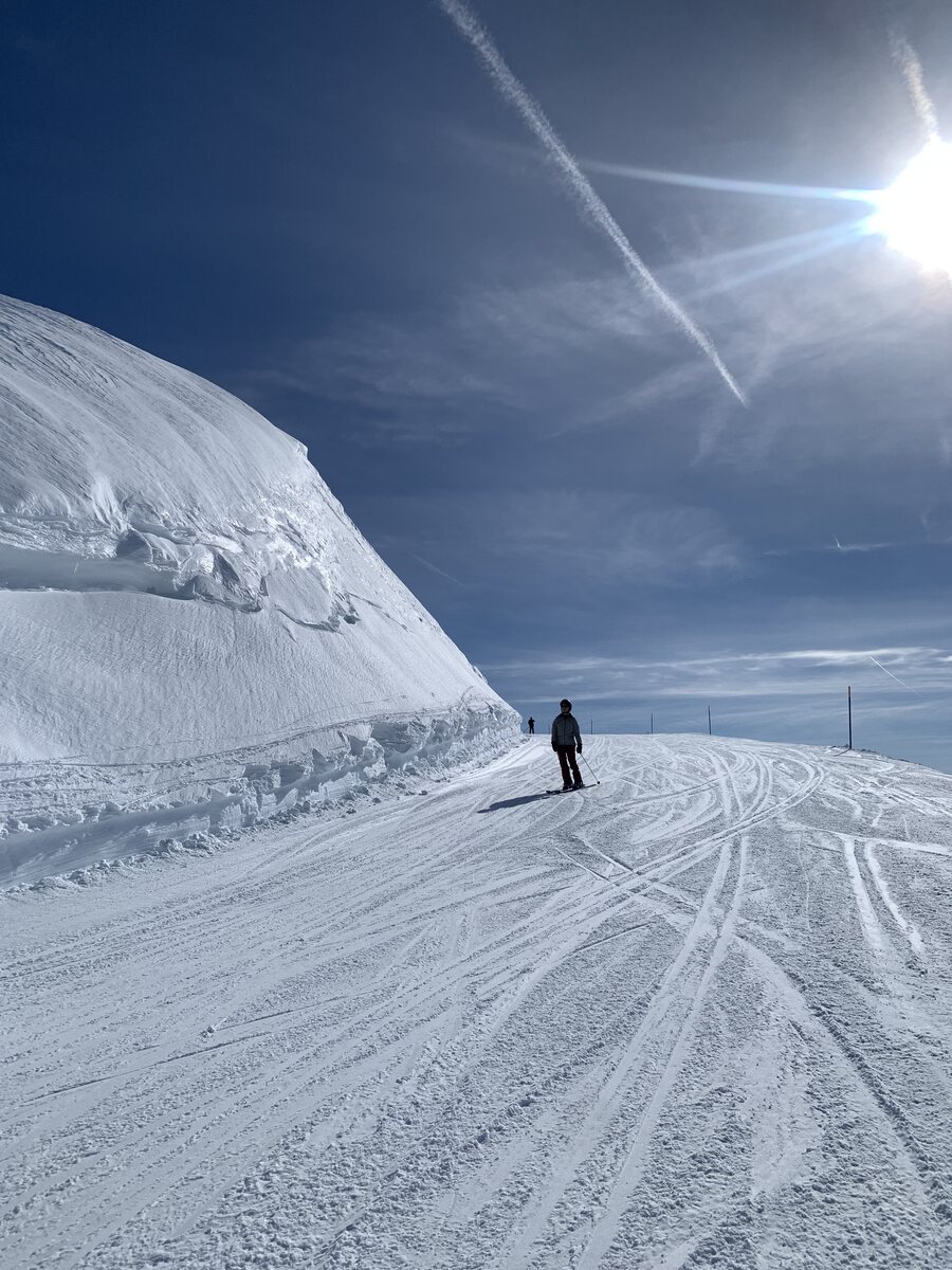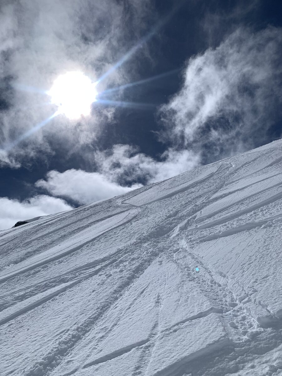Siala West ist kurz nach der späten Öffnung ein Traum und wider Erwarten gar nicht so weich. Eigentlich wollte ich ja sofort nach der Öffnung auf die Sattelpiste… …aber „meinem“ Flugi muss ich da schon noch einen kurzen Besuch abstatten und mit den beiden Piloten etwas plaudern, bevor sie wieder starten. Entsprechend ist der Sattel dann nicht mehr so top. Der Steilhang interessanterweise zwar schon noch, aber weiter unten stark aufgefahren. Hingegen ist die 40 um 12 Uhr immer noch genial! Schreit nach einer Wiederholung, auch wenn diese recht aufwändig ist. Edit 15.15 Uhr: