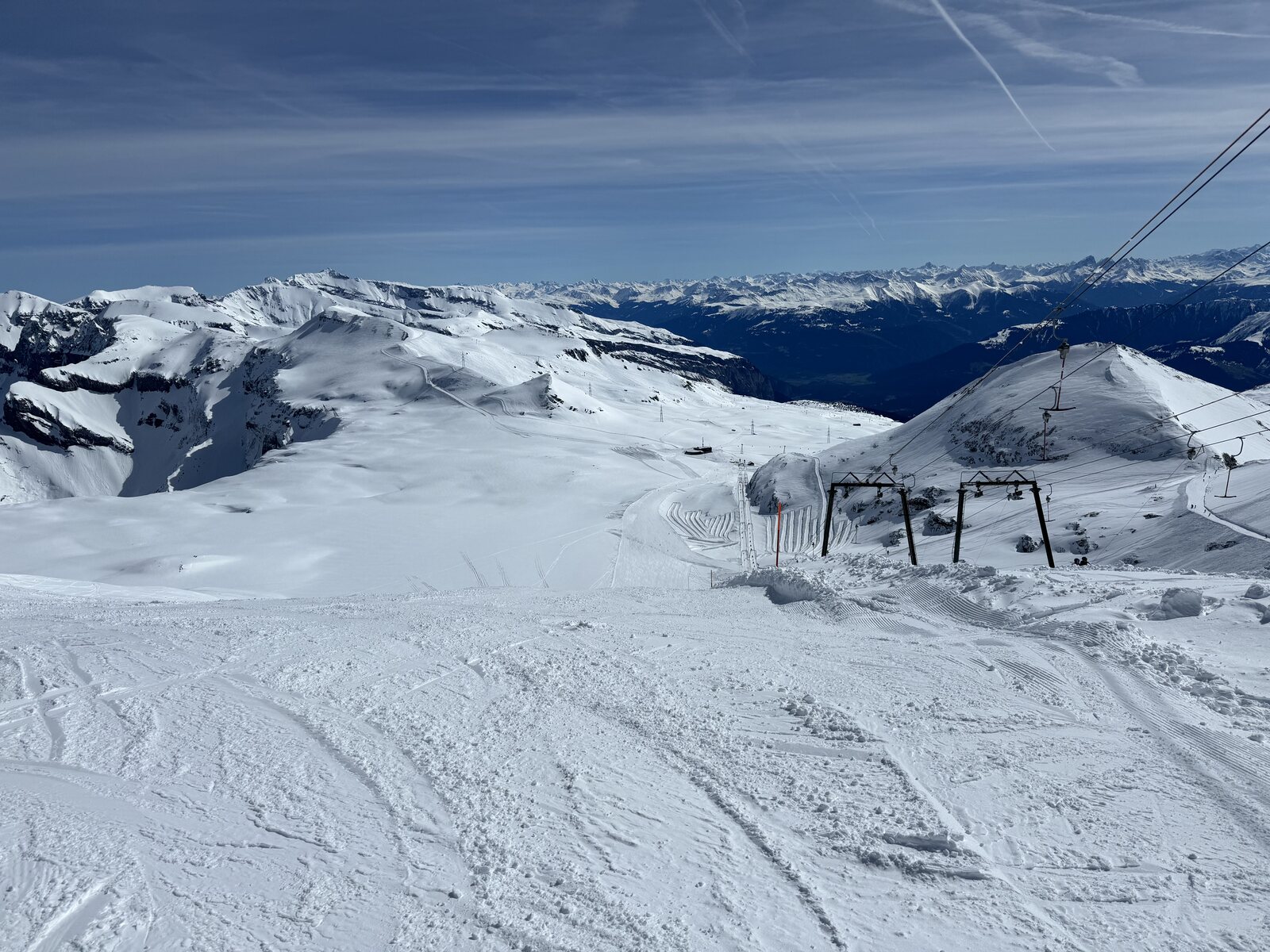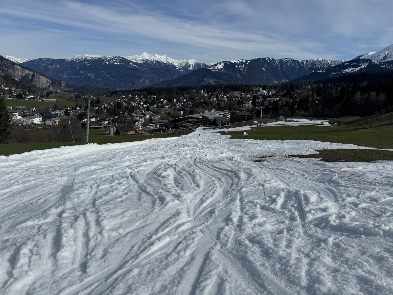 Ich bin für ein paar Tagen in Laax am Skifahren. Mit dem Titlis Abo gibt es jeweils 3 Tage in Flims/Davos/Lenzerheide was natürlich genutzt werden muss. Da ich am Morgen auf mein Junior (noch ein Baby) geschaut habe hat es für eine Nachmittagsrunde gereicht. Durch die warmen Temperaturen waren die Pisten schon sehr zerfahren und sulzig. Leute hatte es keine. Im Tal ist es schon Frühling und alles grün.