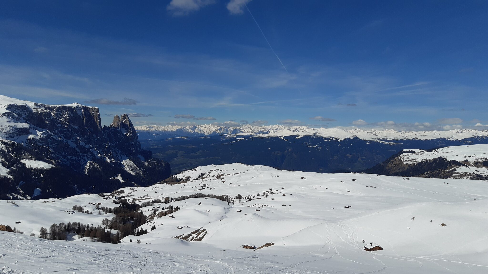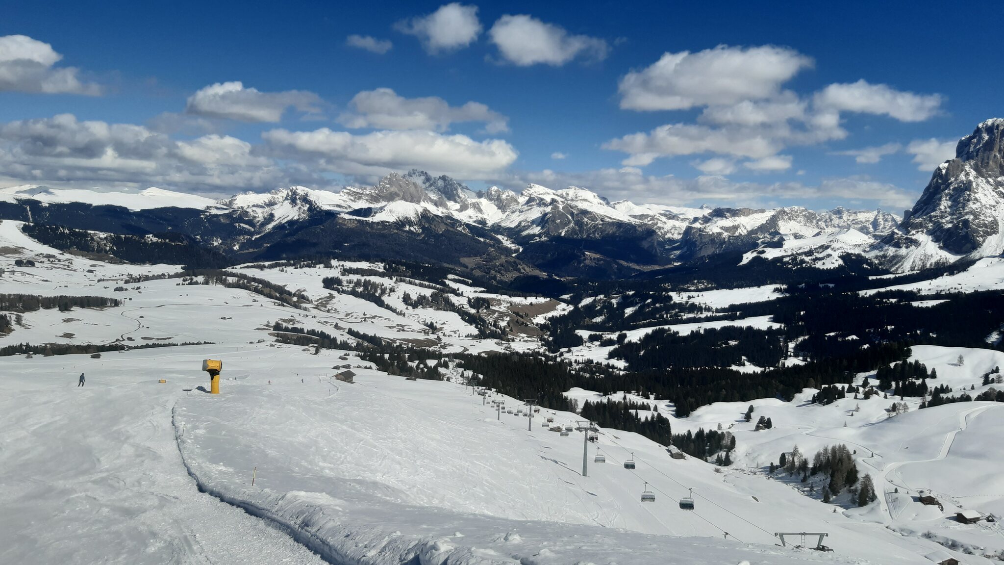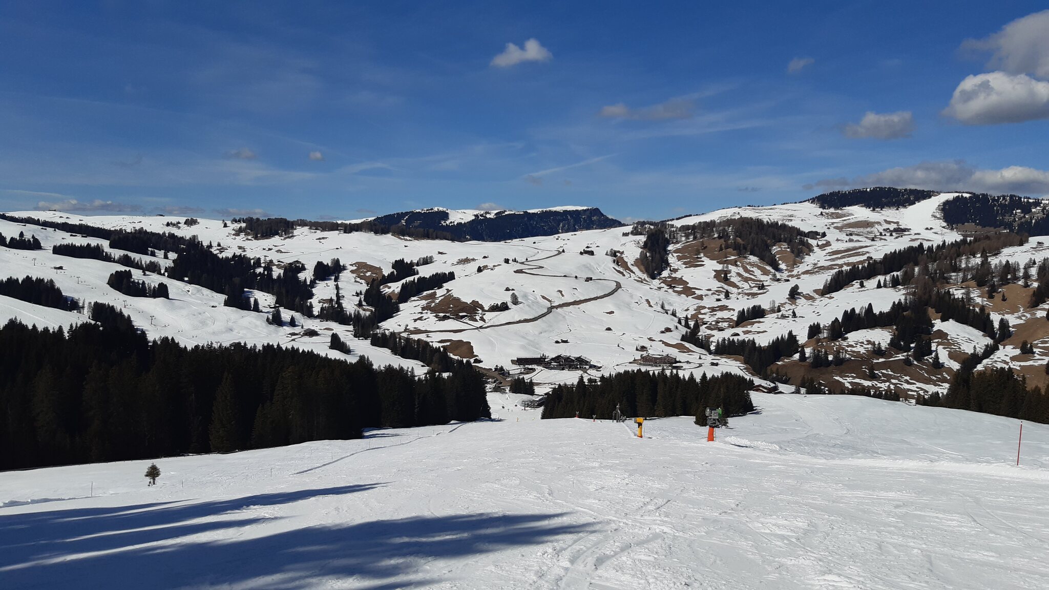 Blick über die weeeeeite der Seiser Alm. Schon beeindruckend diese Weite, aber man sieht, es ist verdammt flach. Die Orientierung im Skigebiet fällt mir mangels Höhenunterschiede schwer