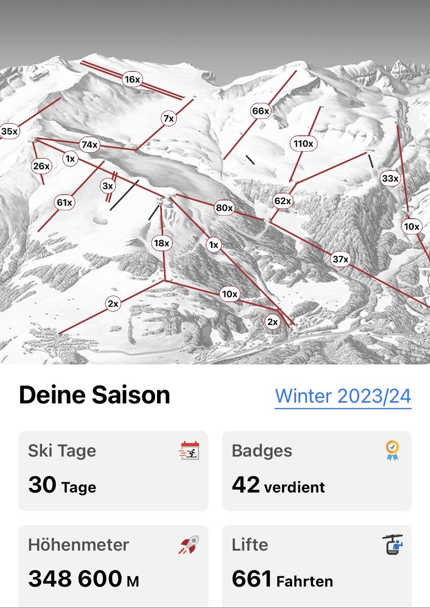 2024/25:132Tg:22xLaax,21.5xKlewen,13xDolo,12xH’tux,11xA‘matt,9xZ’matt,3.5xIschgl,3xKauni,3xDavos,3xPitz,3xStelvio,3xTignes,2xSölden,2xALH,2xVals,2xPenken,2xStubai,1.5xNassfeld,1xPizol,1xGurgl,1xFee,1xSFL,1xOsttirol,1xSHLF,1xSkiwelt,1xNauders,1xÖtzKüh,1xPaganella,1xFrutt,0.5xScuol,0.5xM365,0.5xFlumsi,1xSkitour