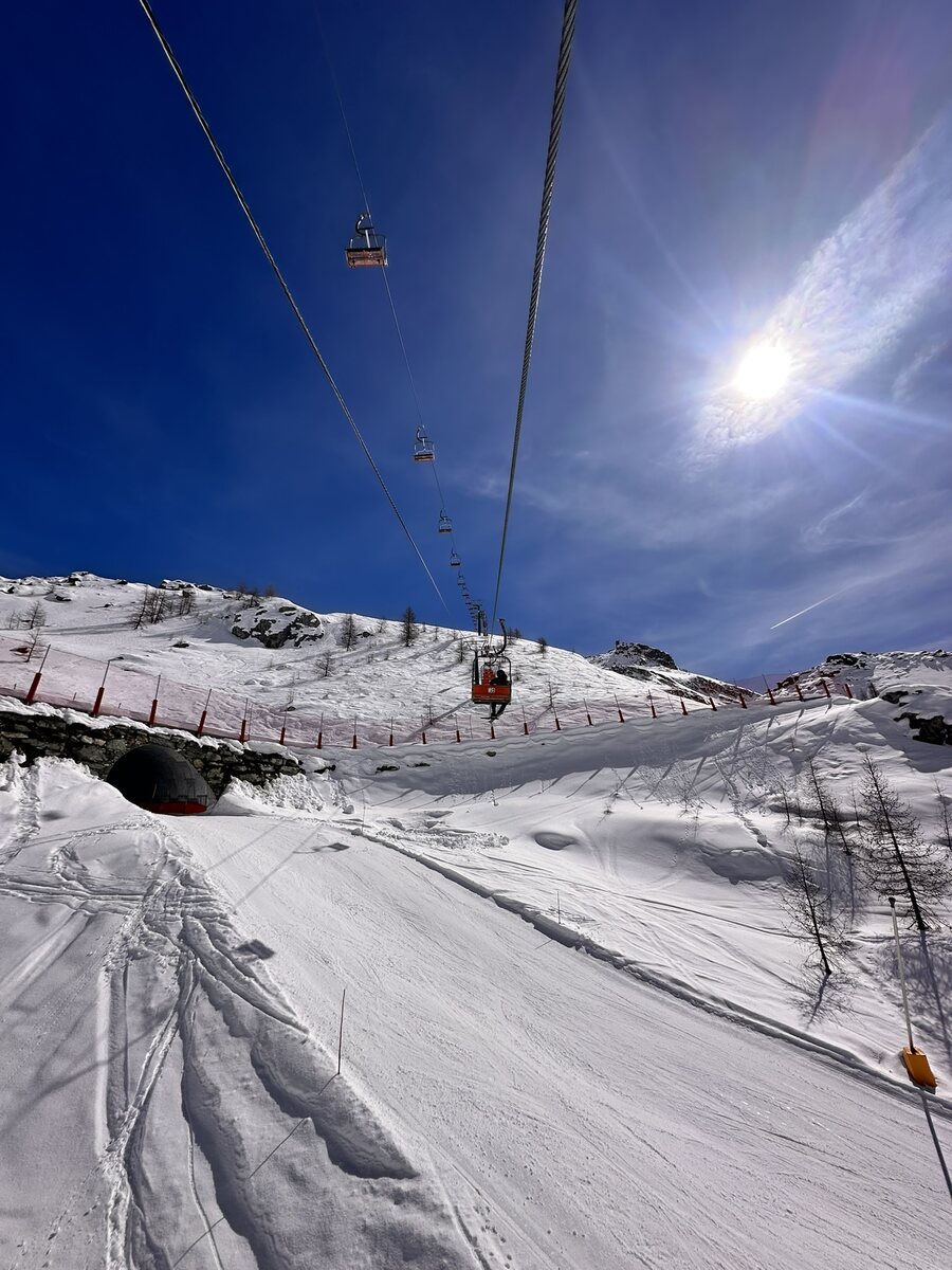 Über den historischen Sessellift Goillet dann nach Valtournenche - von eisigen Kunstschneepisten bis Sulz alles dabei.