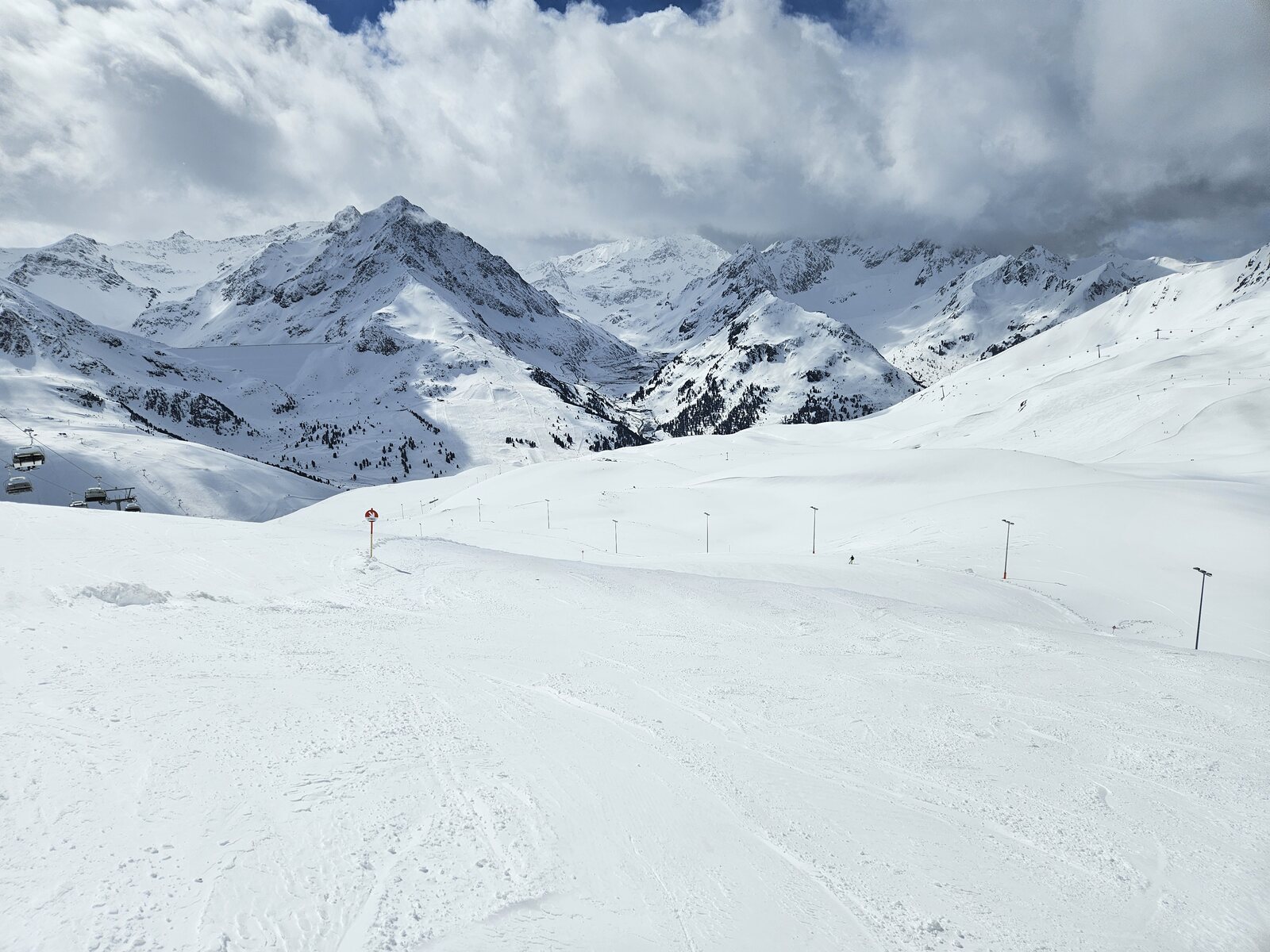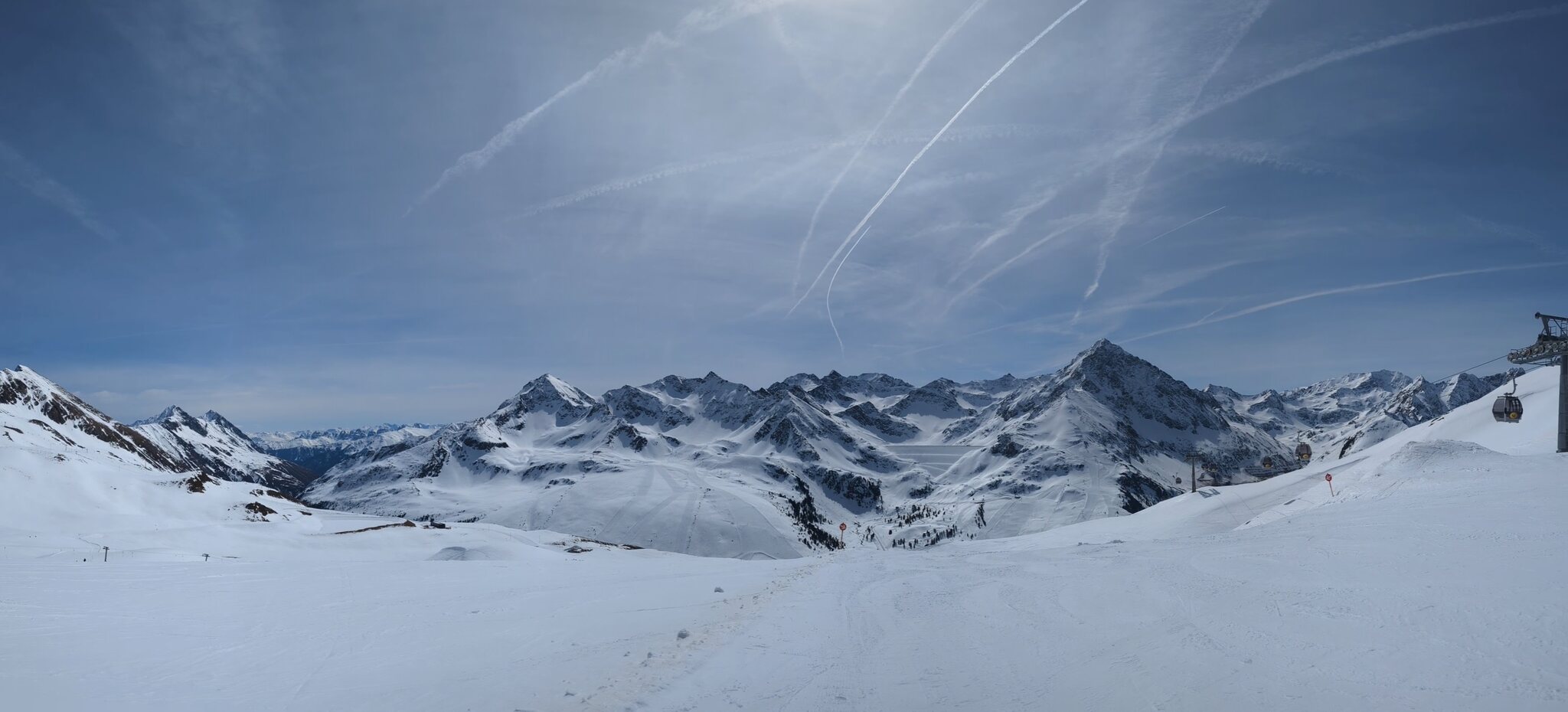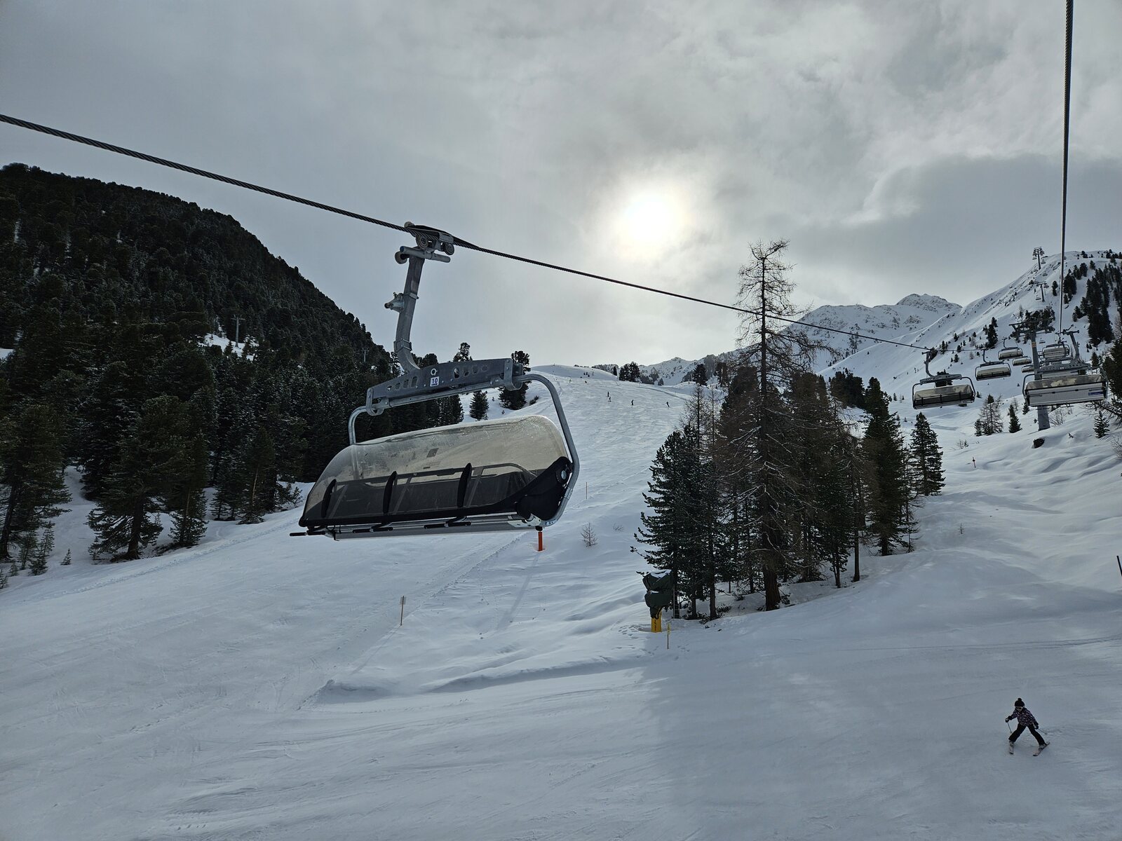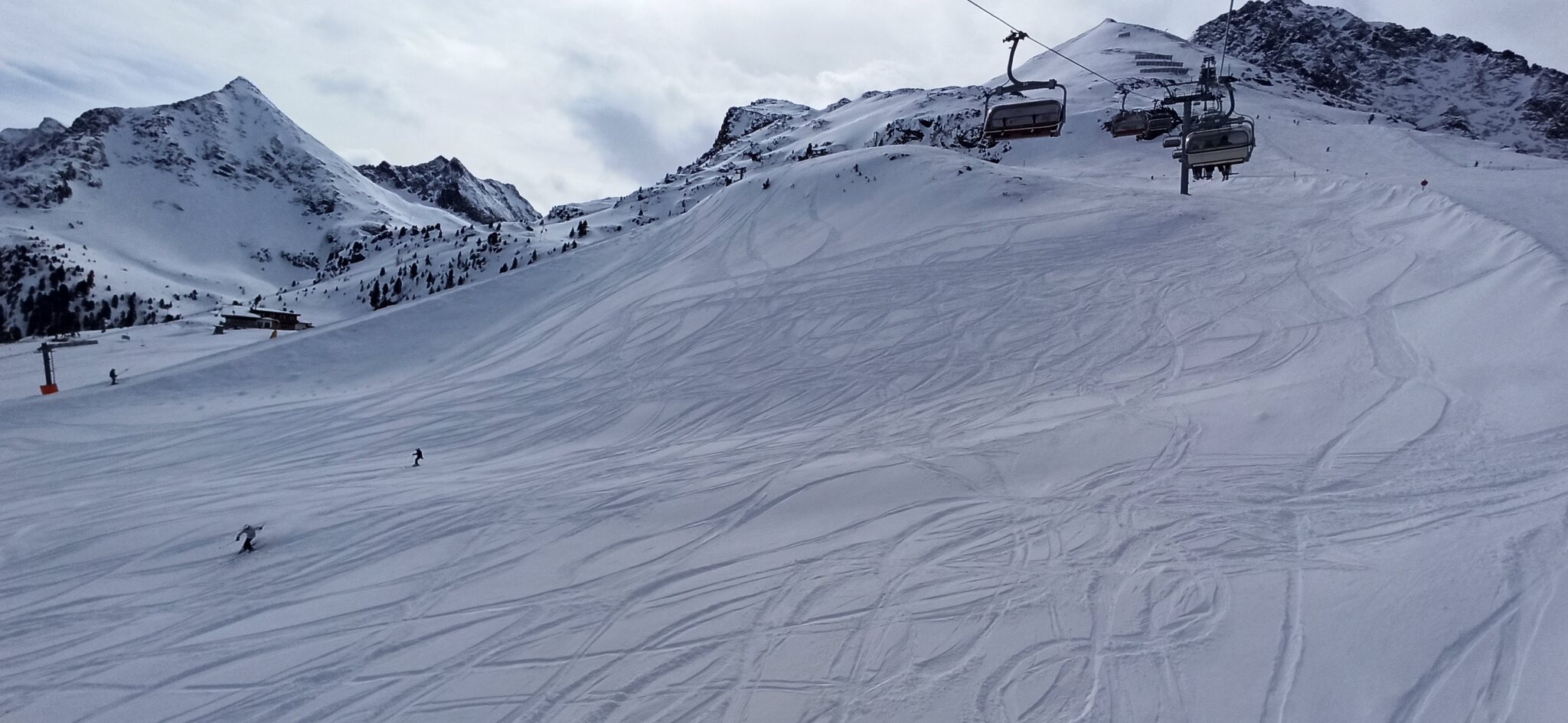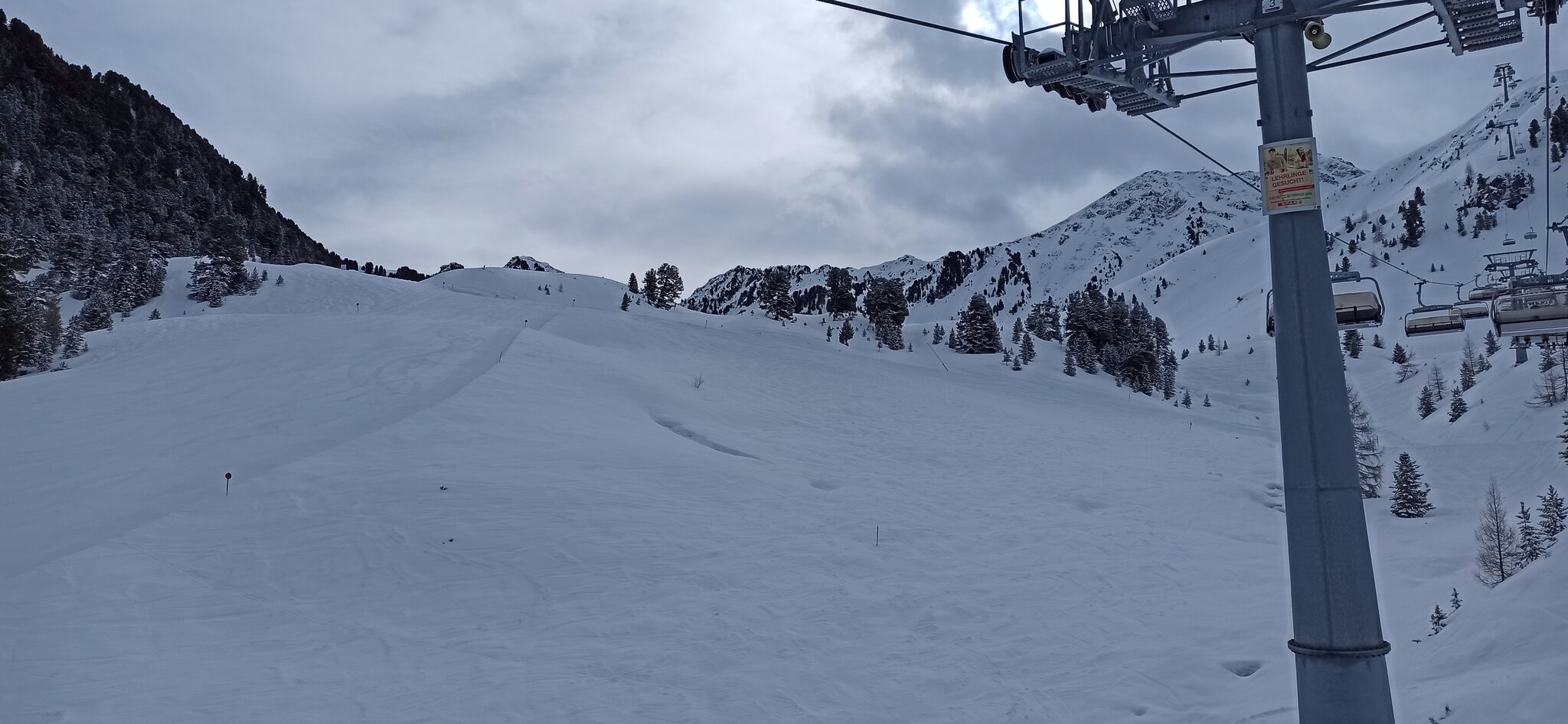 Nach einer Ehrenrunde im hinteren Teil ( war nicht schattig), ging es hoch nach Kühtai. Trotz dem angekündigten Sturm weitgehend Windstill. Nur auf der nördlichen Talseite war etwas Wind spürbar, aber alle Bahnen liefen ohne Probleme.