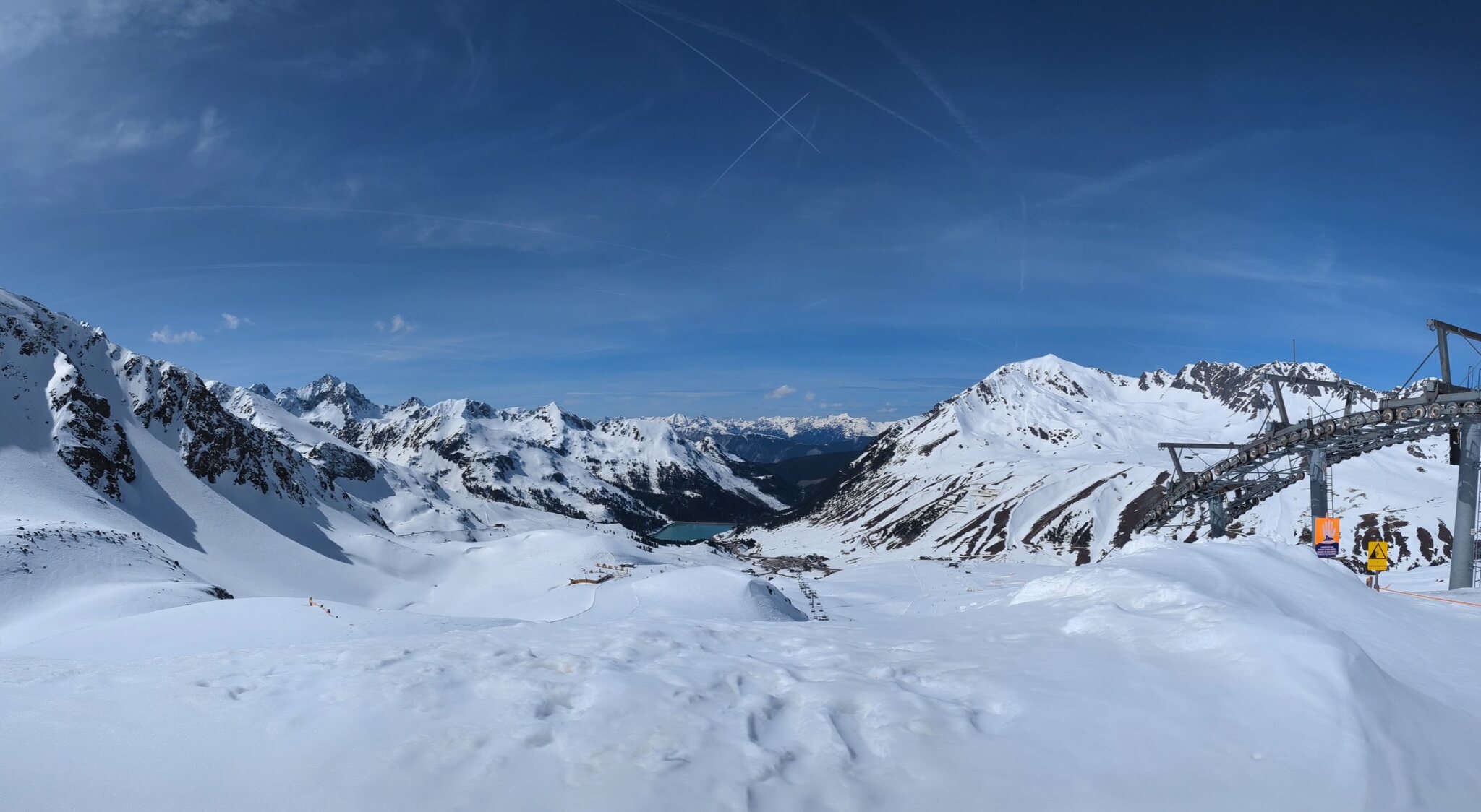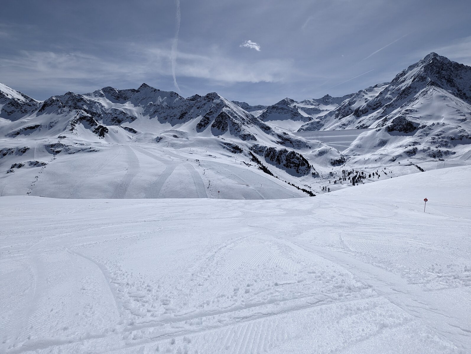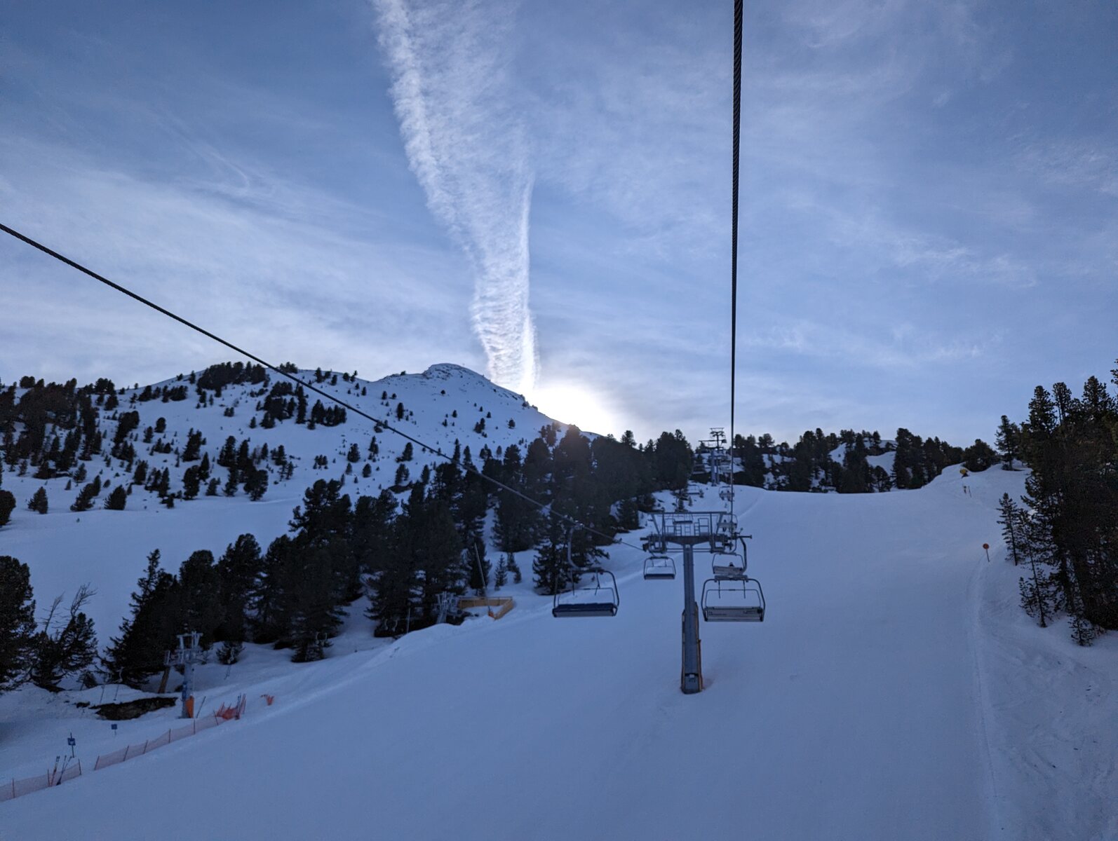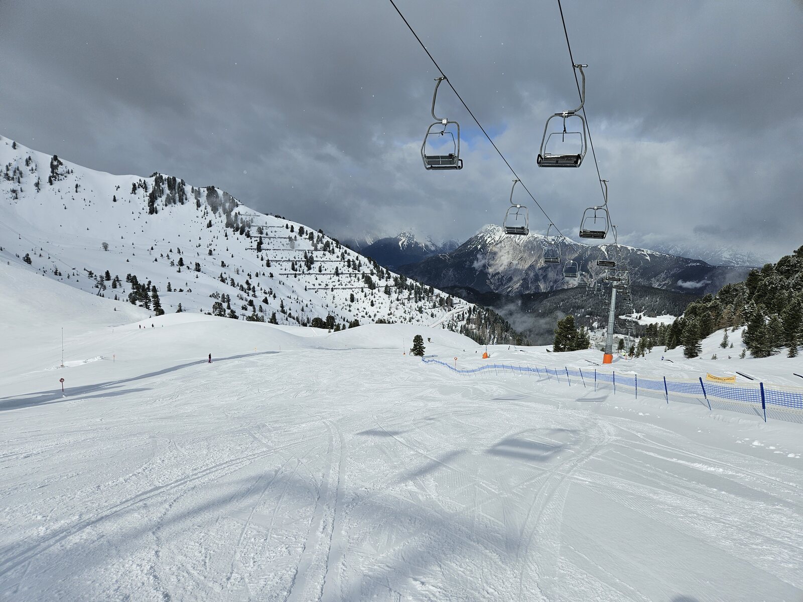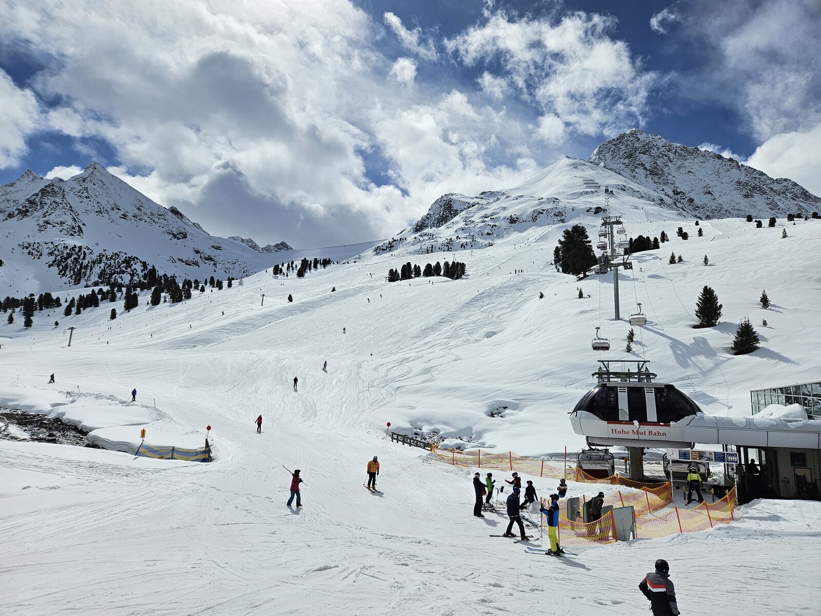 Nach einer Ehrenrunde im hinteren Teil ( war nicht schattig), ging es hoch nach Kühtai. Trotz dem angekündigten Sturm weitgehend Windstill. Nur auf der nördlichen Talseite war etwas Wind spürbar, aber alle Bahnen liefen ohne Probleme.