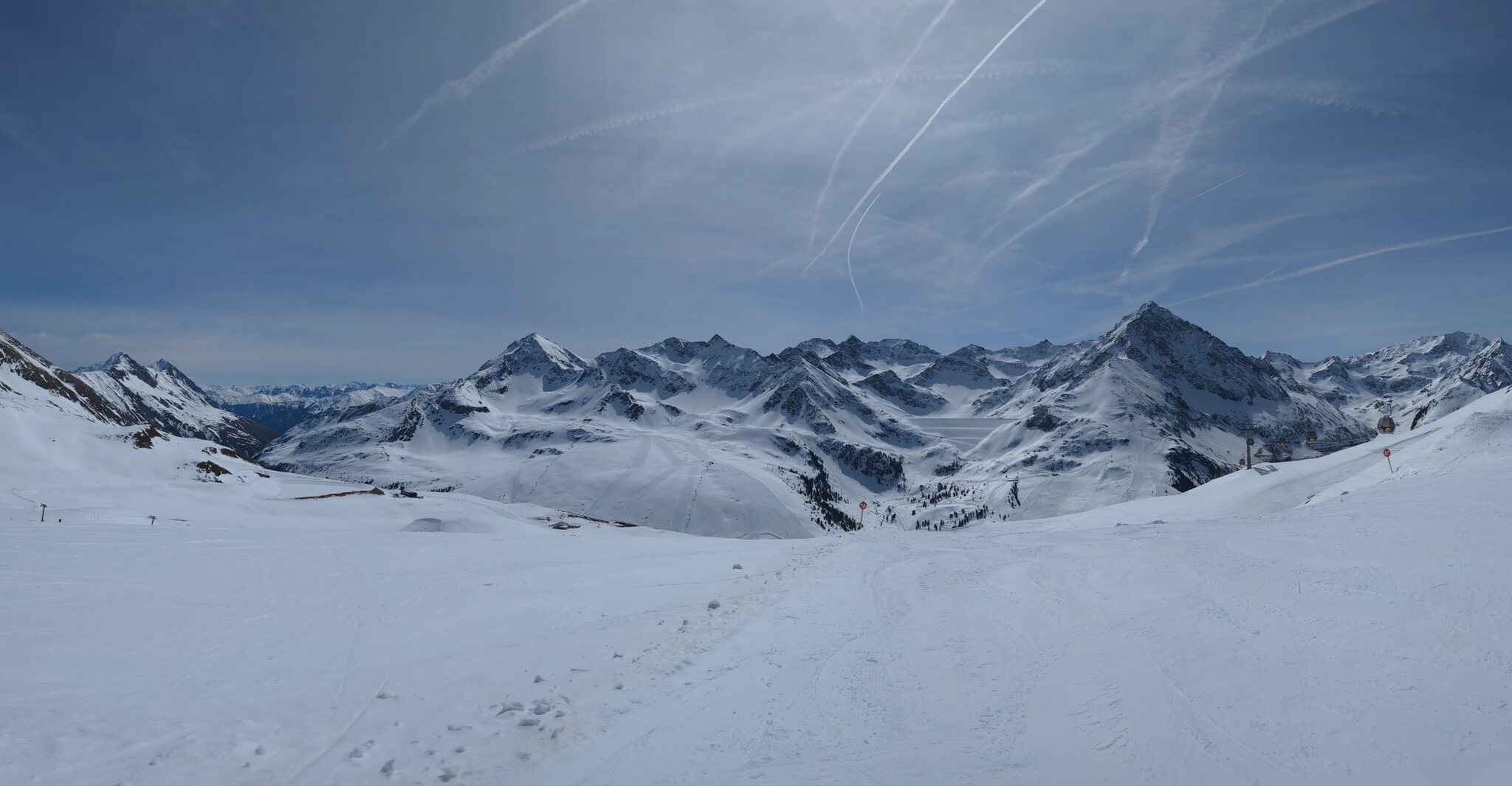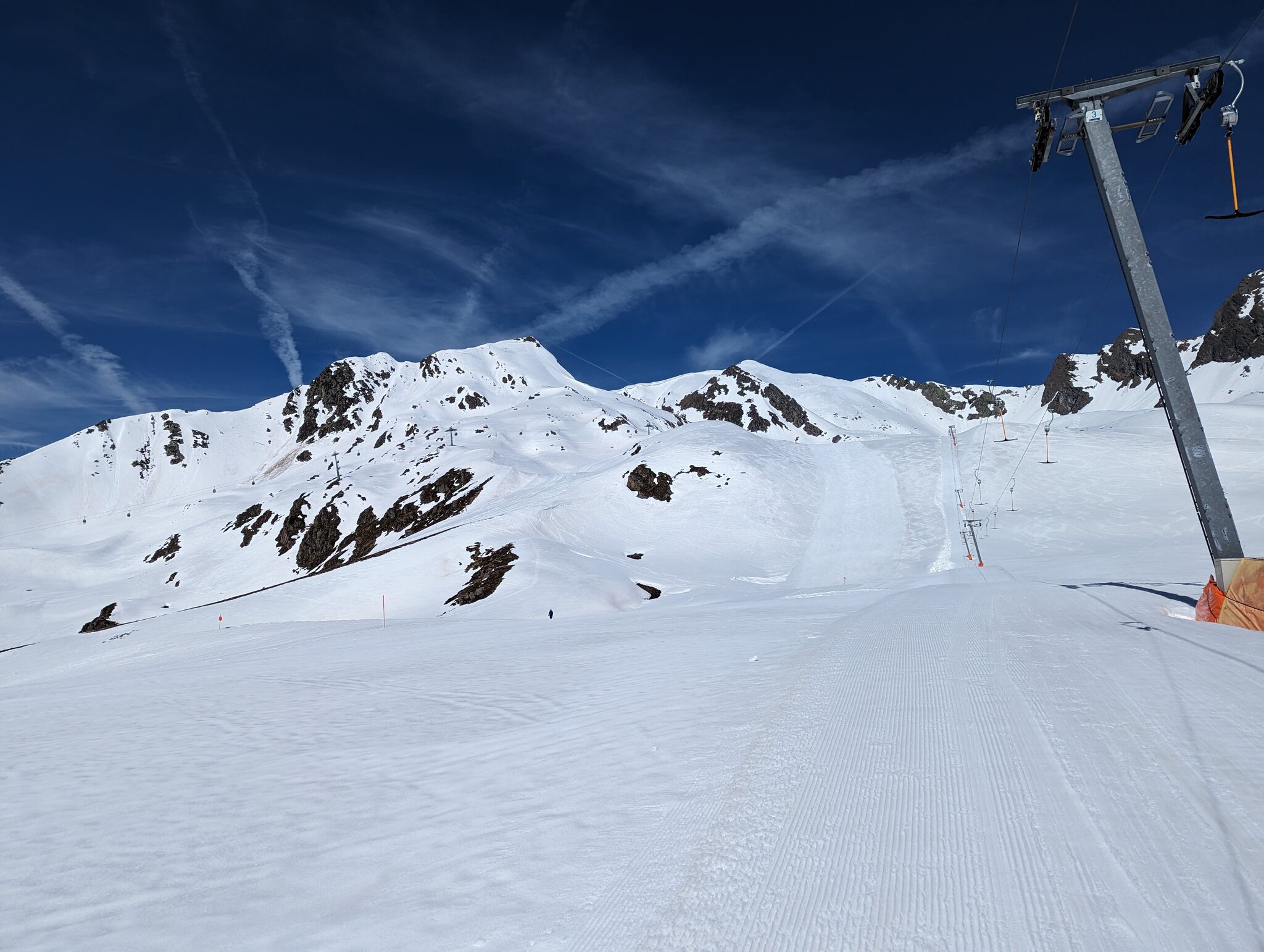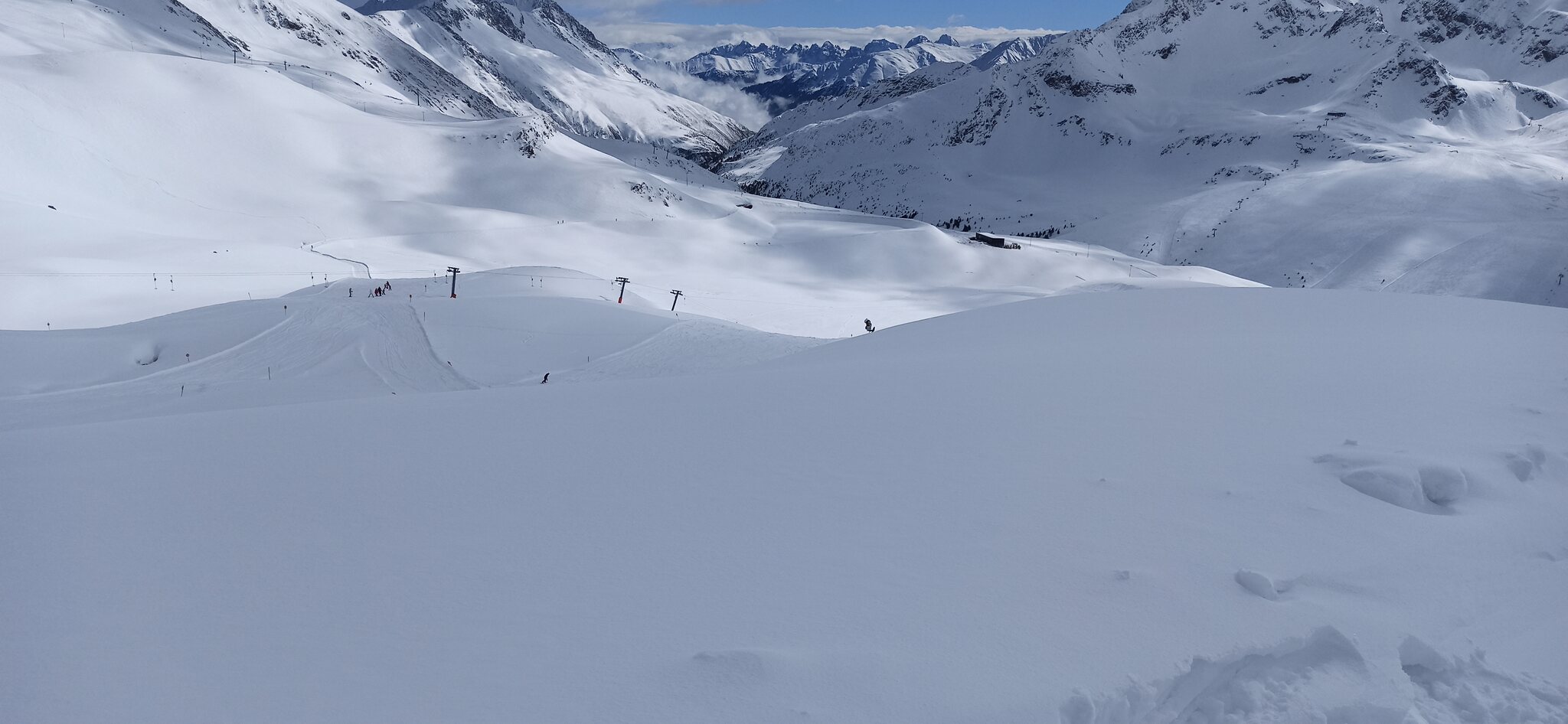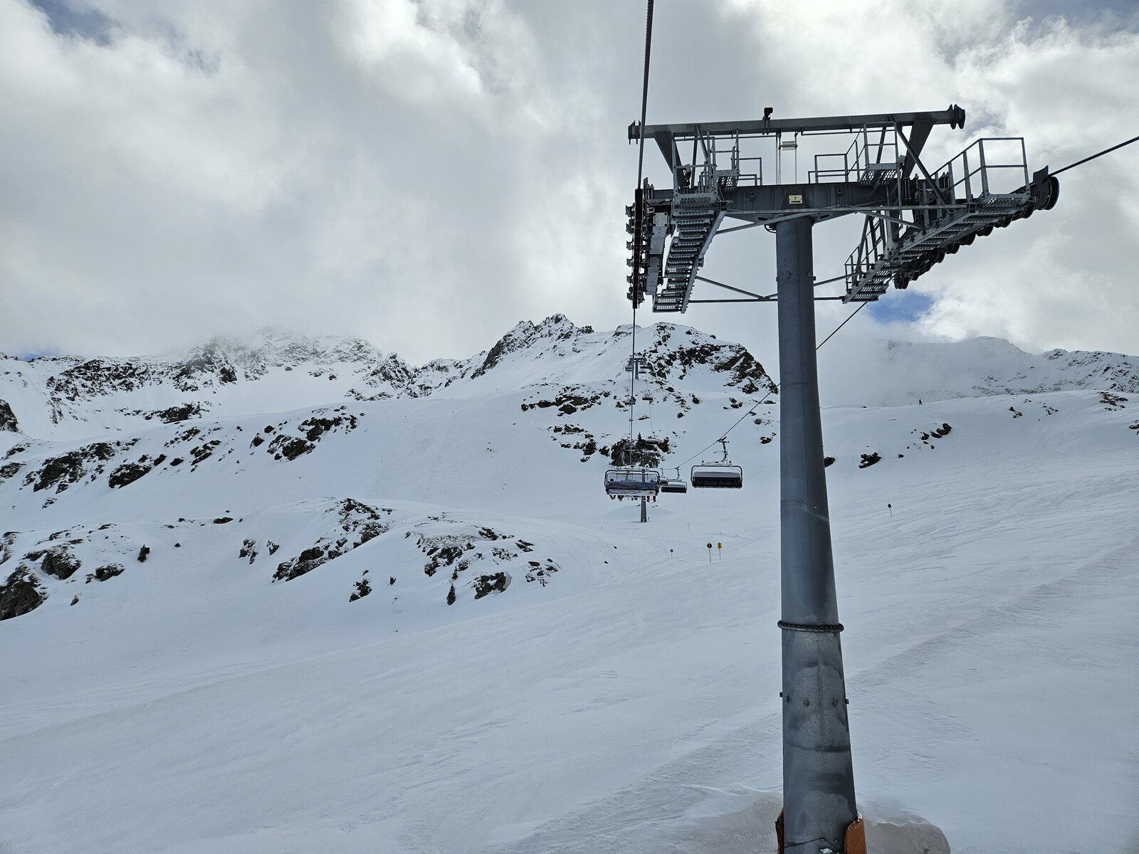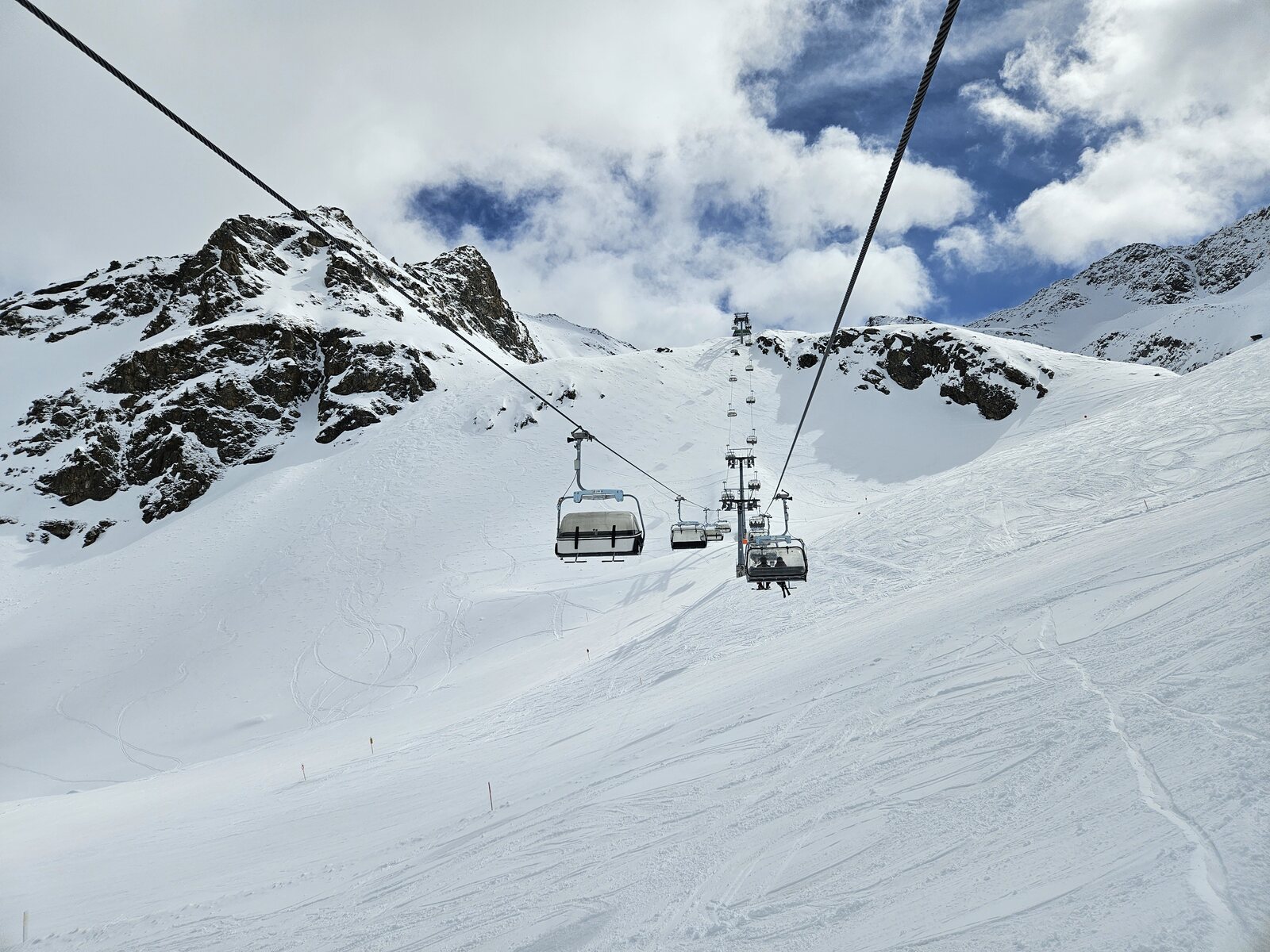Nach einer Ehrenrunde im hinteren Teil ( war nicht schattig), ging es hoch nach Kühtai. Trotz dem angekündigten Sturm weitgehend Windstill. Nur auf der nördlichen Talseite war etwas Wind spürbar, aber alle Bahnen liefen ohne Probleme.