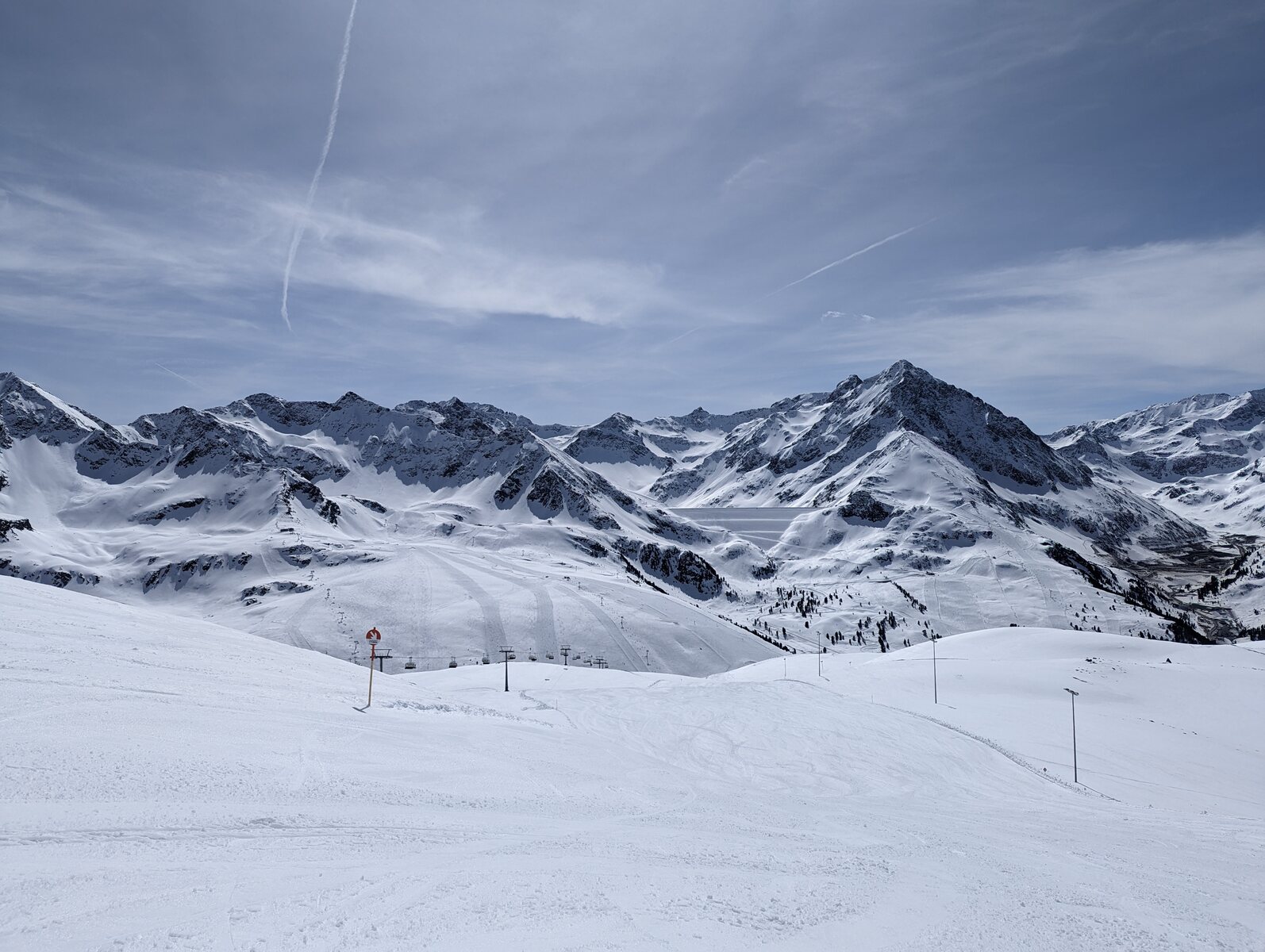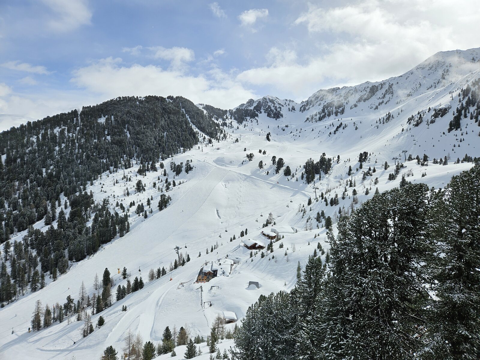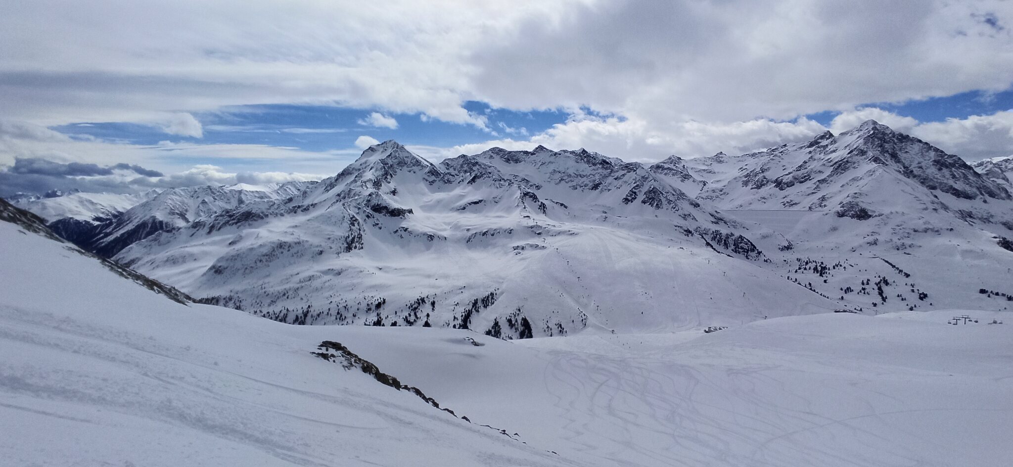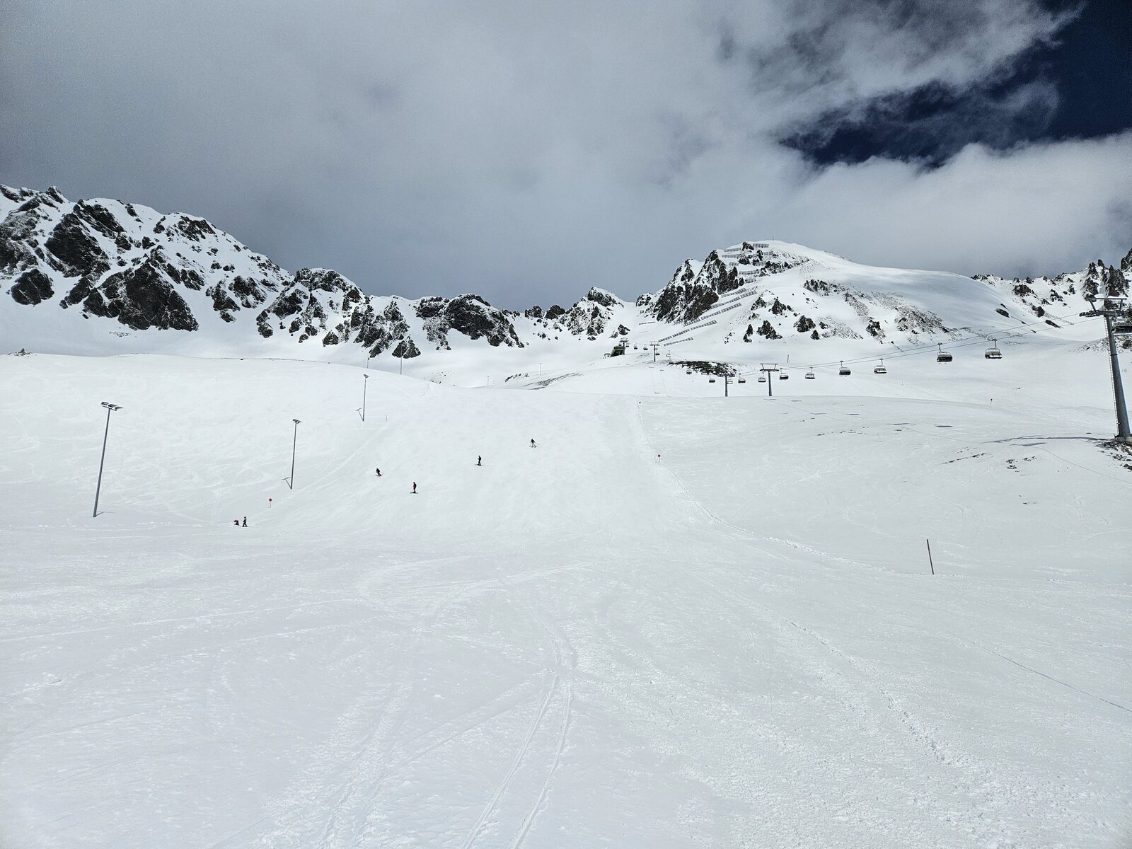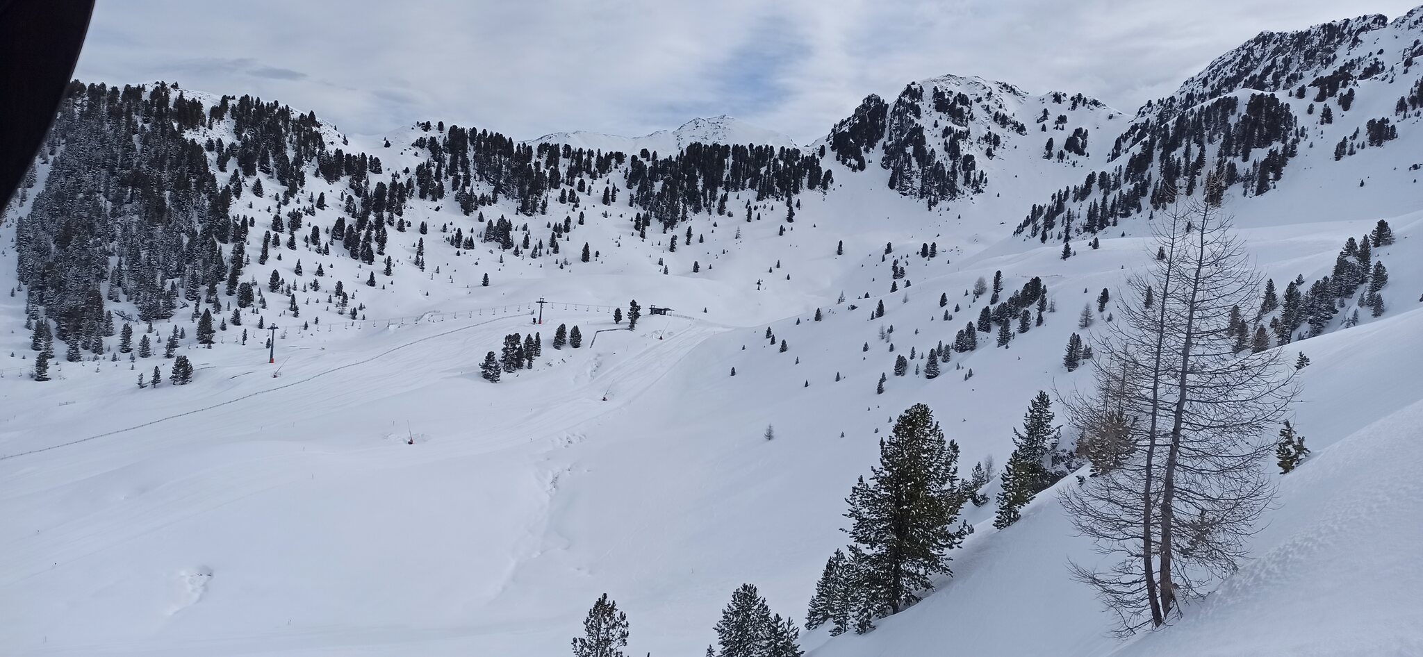 Nach einer Ehrenrunde im hinteren Teil ( war nicht schattig), ging es hoch nach Kühtai. Trotz dem angekündigten Sturm weitgehend Windstill. Nur auf der nördlichen Talseite war etwas Wind spürbar, aber alle Bahnen liefen ohne Probleme.