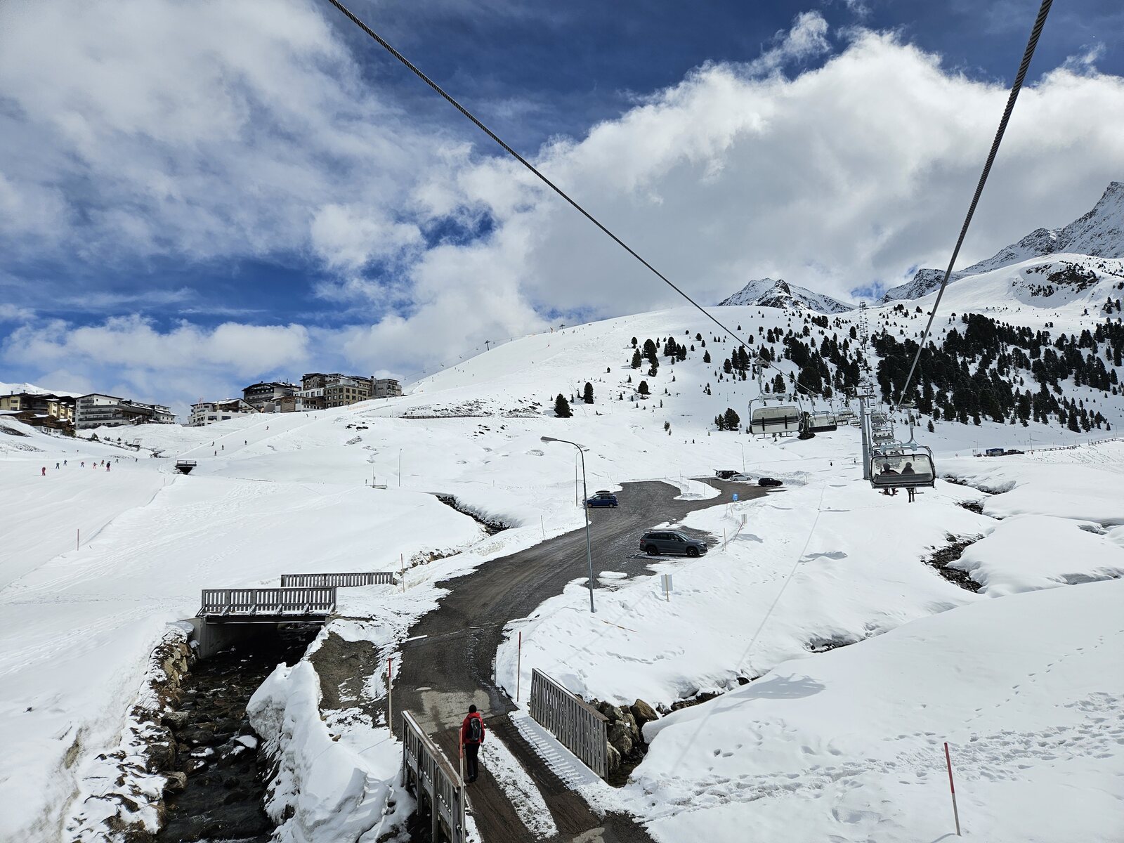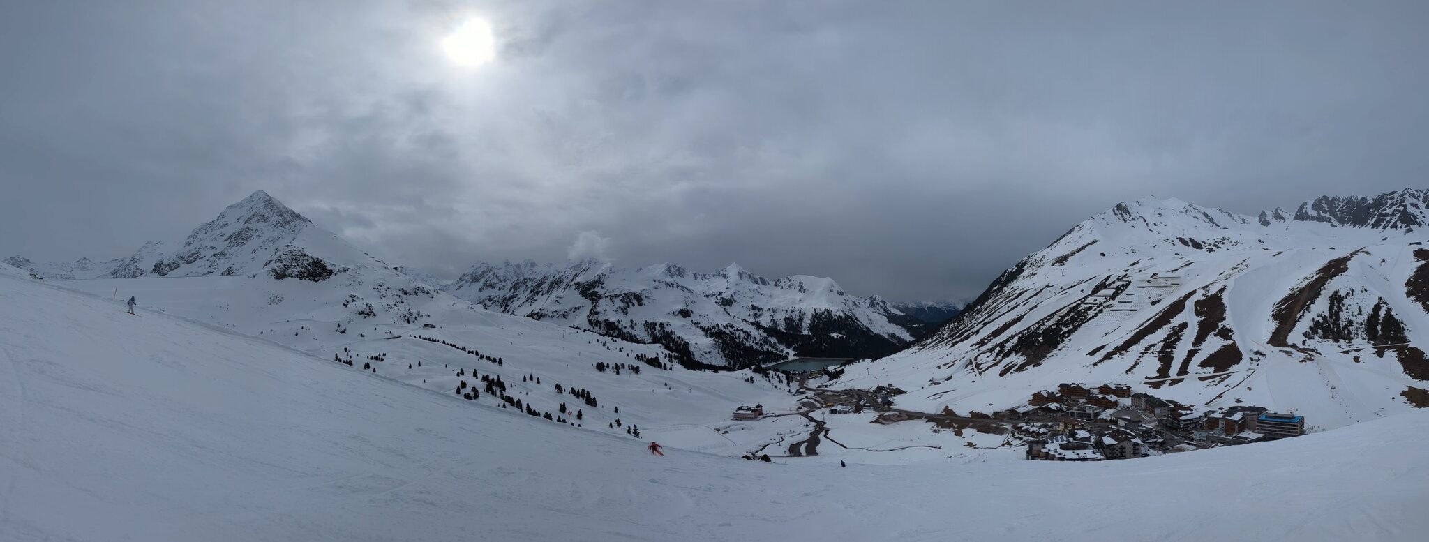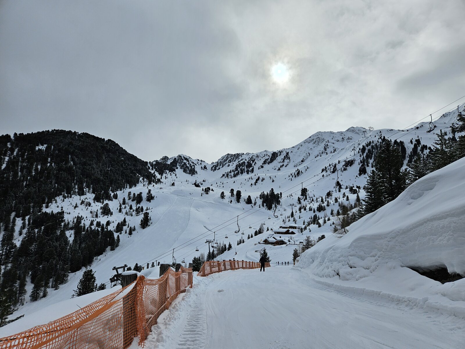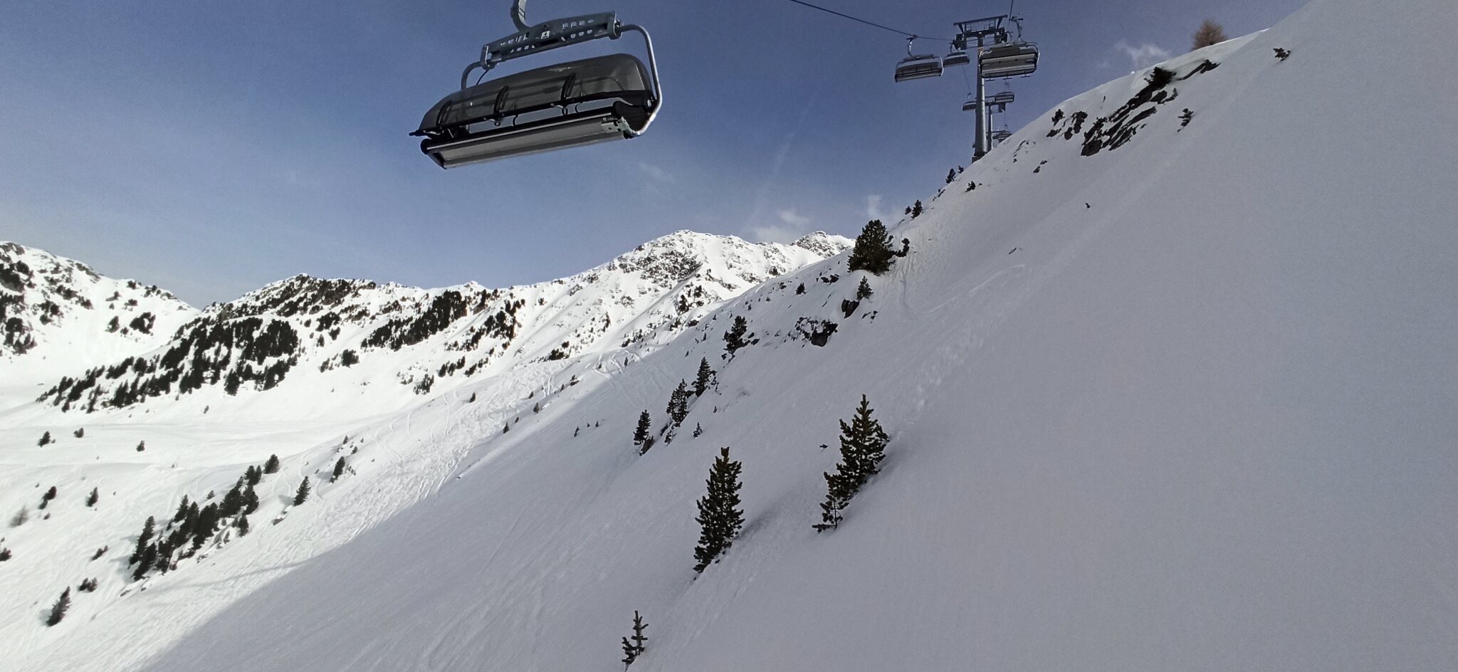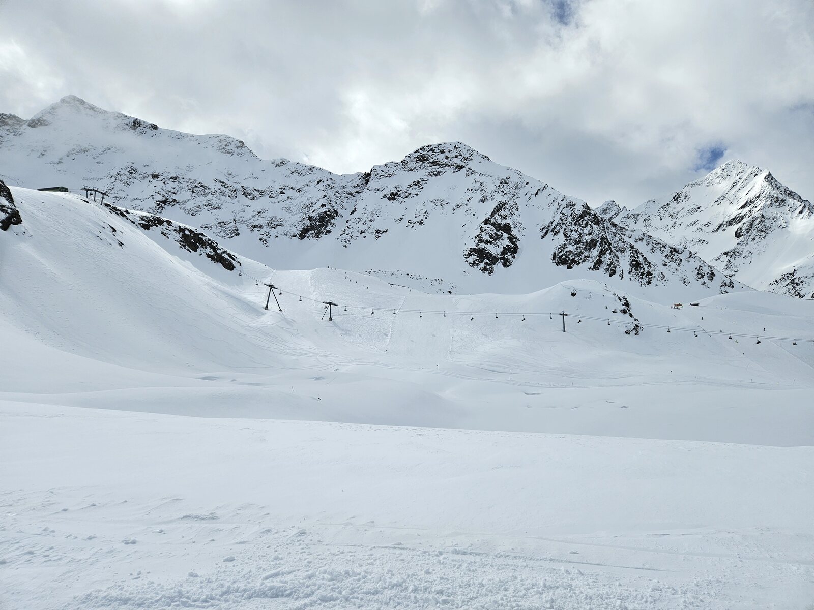 Nach einer Ehrenrunde im hinteren Teil ( war nicht schattig), ging es hoch nach Kühtai. Trotz dem angekündigten Sturm weitgehend Windstill. Nur auf der nördlichen Talseite war etwas Wind spürbar, aber alle Bahnen liefen ohne Probleme.