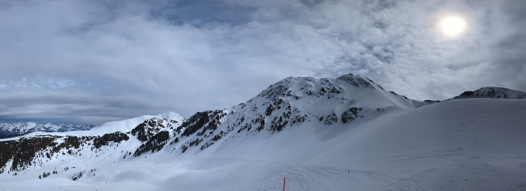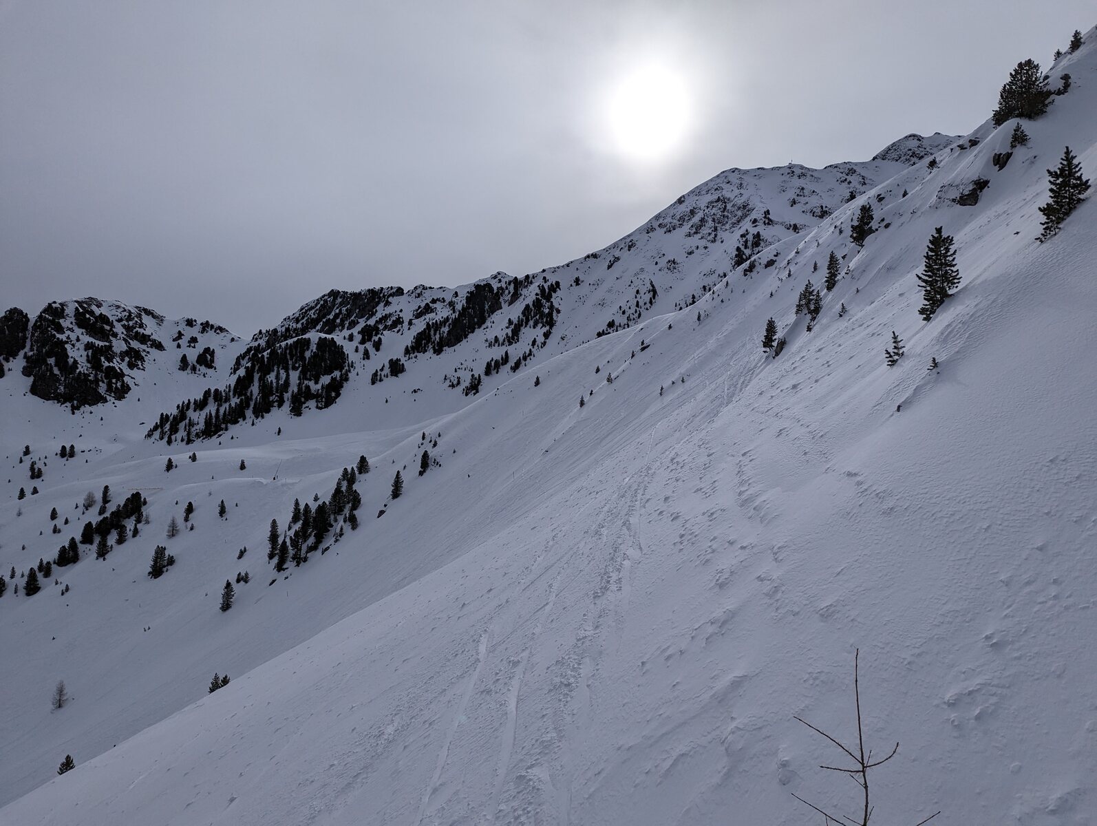 Heute ein bewölkter Tag, mal kurze Flocken, mit aber immer guter Bodensicht und etwas Sonne. Durch die Bewölkung nicht zu warm.