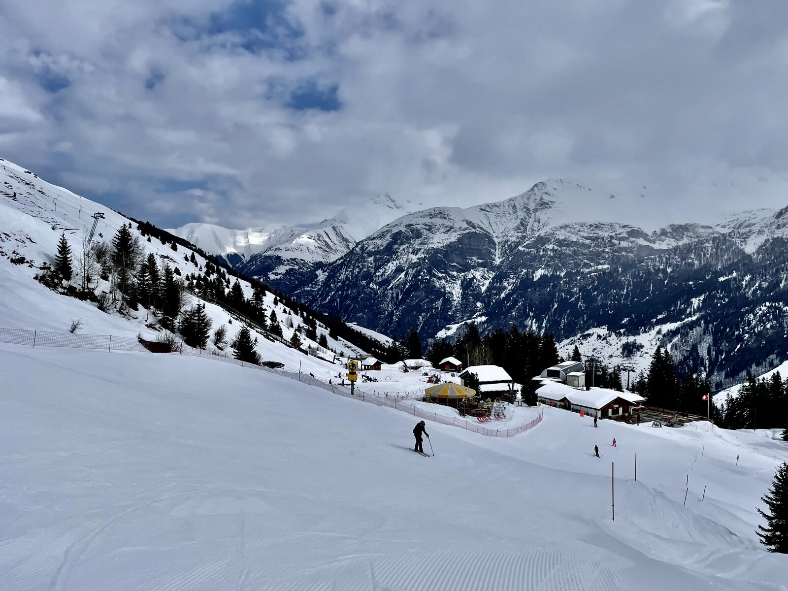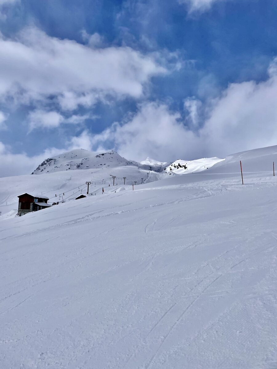 ^Gadastatt mit kurzem Tellerlift, Übungsgelände, Schneekanonen, Schneebar und Restaurant. Hier zu unterst auf 1'800 müM war die Schneequalität ein wenig härter, ansonsten perfekter pulver-hart Schnee.