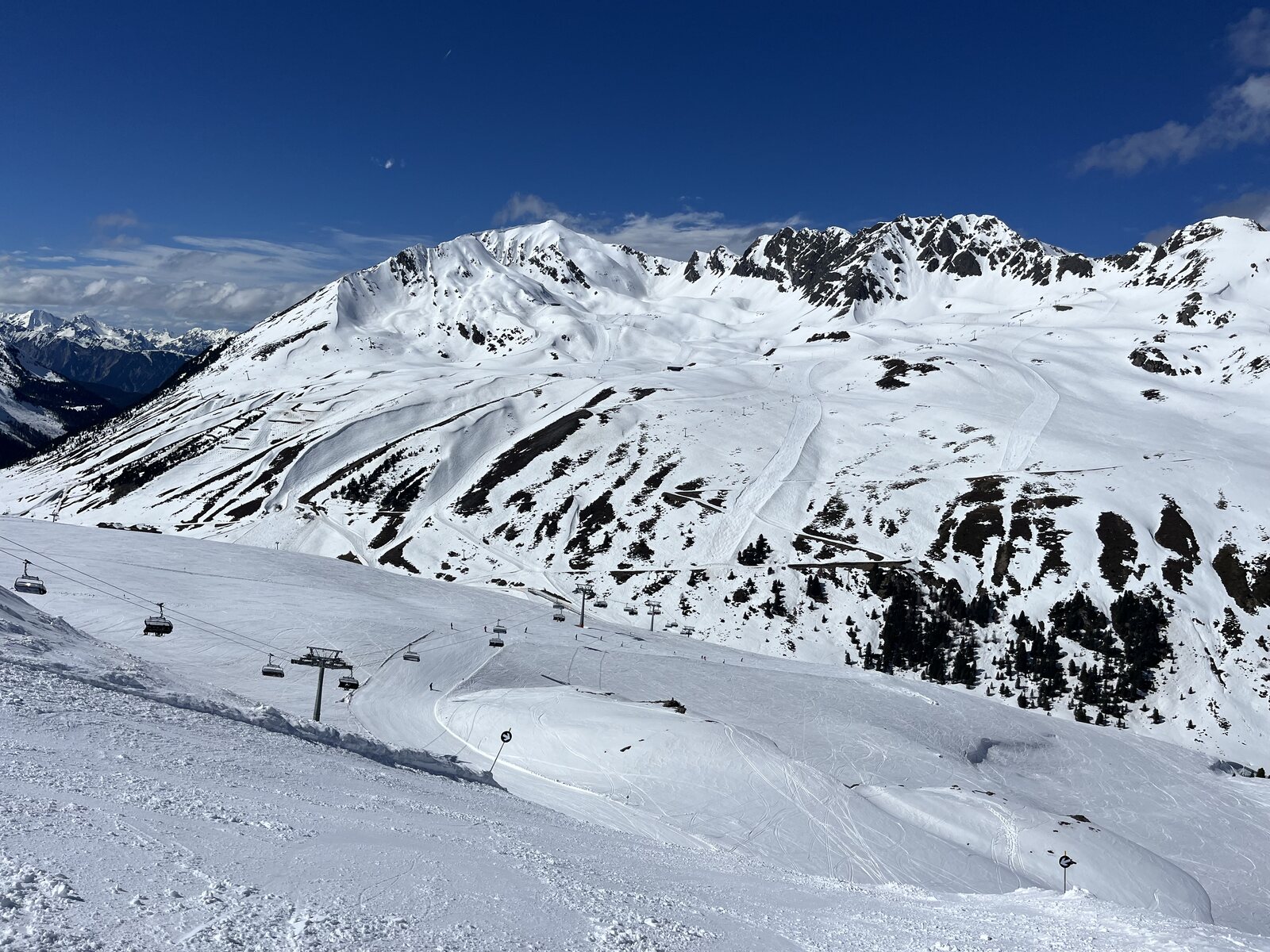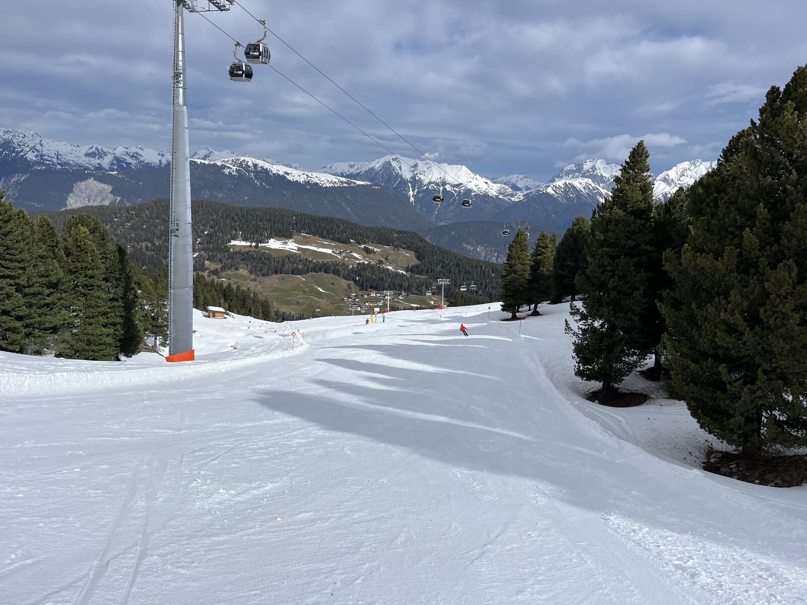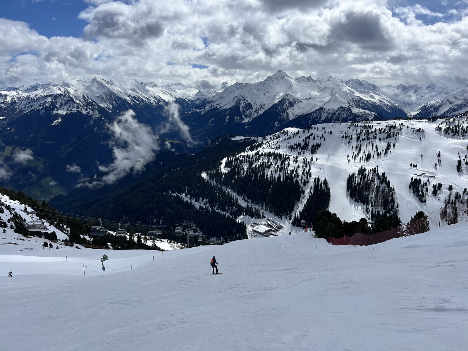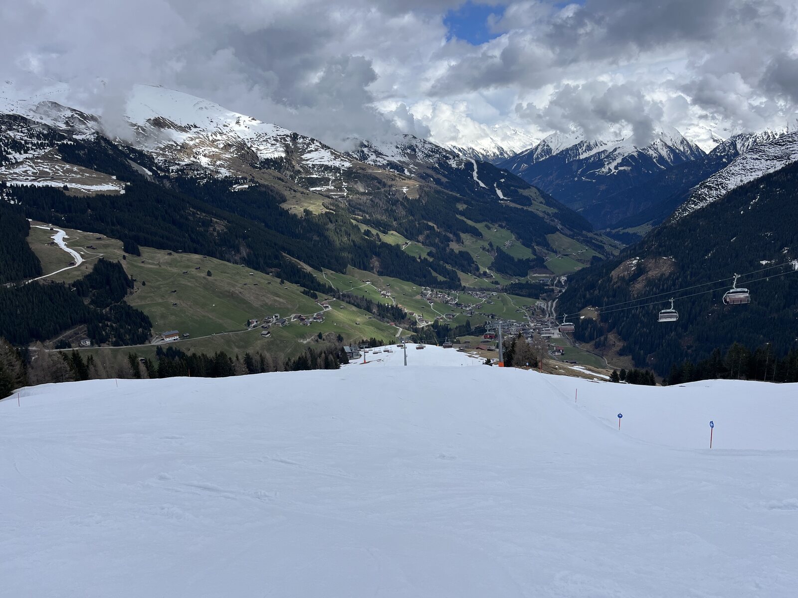 Wir starten kurz vor 9 Uhr mit der Rastkogelbahn. Die SFG lag letzte Nacht knapp oberhalb Lanersbach, es sieht schon fast etwas winterlich aus. Auf der Piste zum Lämmerbichl - @Stäntn: an diesem Lift wärst Du durchgedreht, keine 3 m/s - liegt ganz wenig Neuschnee auf sonst sehr harter Piste. Die ersten Aufhellungen kommen bald. Am Horberg und Wanglspitz liegt schöner Pulver. Hier oben waren wir mit Bike und Wanderschuhen im Sommer! Panoramabfahrt. Sehr schön. Die Harakiri ist offen, keiner fährt sie. Ist sie überhaupt offen? Doch, mit uns kommen die ersten. Sie ist hart, teilweise etwas eisig. Am 3.4.18 fuhr ski-chrigel junior hier das erste Mal runter und war mächtig stolz. Sechs Jahr später kann er es noch immer