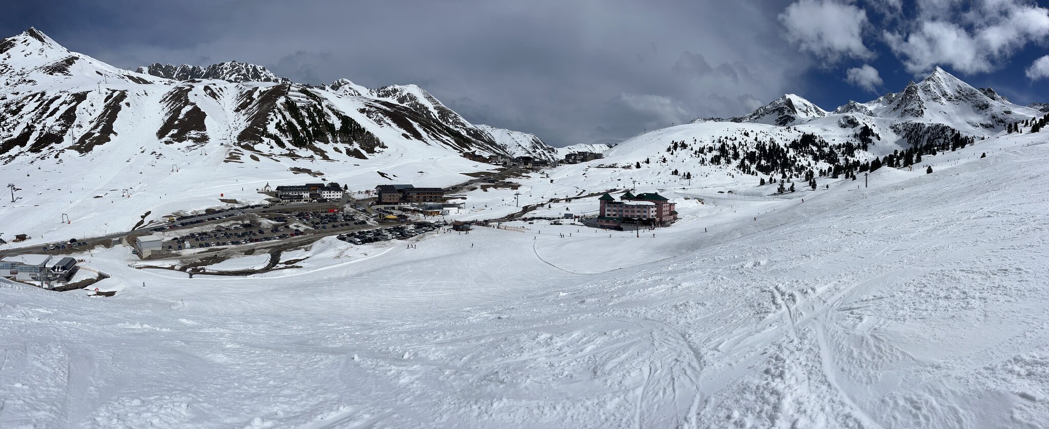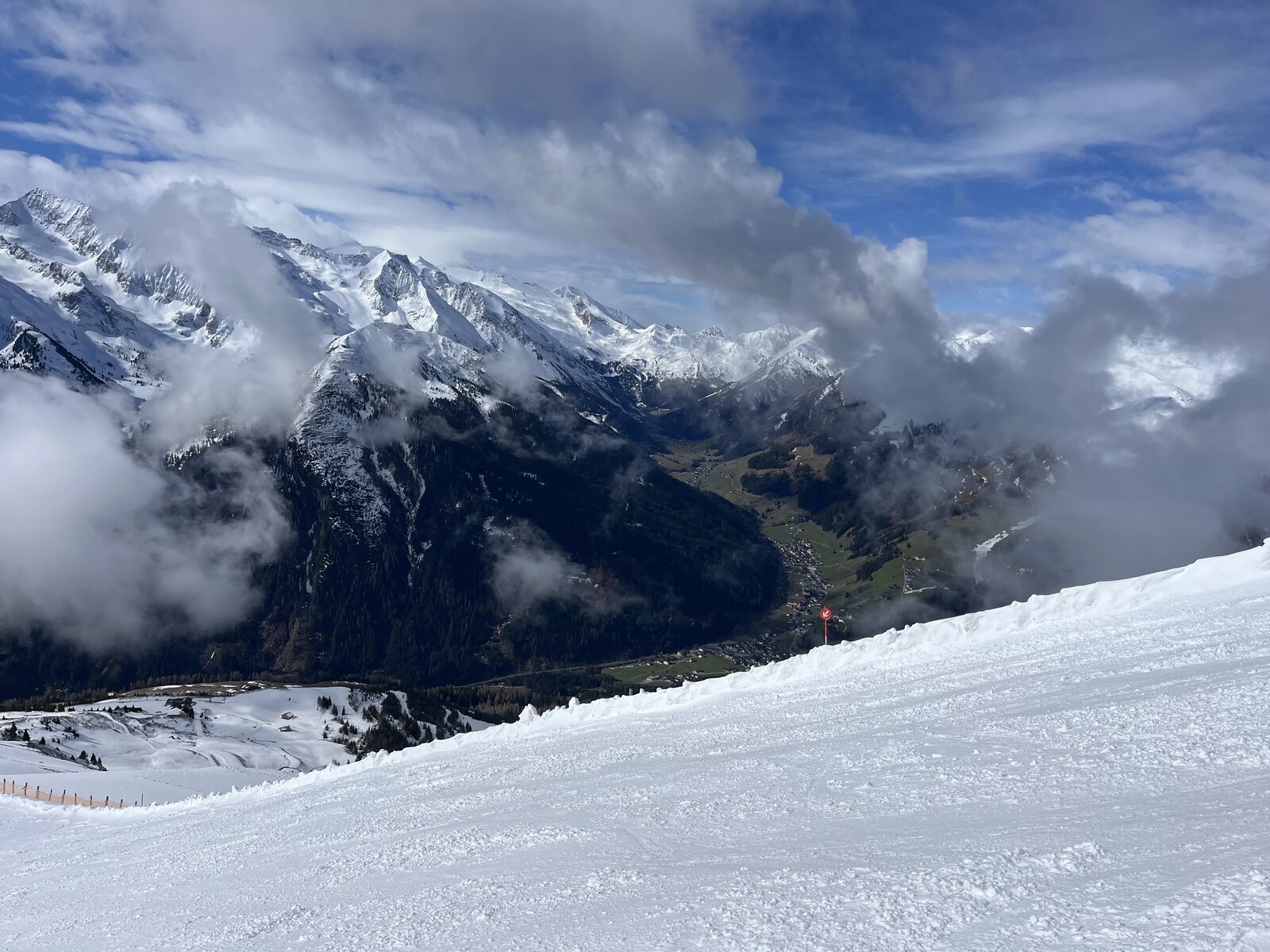Wie schon letztes Jahr wählten wir auf der Anreise am Ostersonntag ein anderes Skigebiet und nicht zuletzt aus Kostengründen auch ein anderes Hotel. Wir liessen es aber bis heute früh offen, wo wir hinfahren und übernachten würden. Lediglich angedacht waren aufgrund der stetig hohen Temperaturen Sonntag und Montag zwei verschiedene Gletscherskigebiete. Doch als sich abzeichnete, dass eine heftige Föhnlage entstehen würde, war schnell mal klar, dass wir in der Auswahl eingeschränkt sein würden und uns für ein föhnresistentes Skigebiet entscheiden müssen. Und um es vorwegzunehmen: Wir hatten richtig entschieden. Viele Skigebiete waren heute komplett oder grossteils geschlossen, bei uns aber herrschte Vollbetrieb.