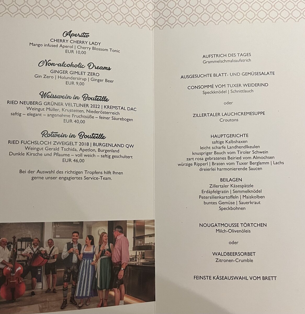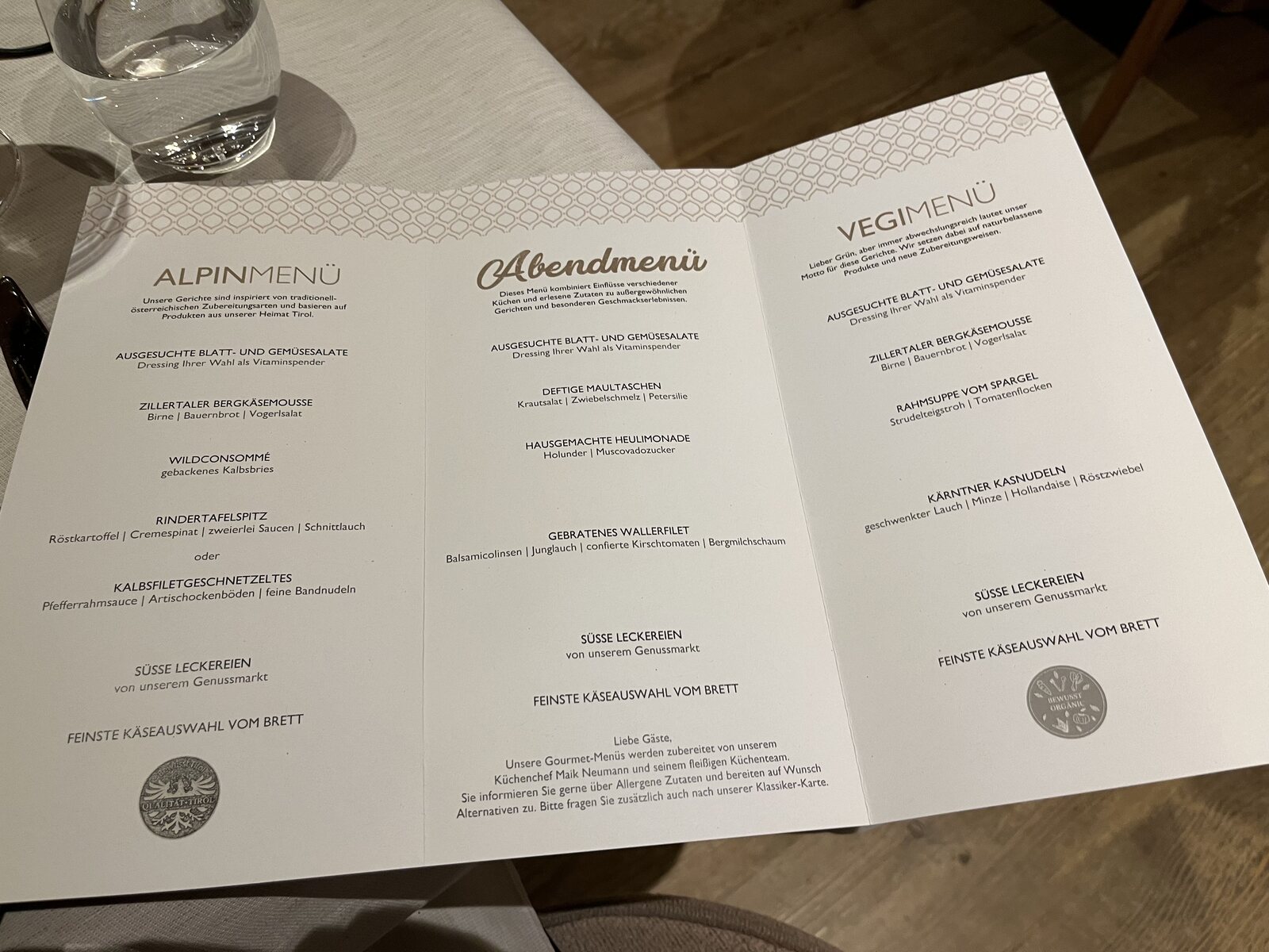Nach dem Essen ging es Wellnessen. Selbstredend, dass wir die Aufgüsse „Tirol“ um 16.45 und „Vitamin“ um 17.30 Uhr mitmachten. Um 19.30 Uhr setzten wir uns wie üblich zum Apéro an die Bar. Mittlerweile bin ich als Negroni-Liebhaber hier bekannt und werde täglich mit einer anderen Version beglückt.