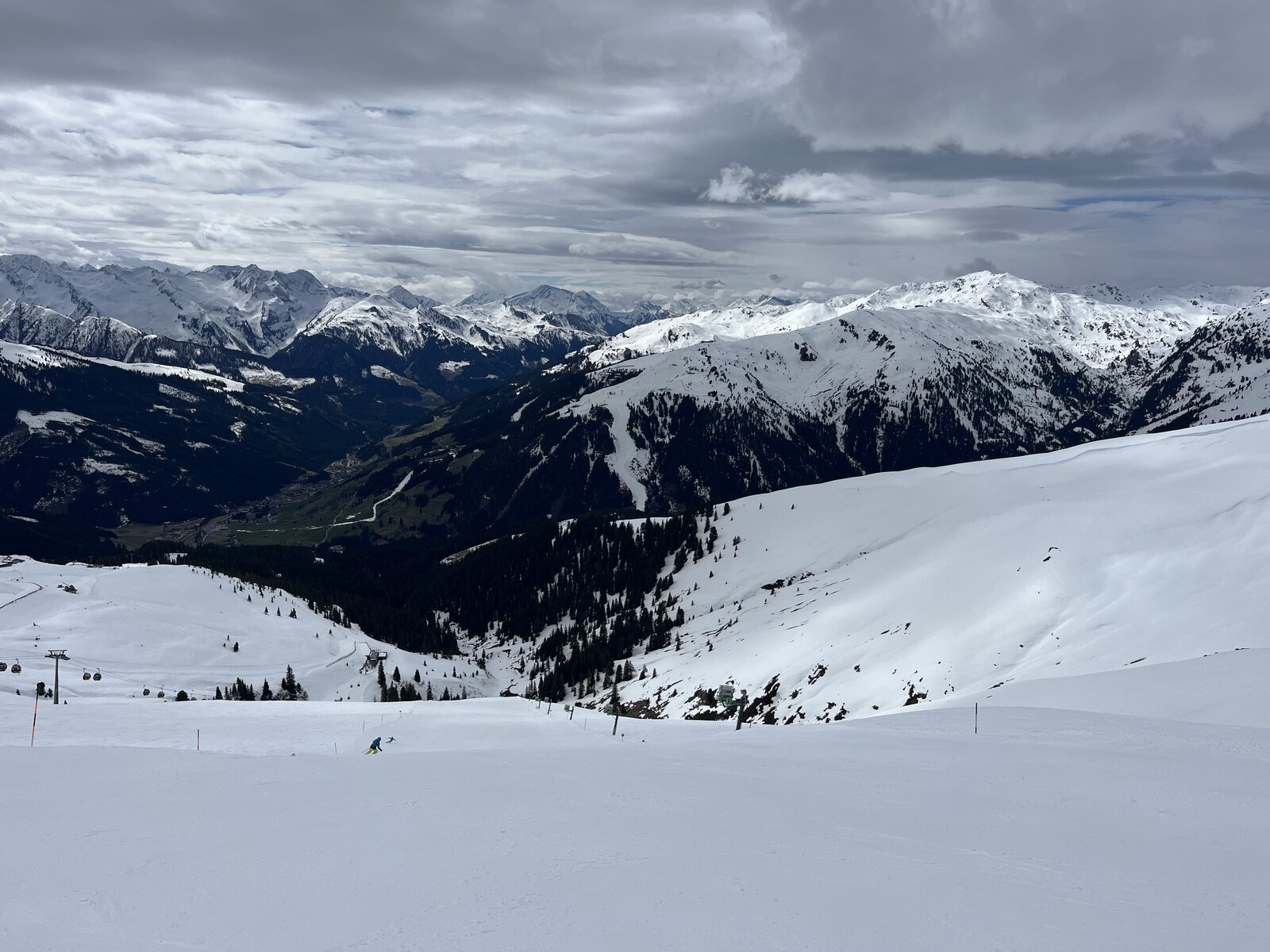 Zu Beginn ist es noch bewölkt. Den Rastkogel haben wir aber komplett für uns alleine. Und schon bald kommt die Sonne. Es dauert recht lang, bis die Massen aus Meyerhofen hier einfallen. Die Panoramabfahrt wird ihrem Namen gerecht. Ultraweich ist die Piste zur Finkenberger Mittelstation, aber noch recht wenig verspurt. Auf diesem Bild kann man die Steilheit der Harakiri endlich mal gut erkennen
