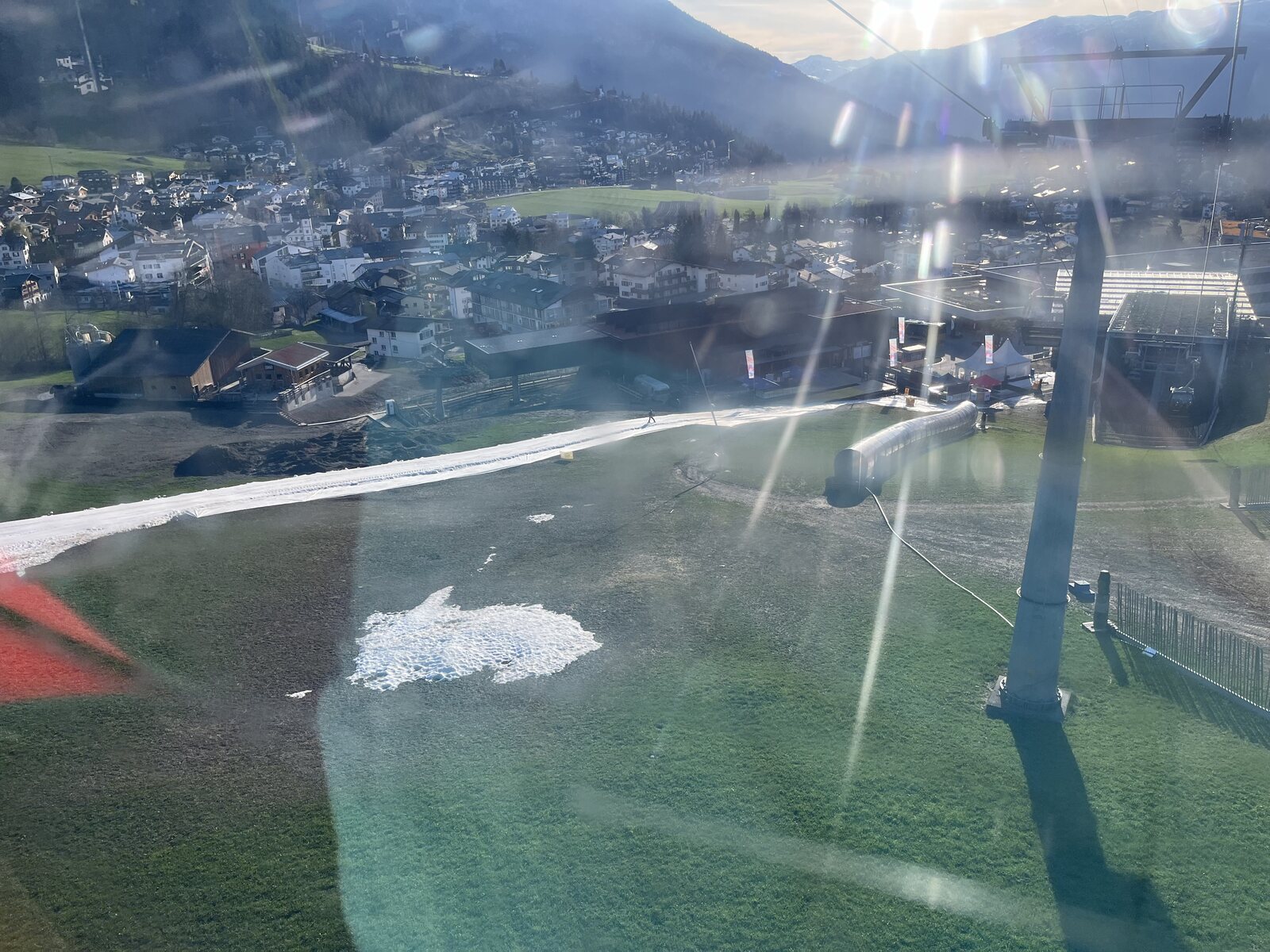 Aber das Pistenteam gibt alles für die Talabfahrt: Die Pistenpfosten wurden entfernt, um da noch was zusammenzukratzen. Und die Piste wurde verlängert, damit WackelPudding keine dreckigen Schuhe bekommt