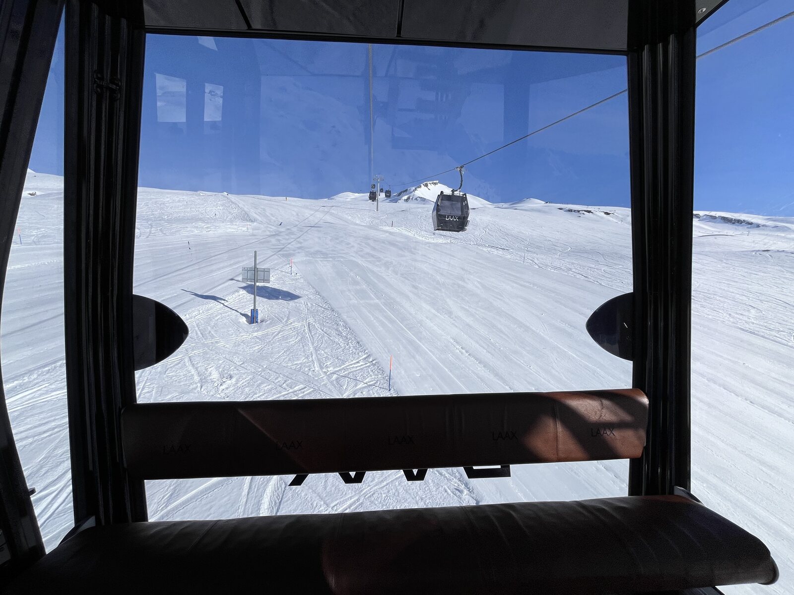 Mittlerweile ist Siala West besser. Da es aufweicht, stört die Präparierung nicht mehr. Und mit der Saunagondel komme ich dank neuer Technik auch klar: Beim kurzen Anstehen Helm und Handschuhe in den Rucksack, Jacke in die Ellbogenkehle und im T-Shirt einsteigen. 25° hat es hier drinnen mindestens. Edit 11.45 Uhr: