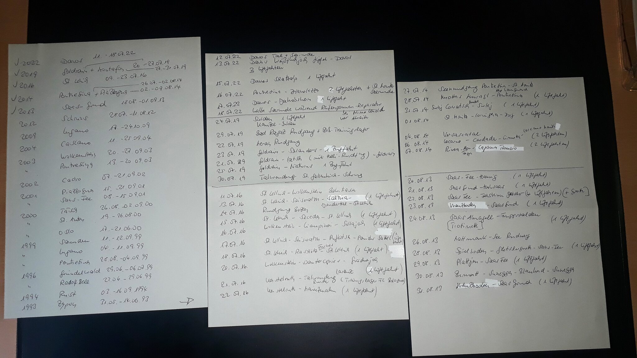 2025/26: 10x Parsenn, Jakobshorn, 8x Madrisa, 4x Andermatt, Sellaronda, Rinerhorn, 3x Arosa Lenzerheide, 2x Frutt, Pany, 1x Zermatt, Stilfser Joch, Landgraaf, Saas-Fee, Hintertux, Pitztaler, Titlis, Sölden, Glacier 3000, Gemsstock, Ostschweiz, Ischgl, Seiser Alm, Hasliberg, Kt. Schwyz, Mörlialp, Axalp, Gadmnen, Sternenberg, Grüsch, Val d'Anniviers, Anzère, Ovronnaz, Marécottes, Ghöch, Marbach, Sörenberg, Jura, Disentis, Fideris, San Bernardino, Splügen, Feldis, St. Antönien, Fribourg, Bergün, Alvaneu, Tenna, Minschuns, Oberengadin, Corvatsch, Malbun, Klewenalp, Belalp, Bürchen, Grächen, Leukerbad, Obersaxen, Laax, Gargellen, Pizol