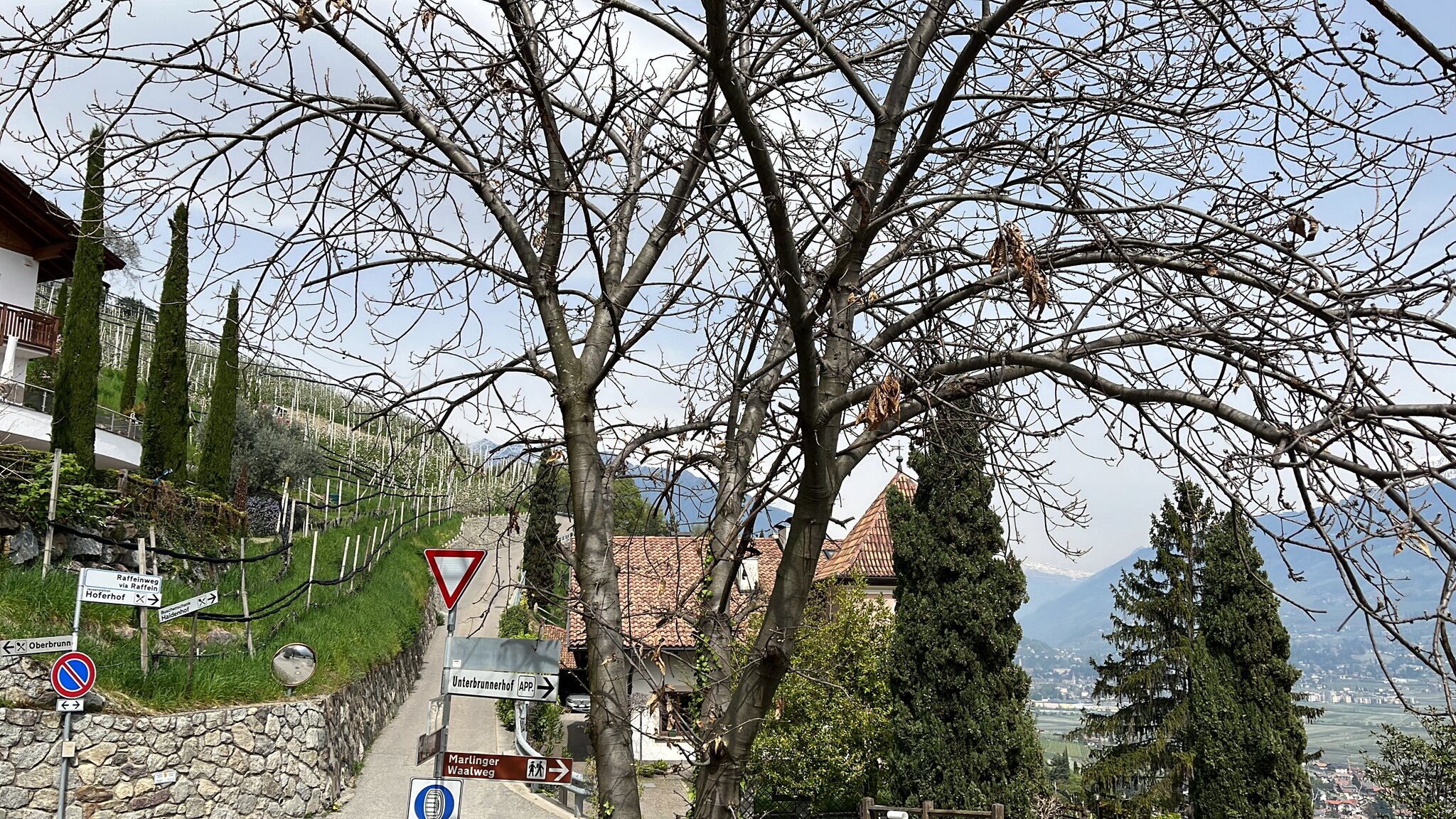 bis zum Abzweig des Merlinger Höhenweg. Und wie sollte es anders sein - auch der war gesperrt. Auf dem ganzen Weg hoch, wo es verschiedene Möglichkeiten gab Richtung Meran zu fahren gab es keinen einzigen Hinweis. Nur hier direkt an der Kreuzung war eine Umleitung ausgeschildert - die ging laut Komoot noch 130 hm auf Asphalt bergauf. Da es uns zu blöd war, einen Teil der hart erkämpften 600 hm wieder zurück zu fahren, sind wir weiter hoch der Umleitung gefolgt. Oben angekommen zumindest ein kleiner Lichtblick - es gab einen kleinen Hof mit einem Brunnen, wo wir Wasser auffüllen konnten. Von dort weiter ging es über einen Wanderweg steil bergab auf S2 - S3 Niveau. Frau hat natürlich geschoben. Zum Glück kamen wir aber bald wieder auf den Marlinger Höhenweg mit schönen Ausblicken auf Meran.