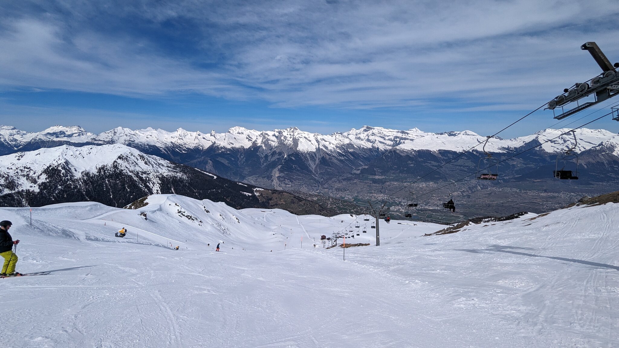 Die Bedingungen waren gut, mit genügend Schnee. Der Schnee ist eher hart, bleibt aber griffig. Auf dem unteren Teil der Piste des Mayens (Veysonnaz) und der Piste de l'Ours ist der Schnee aufgrund der geringen Höhe eher schlecht. Aber im Großen und Ganzen ist es sehr gut. Es gab kaum Wartezeiten an den Anlagen.
