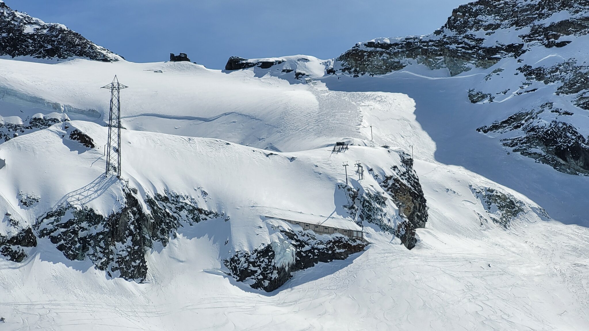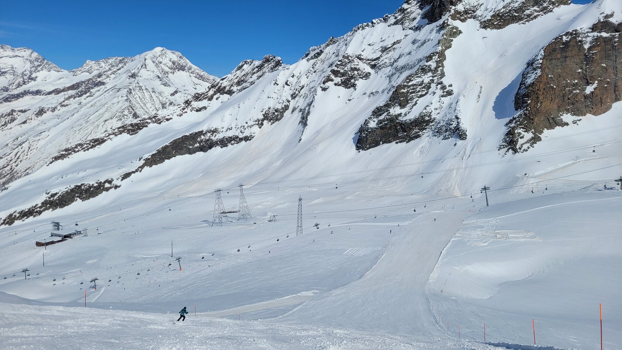 Die Morenia Talabfahrt und die KSB waren geschlossen, und vom Mittelallalin kommt man nur noch bis zum SL Mittaghorn. Das Nadelöhr am Gletscherband wurde auf 1/3 Breite reduziert.